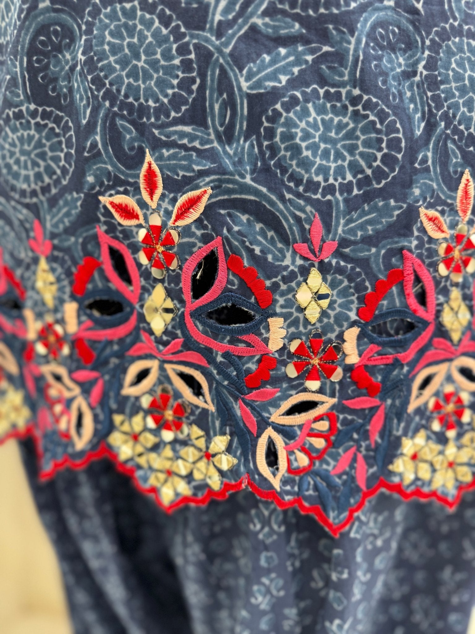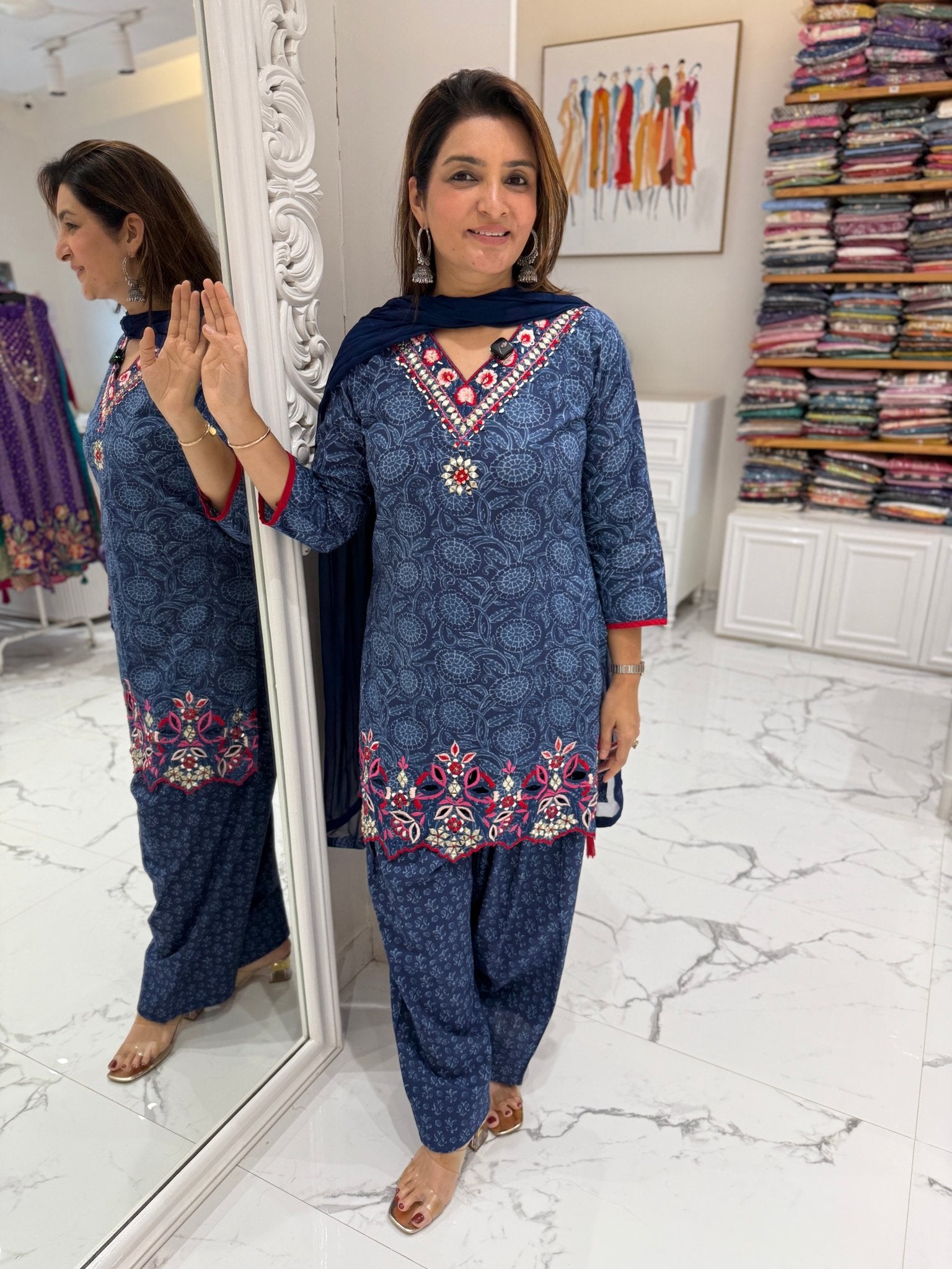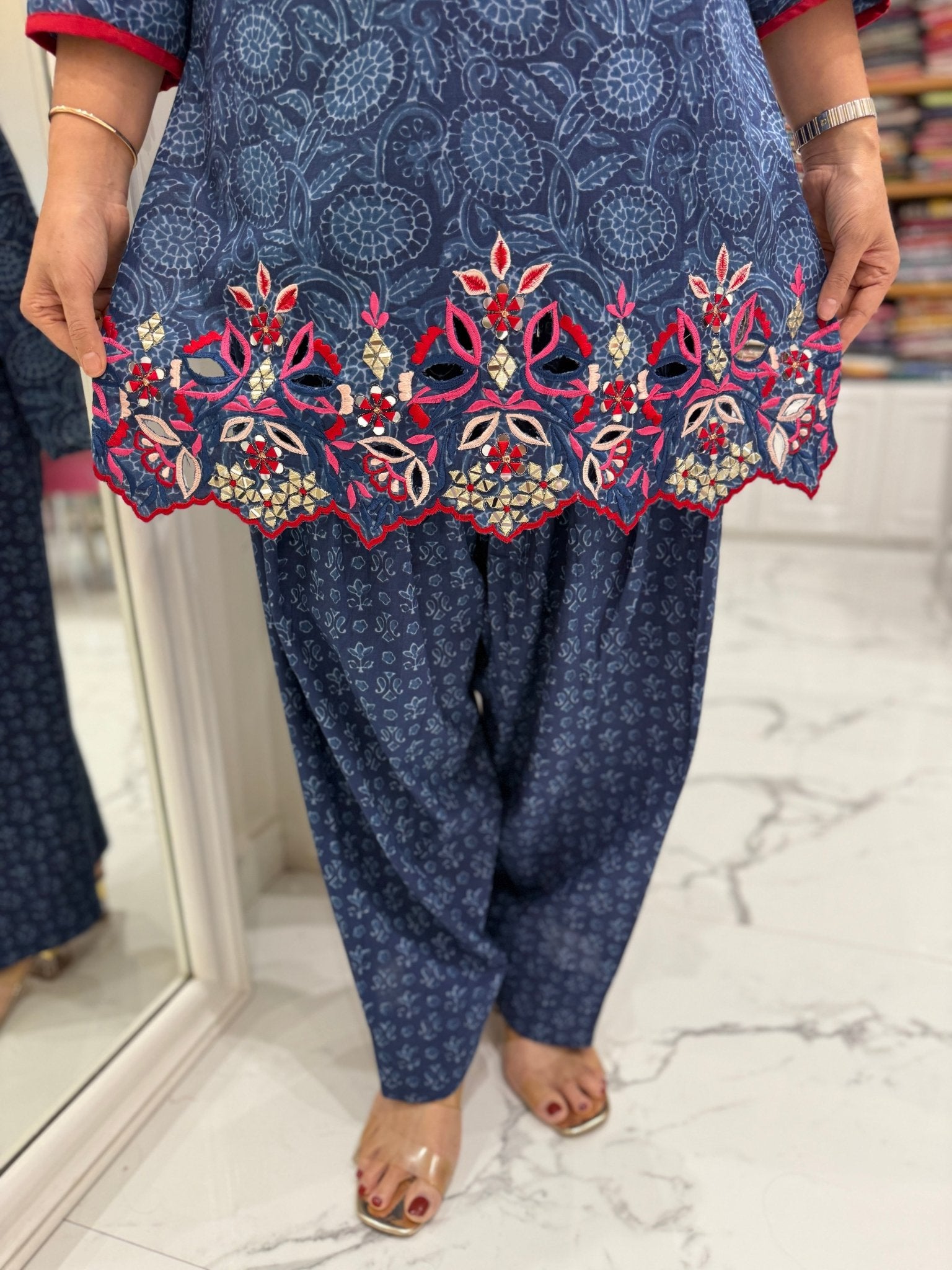 Elegant cotton suit with floral print, mirror work neckline, and cutwork hem, paired with a matching farshi salwar and dupatta—perfect for casual or festive wear.