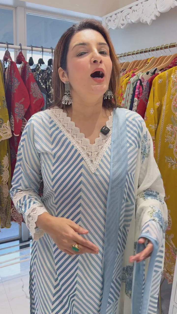 A cotton straight pants set featuring leheriya and floral print, with lace on the kurta and pants, along with a soft pure mul dupatta.