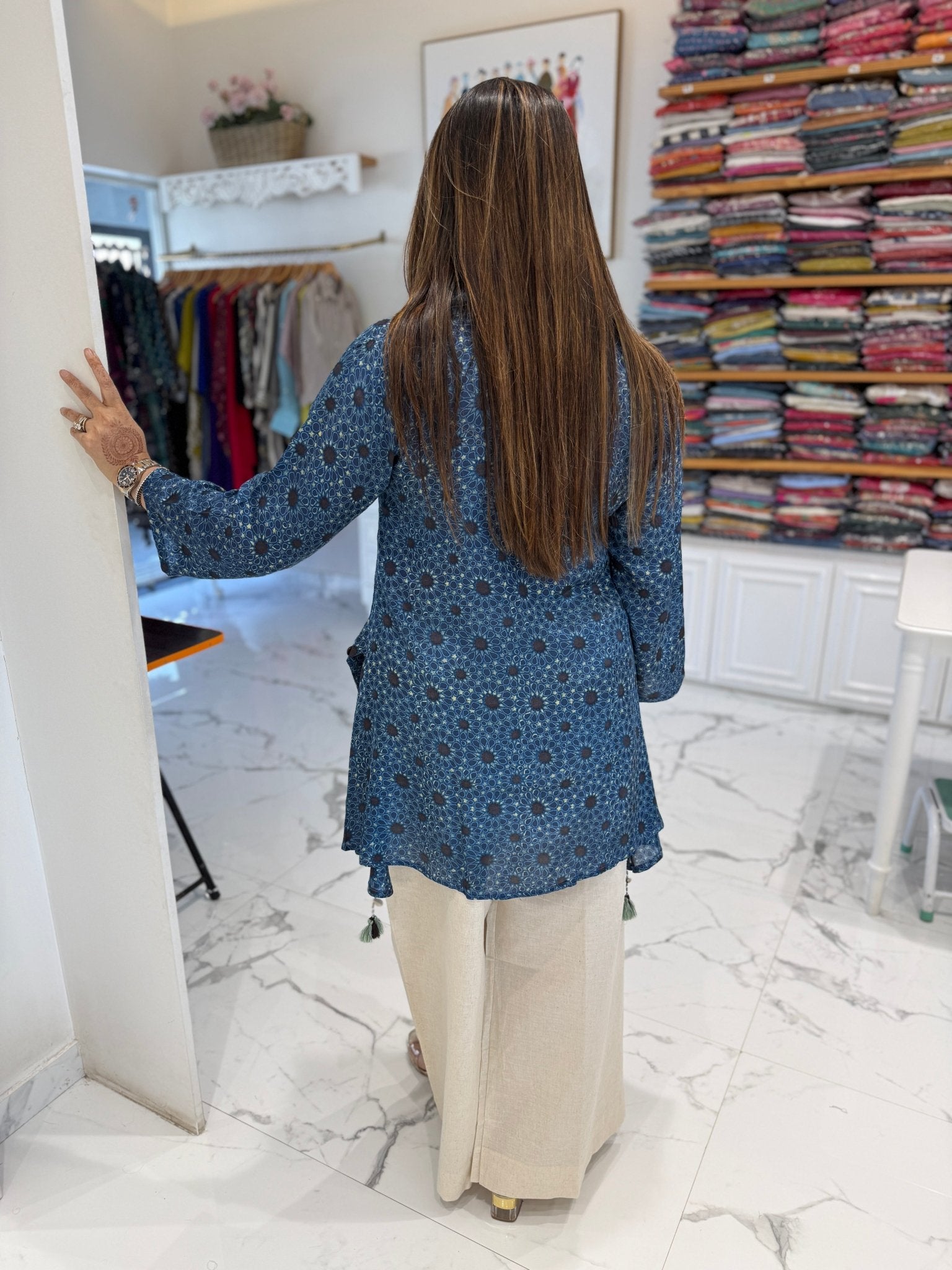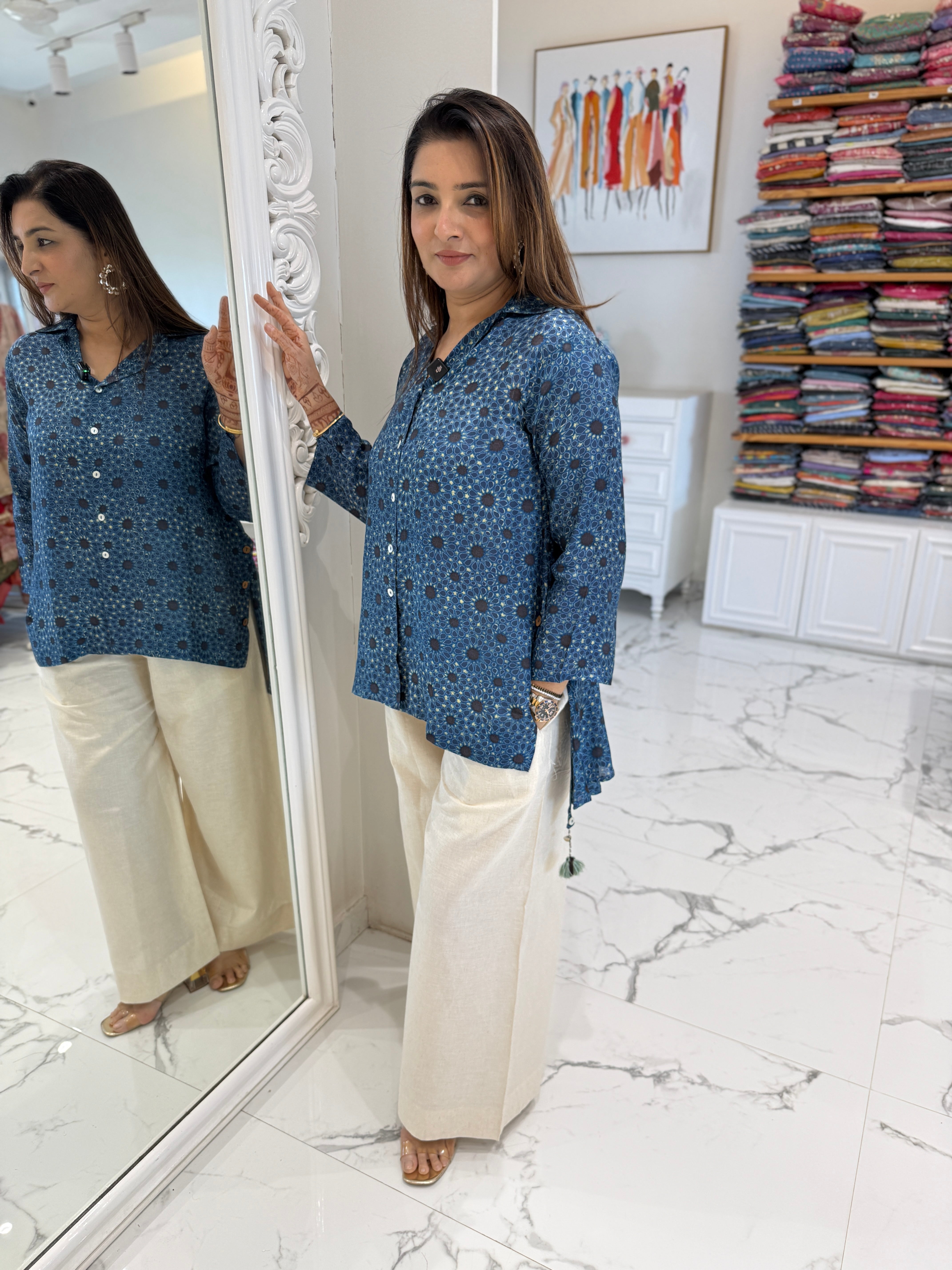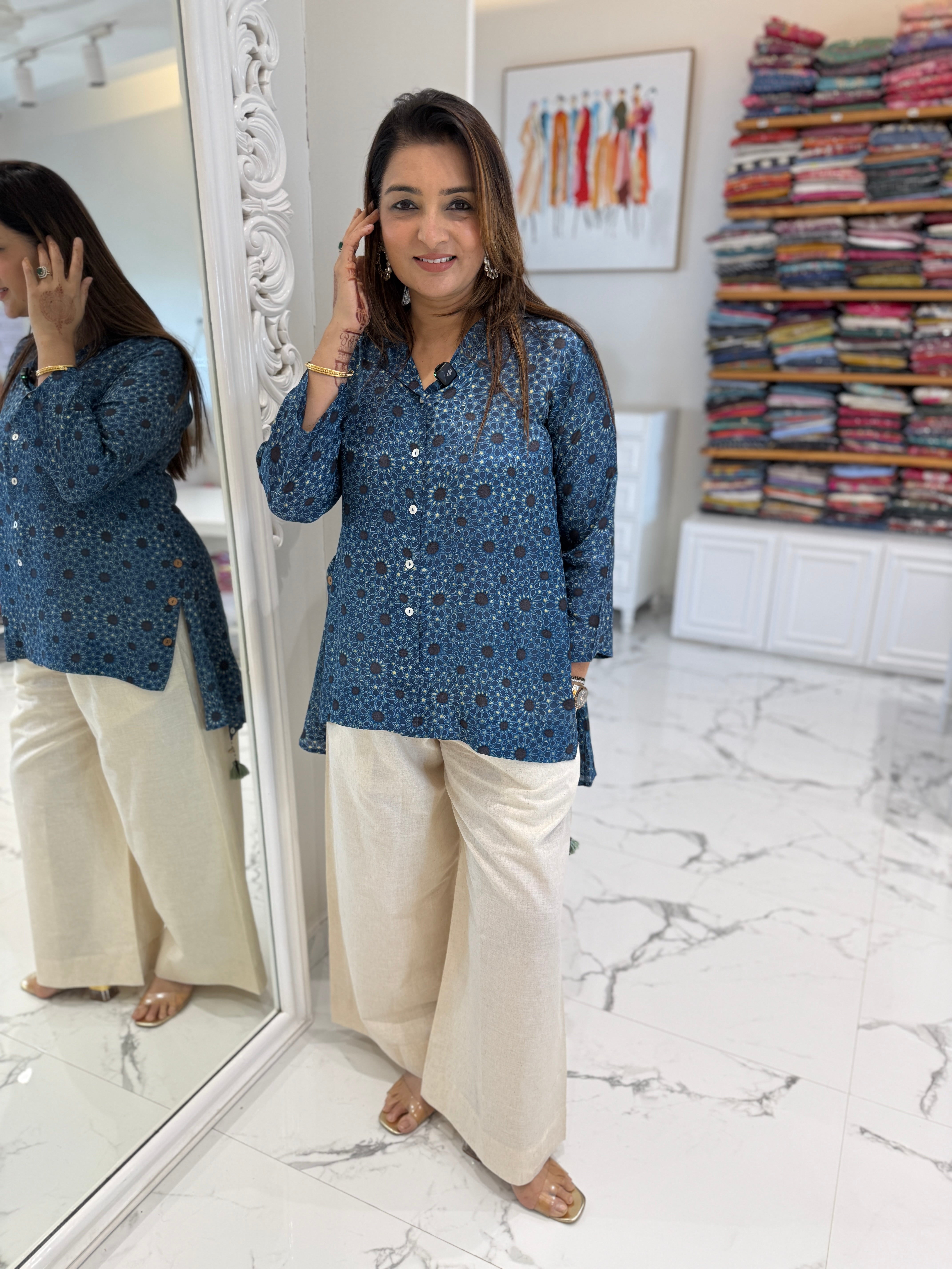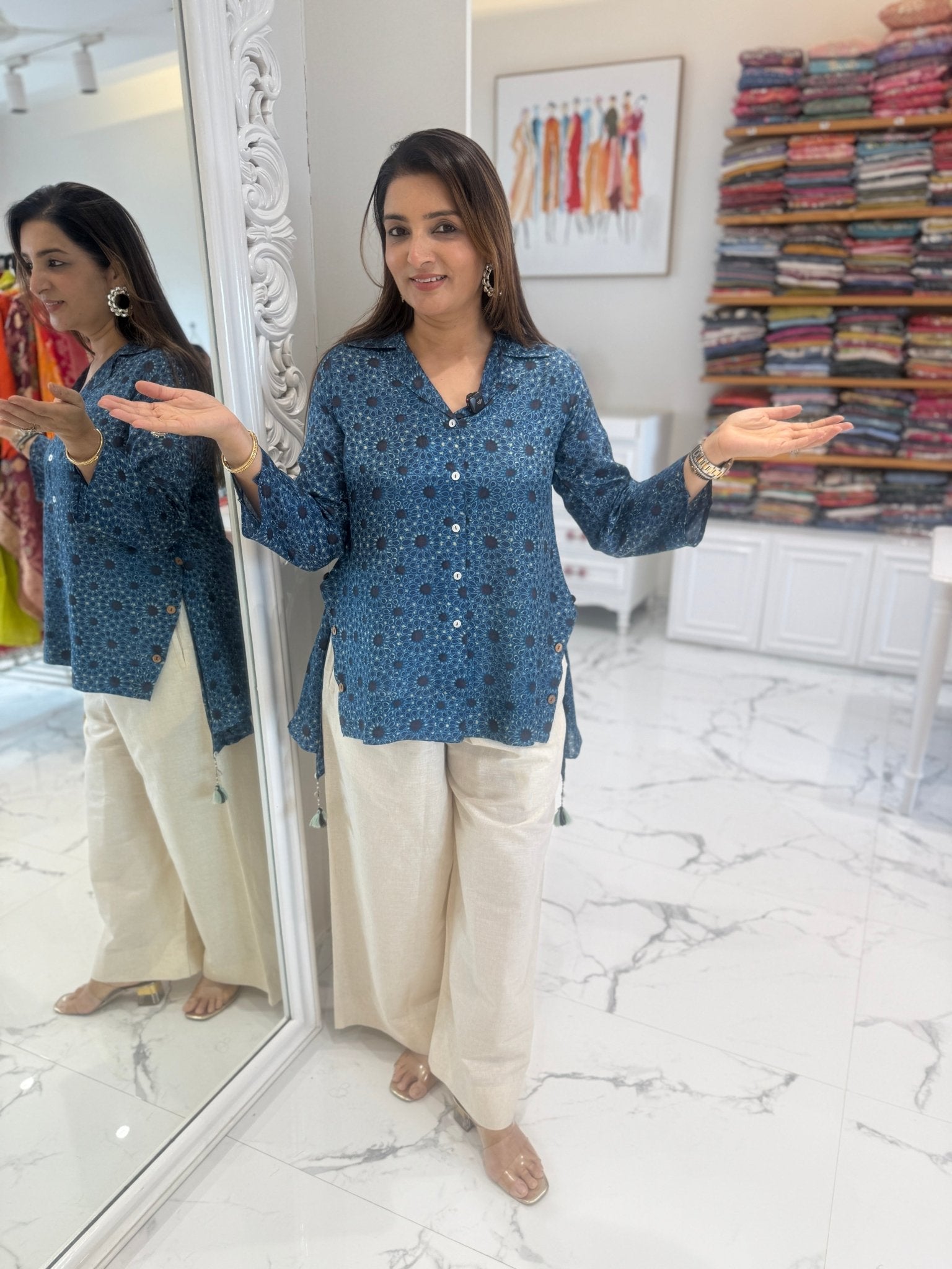 This elegant 2-piece Indo-Western set features a rich kalamkari top paired with cotton pants.