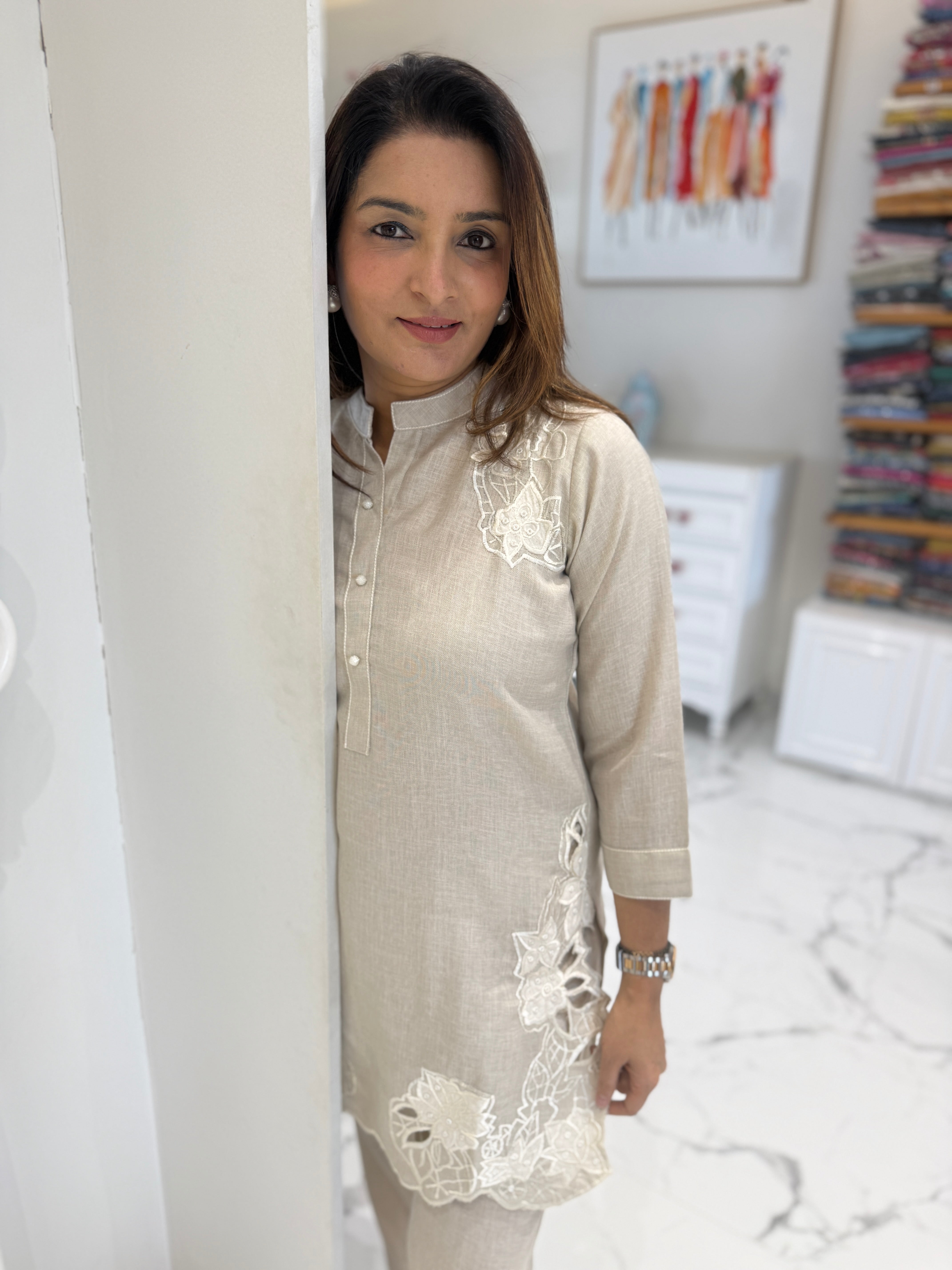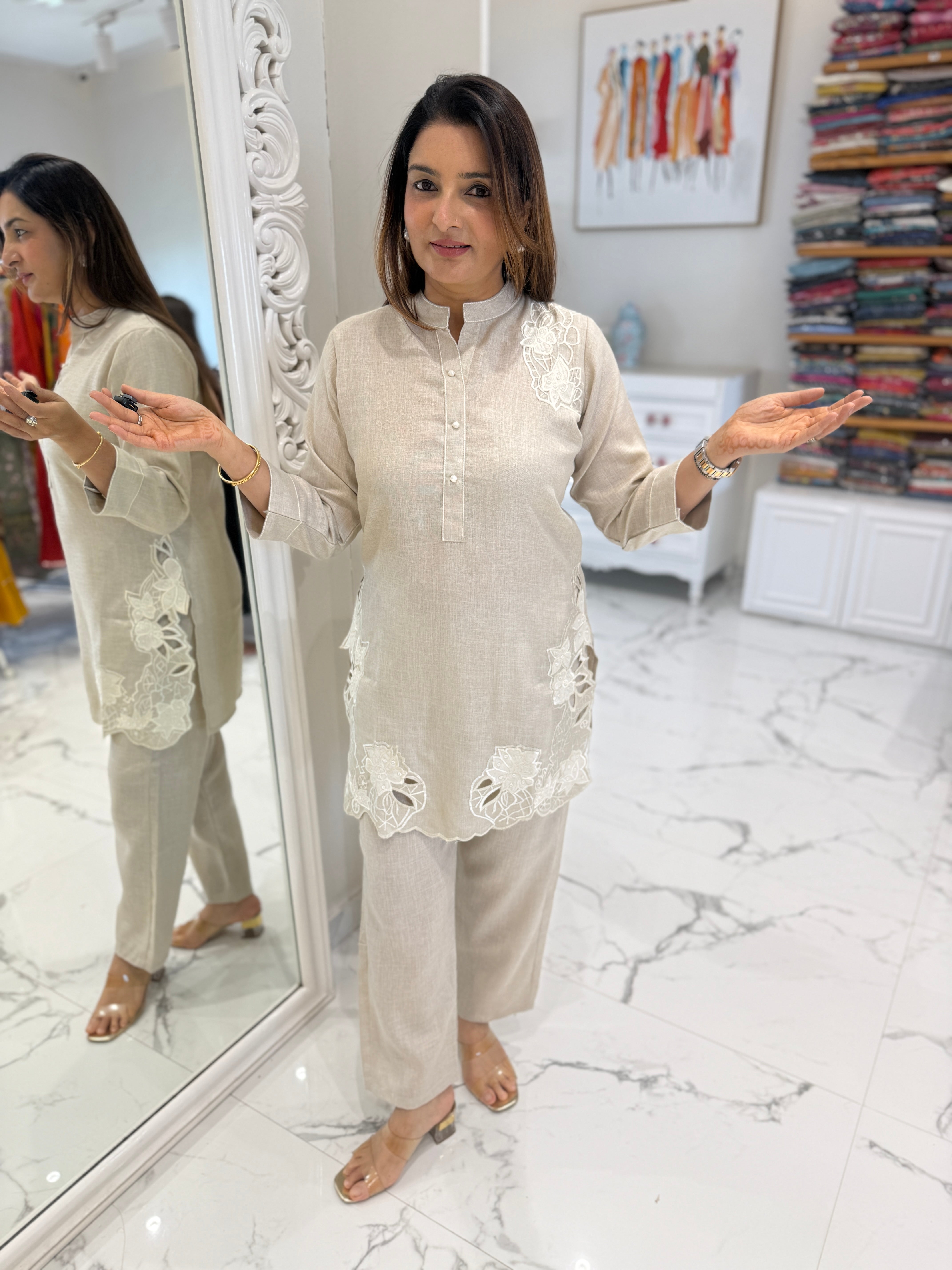 Soft cotton co-ord set with delicate cut-work embroidery, paired with comfortable pants for an easy and elegant look.