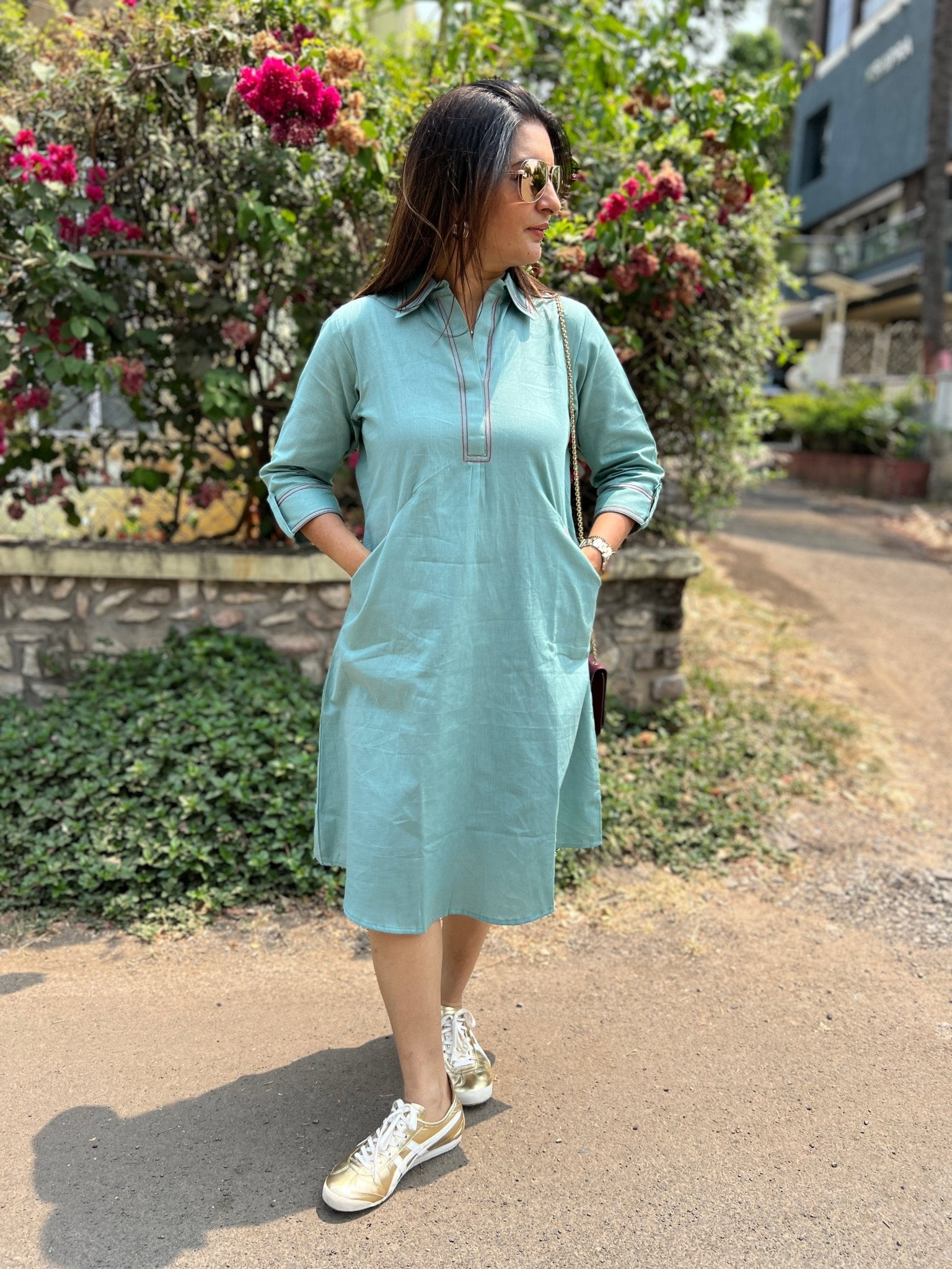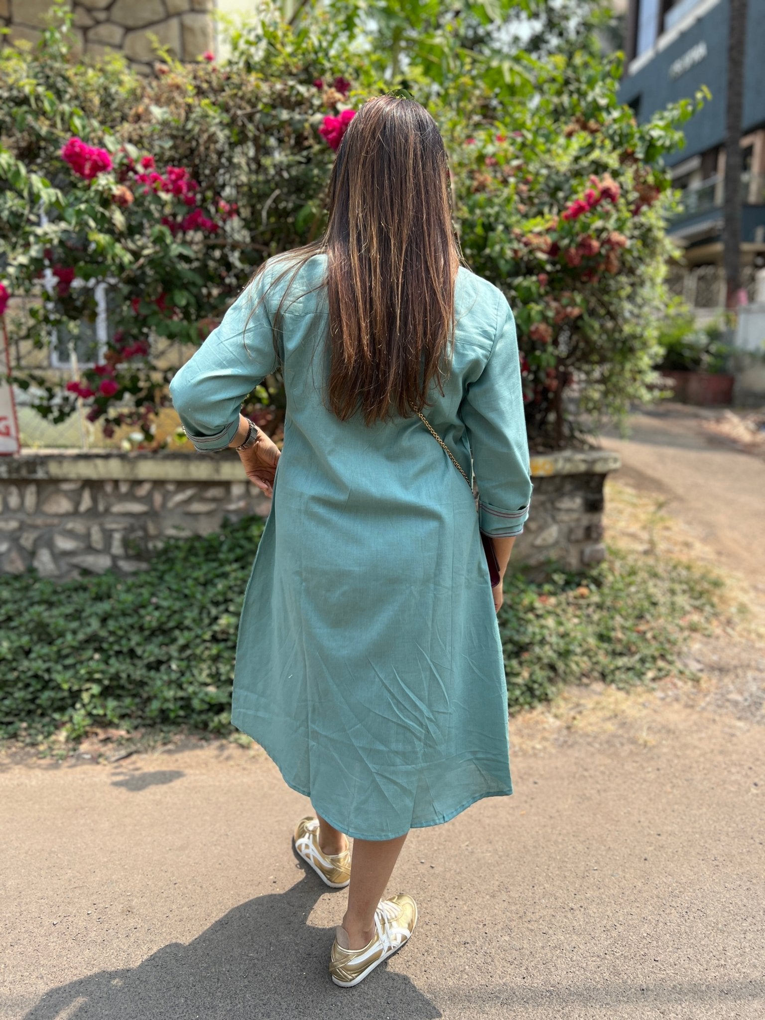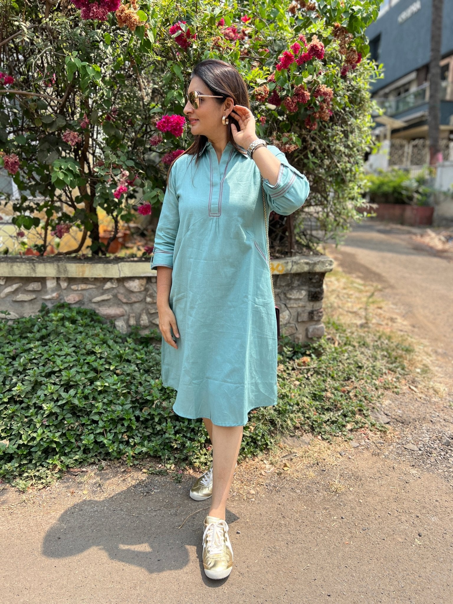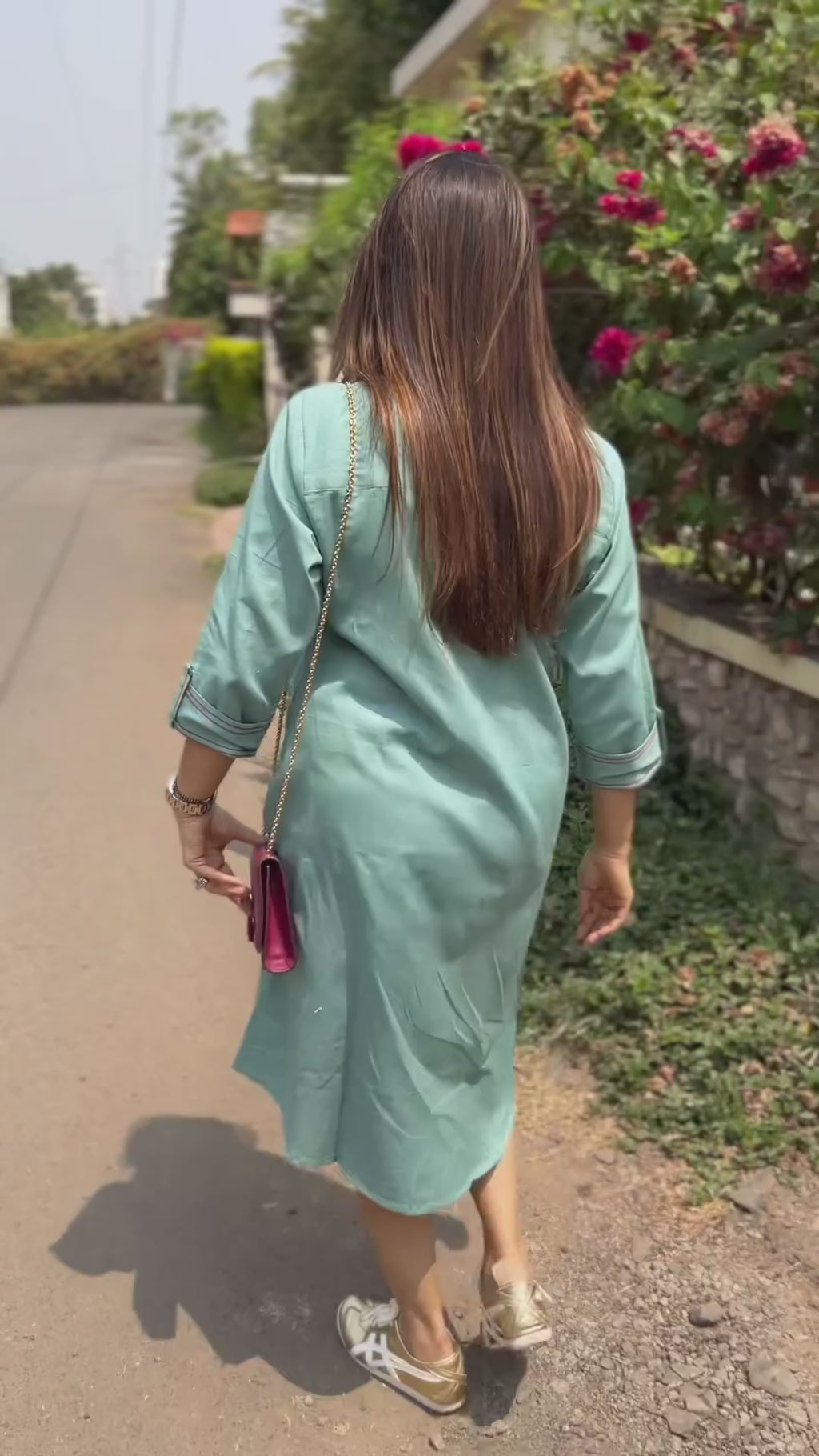 The dress features elegant sleeves and is crafted from a soft cotton blend, offering comfort and style with its flowing fabric. Take a closer look at the exquisite detailing in the product video.