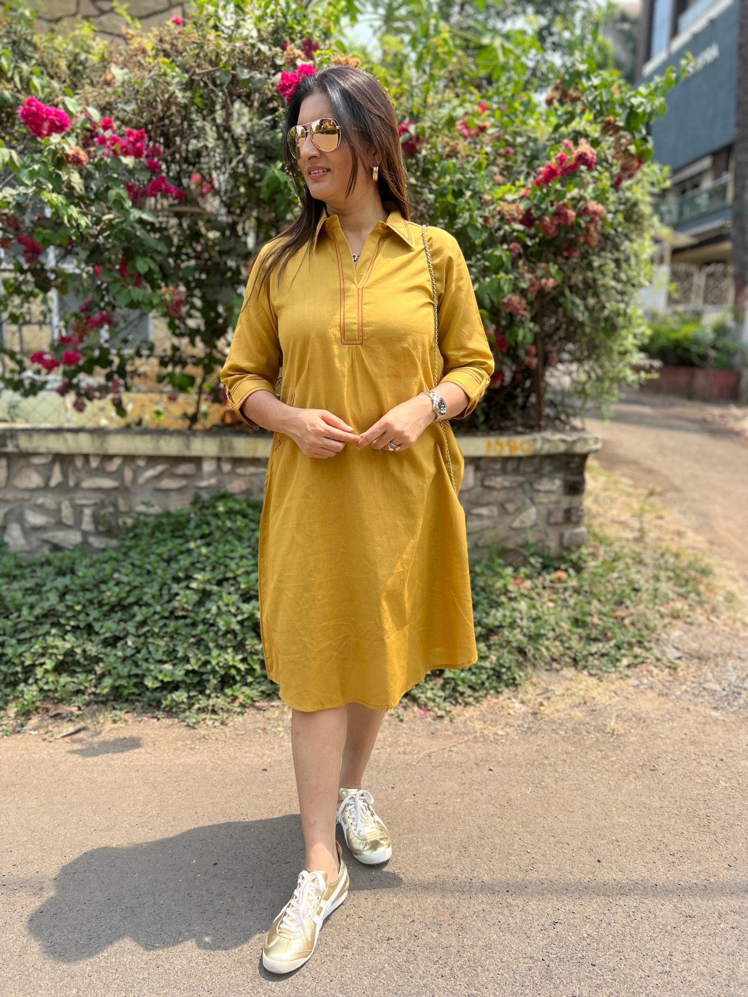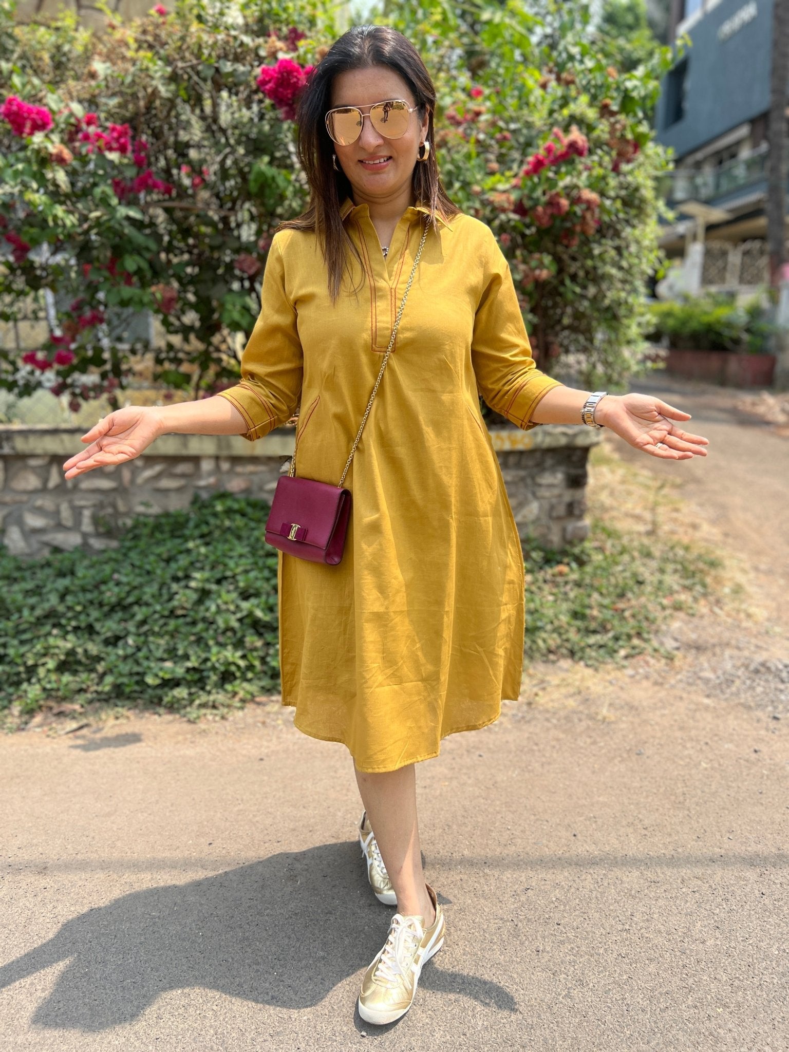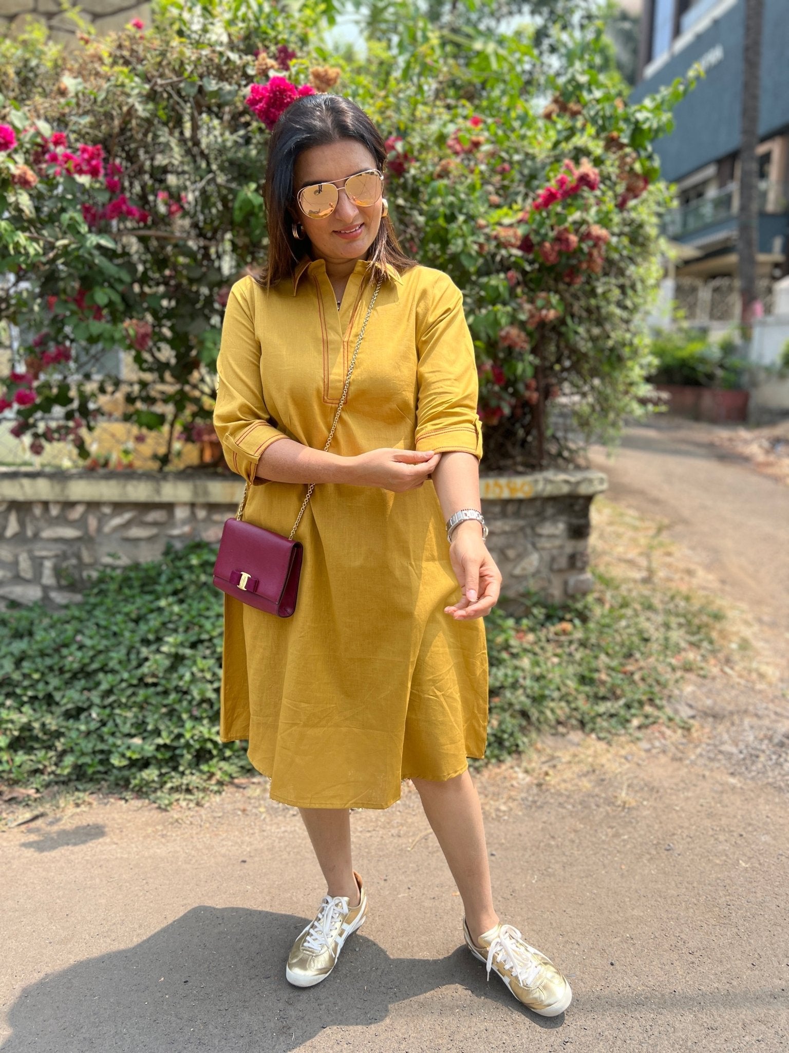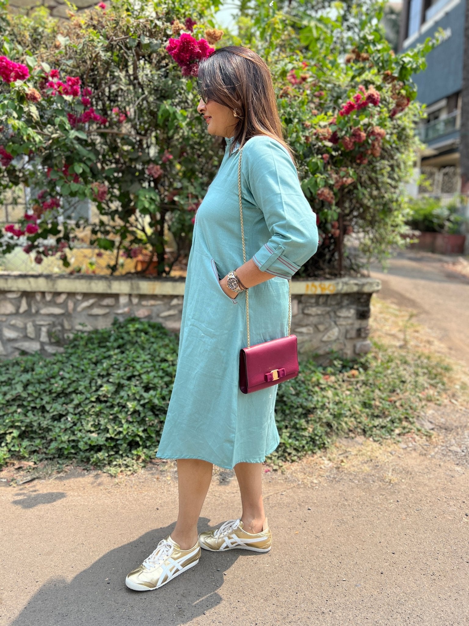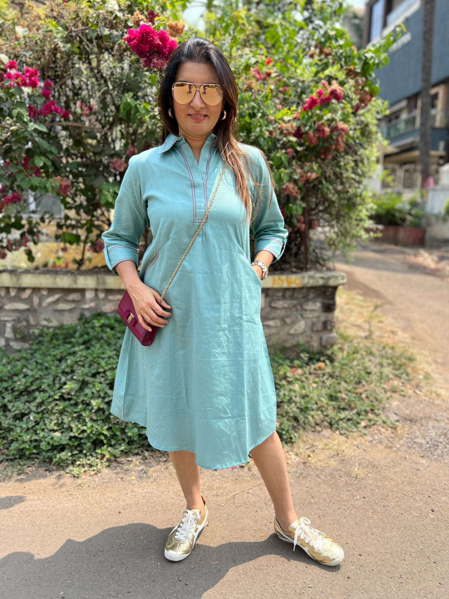 The dress features elegant sleeves and is crafted from a soft cotton blend, offering comfort and style with its flowing fabric. Take a closer look at the exquisite detailing in the product video.