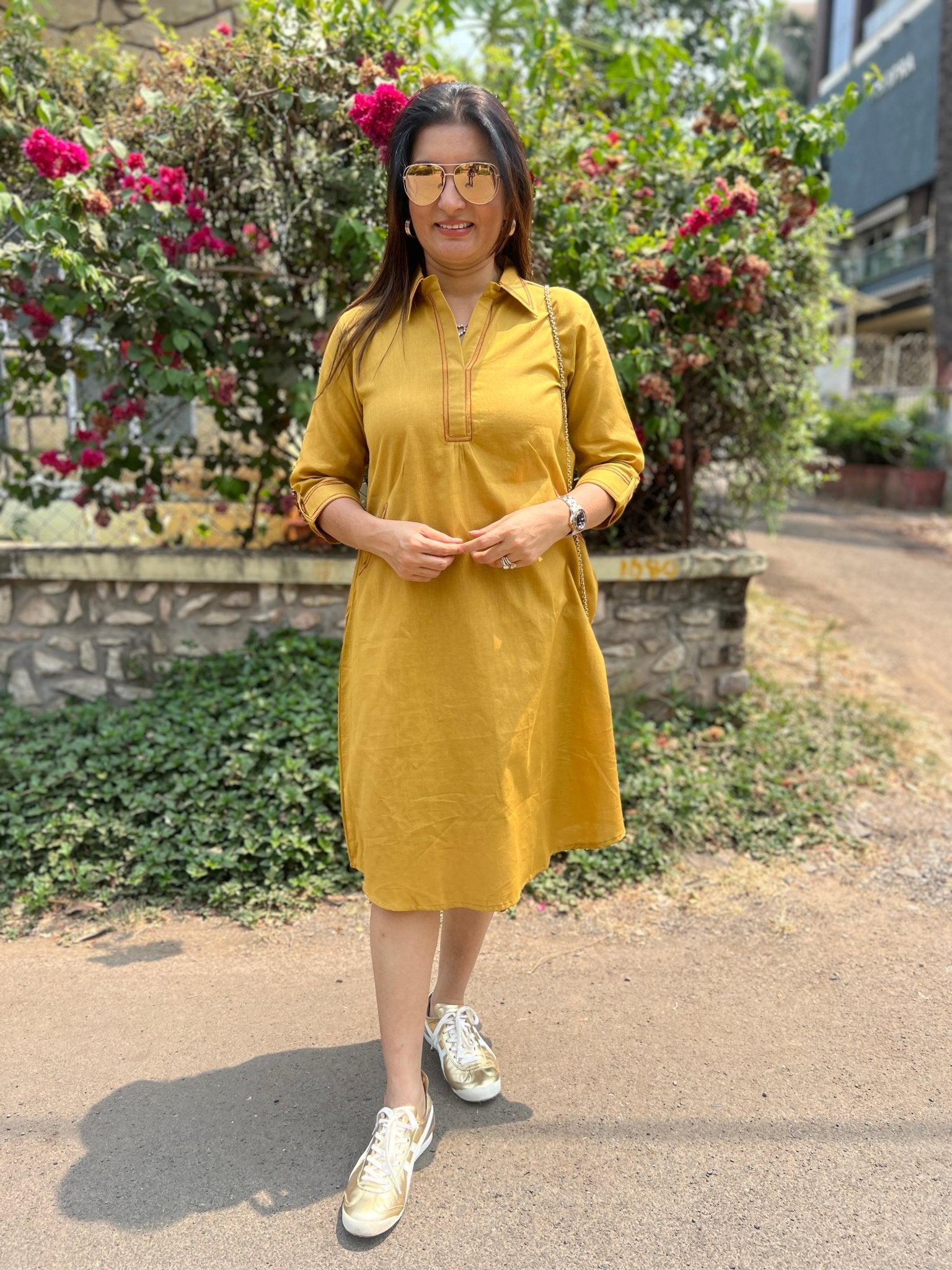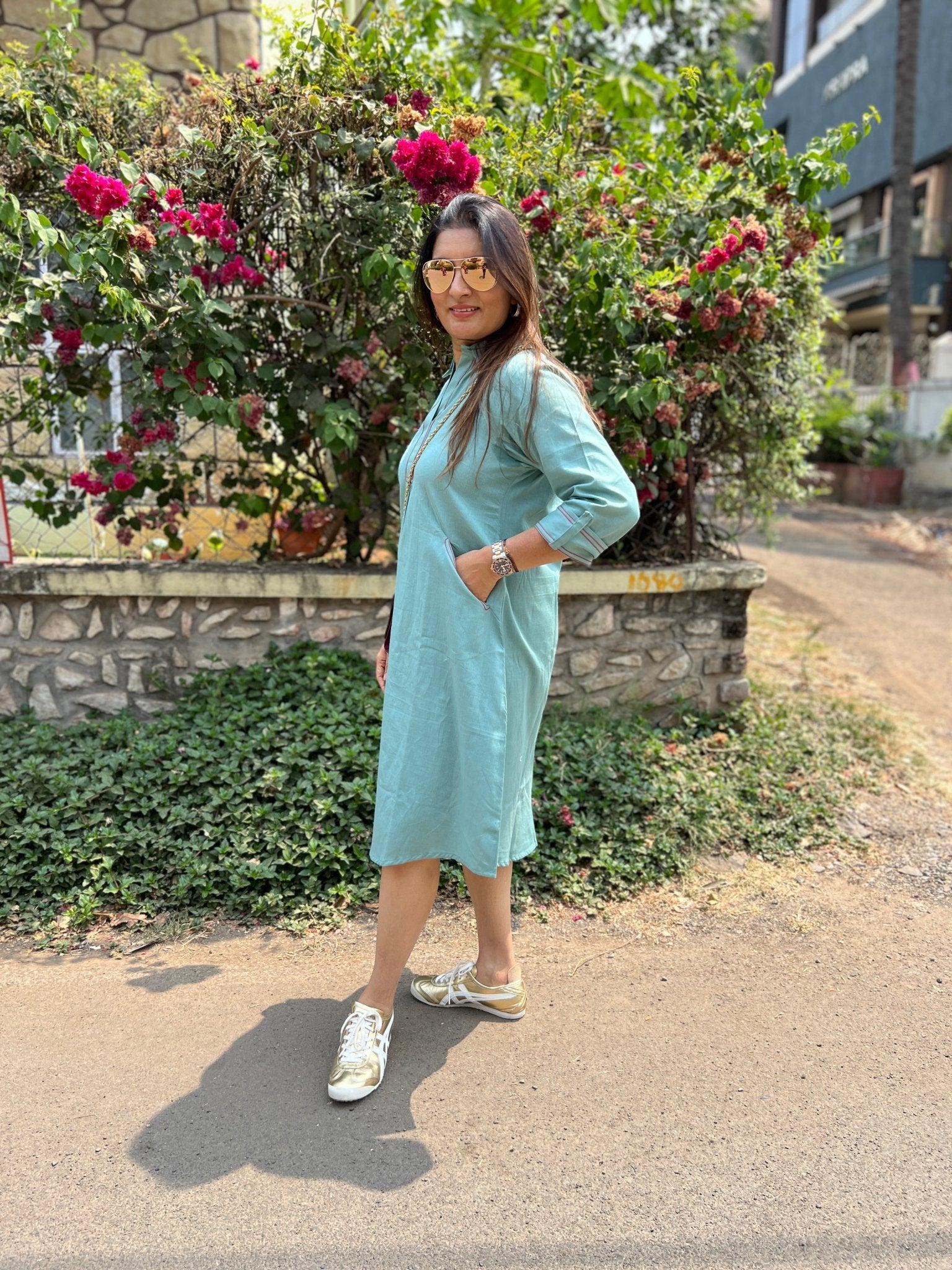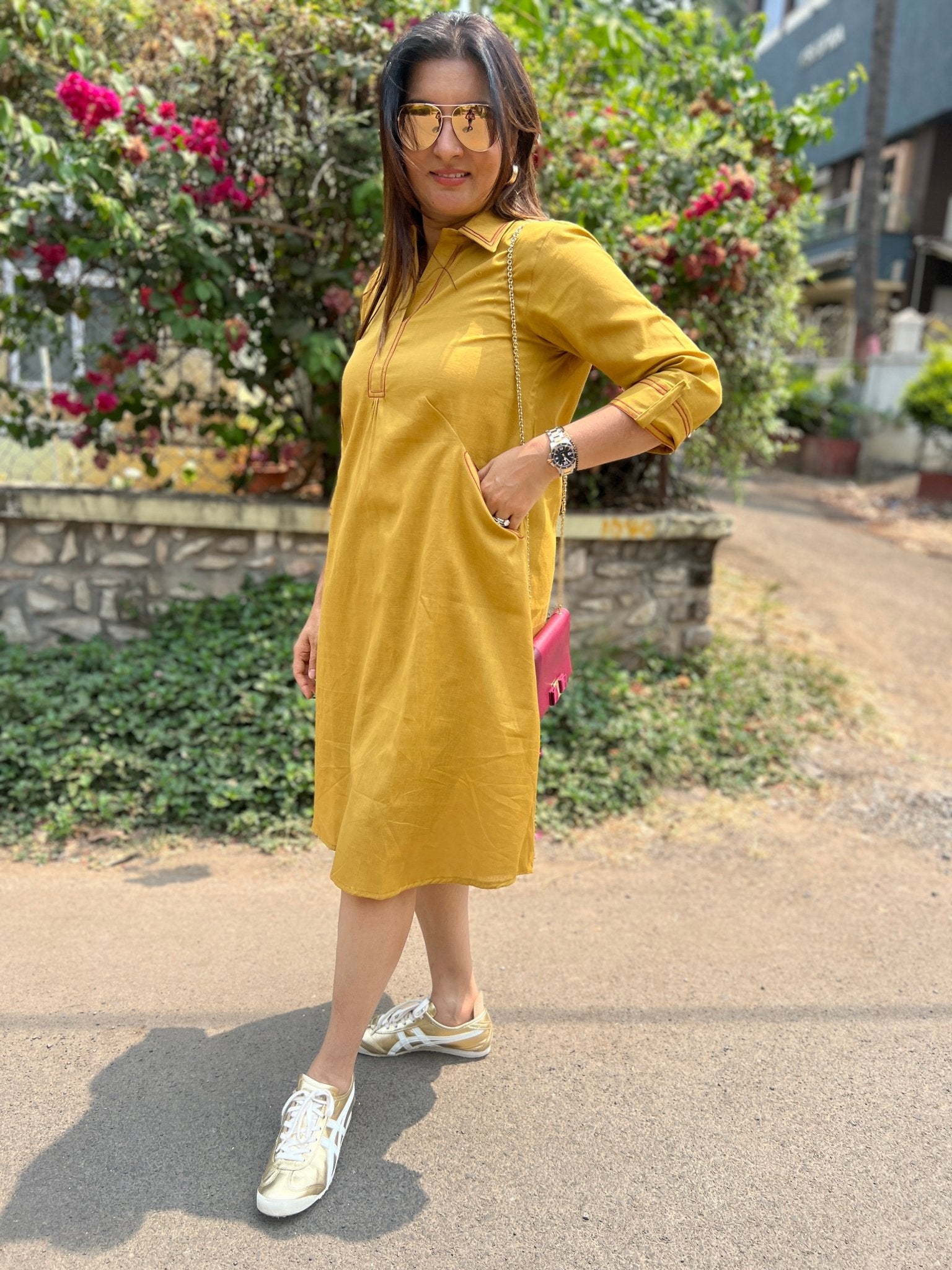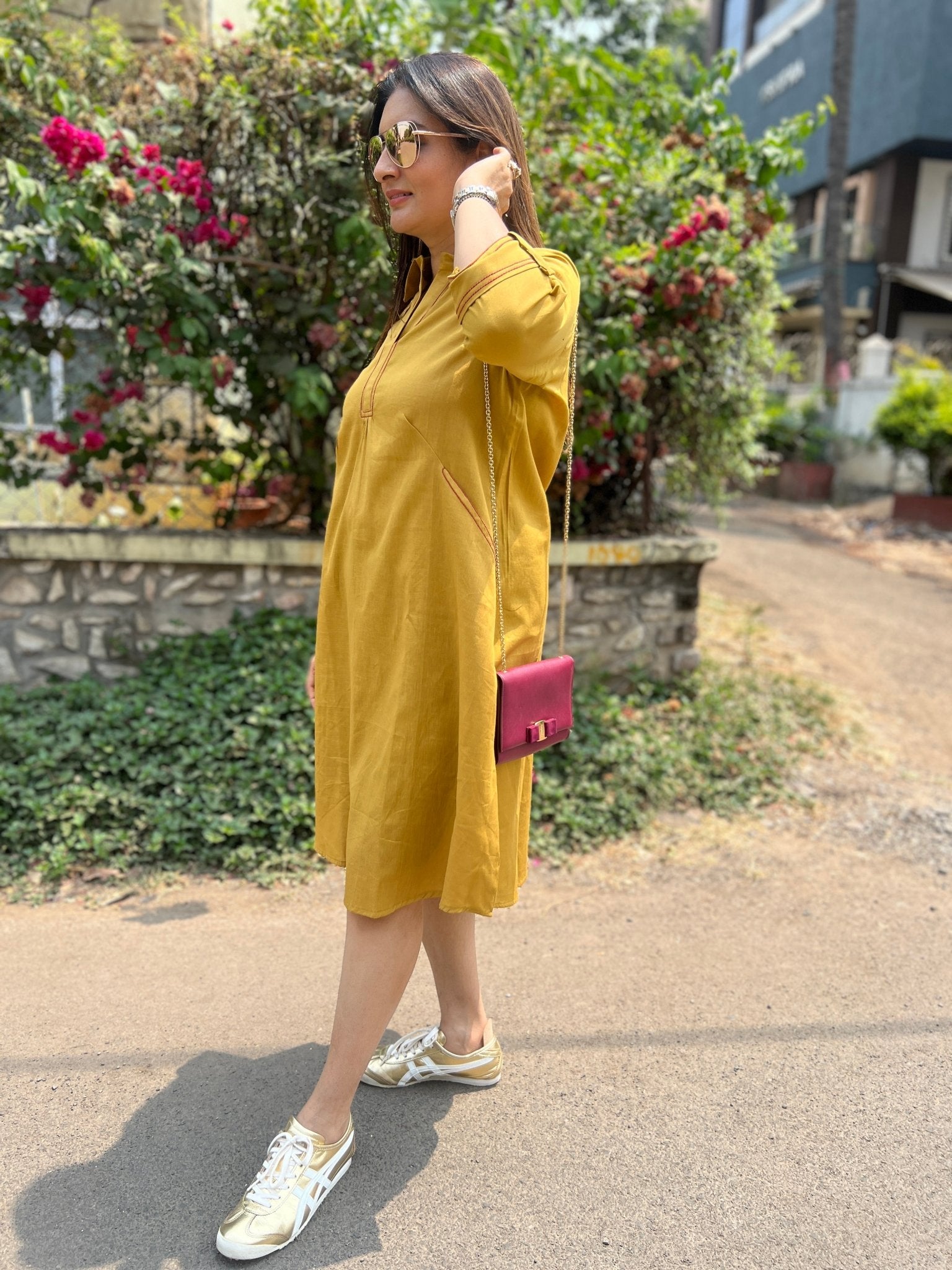 The dress features elegant sleeves and is crafted from a soft cotton blend, offering comfort and style with its flowing fabric. Take a closer look at the exquisite detailing in the product video.