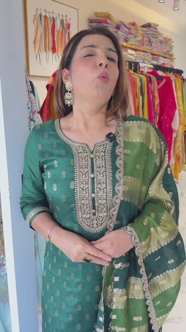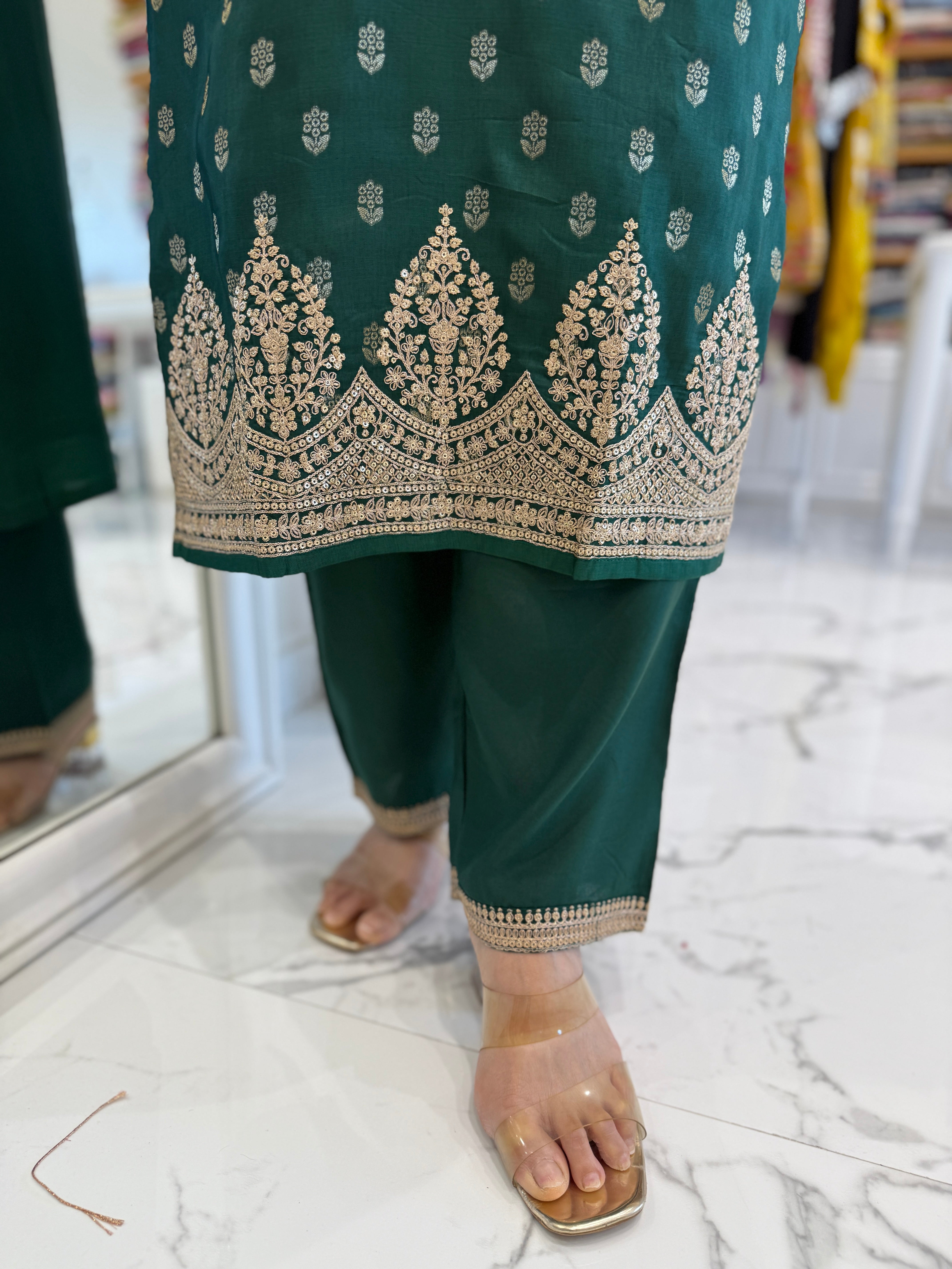 A graceful suit set featuring delicate sequin and zari embroidery on the neckline and hem. Paired with straight pants and a rich tissue dupatta.