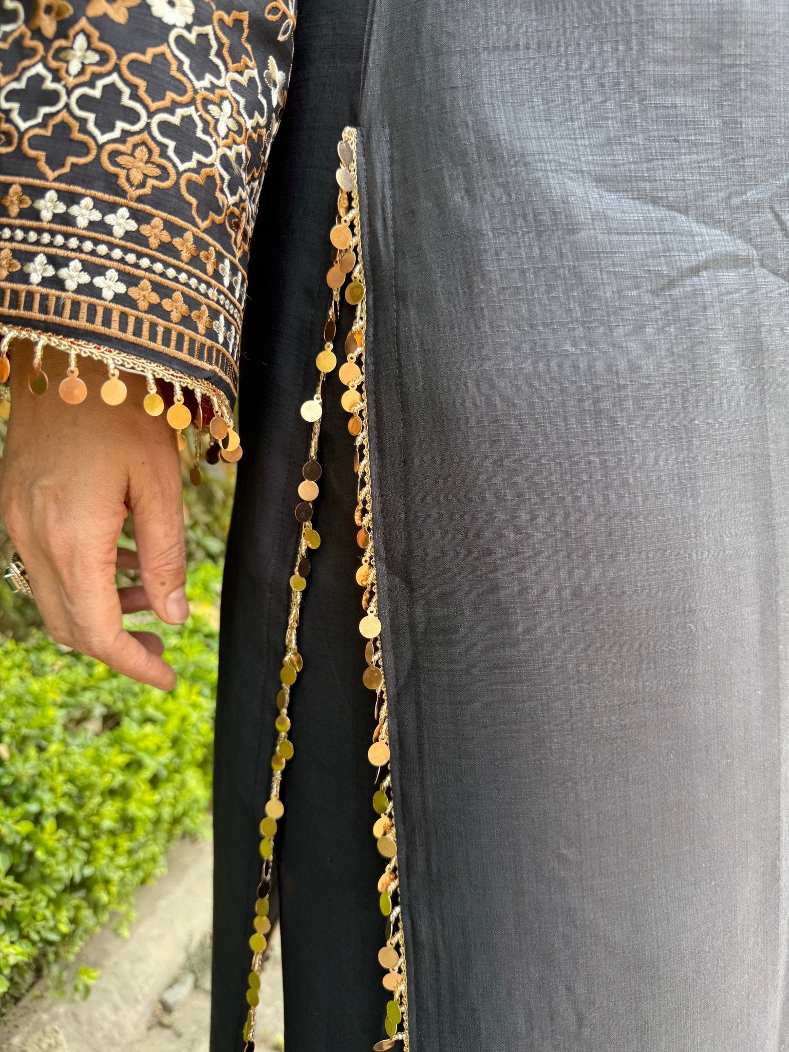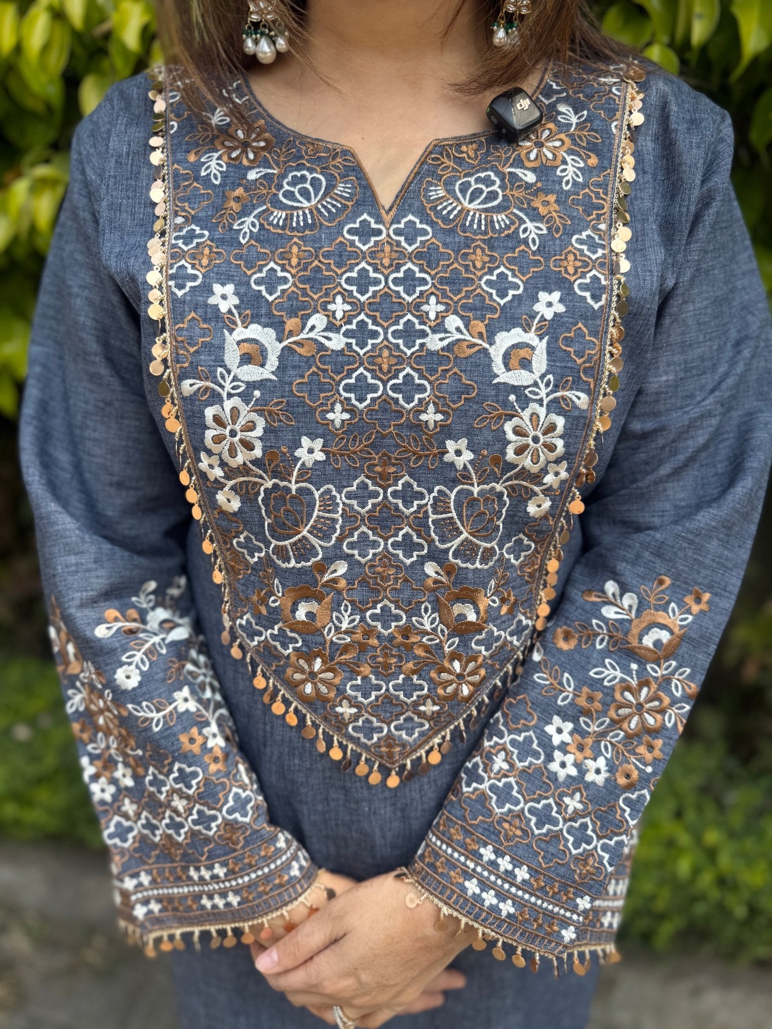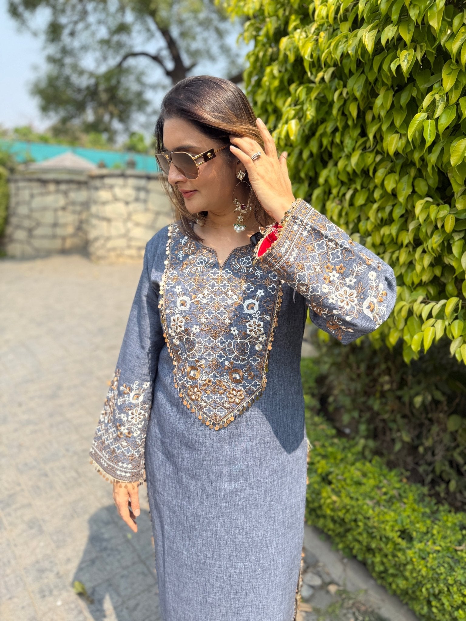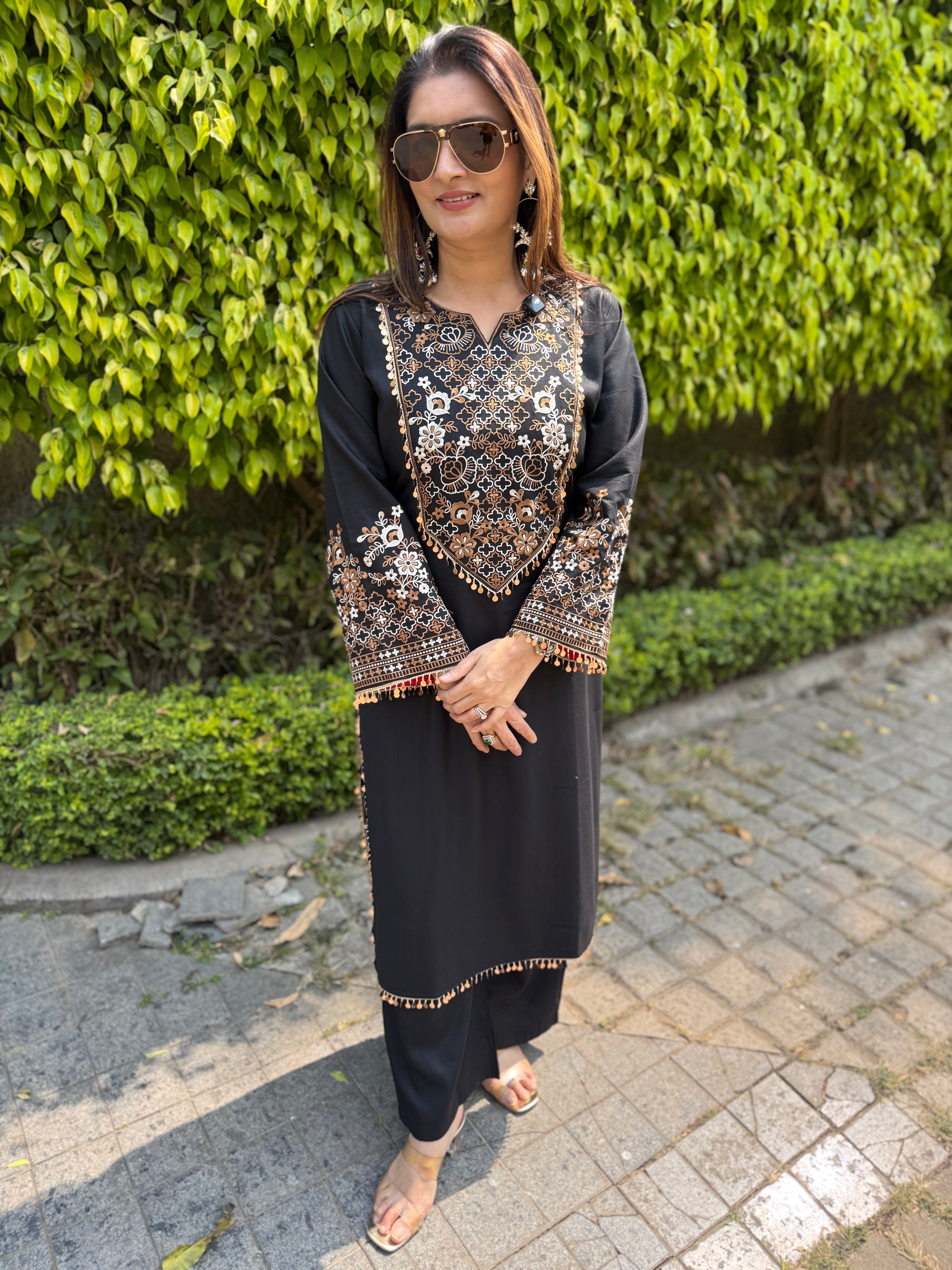 Elegant embroidered coord set with intricate thread work detailing and delicate coin lace finishing. Paired with comfortable straight pants for a classy, effortless look.