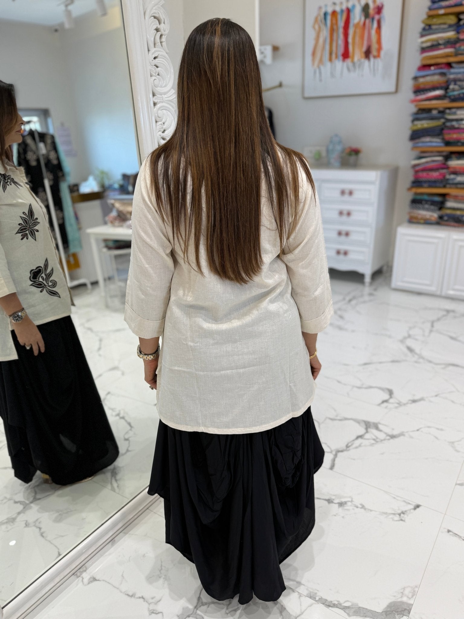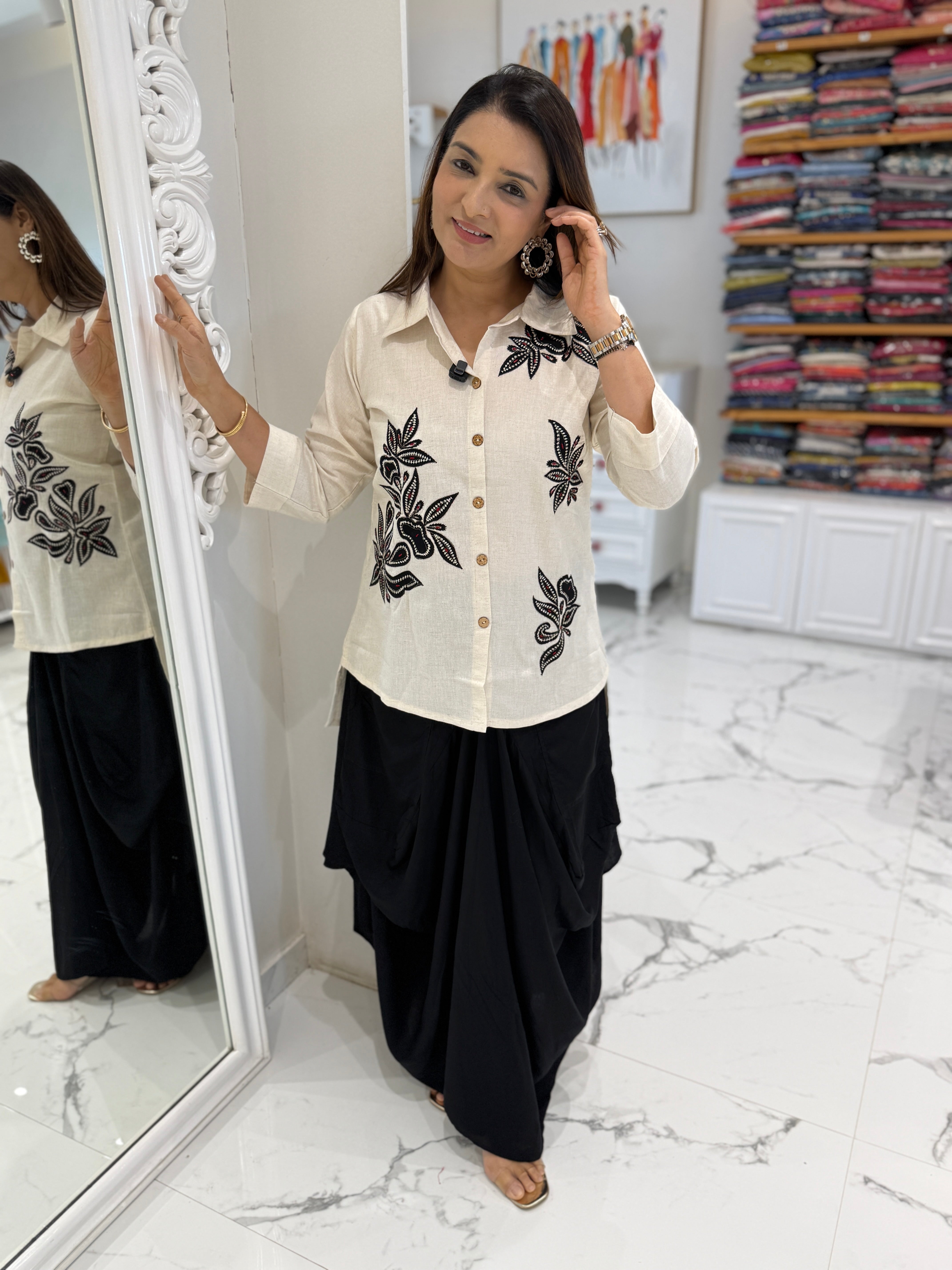 Soft and breathable cotton coord set featuring elegant patch-work detailing on the top. Paired with a stylish cowl-style skirt designed with functional inseam front pockets for added comfort and practicality.
