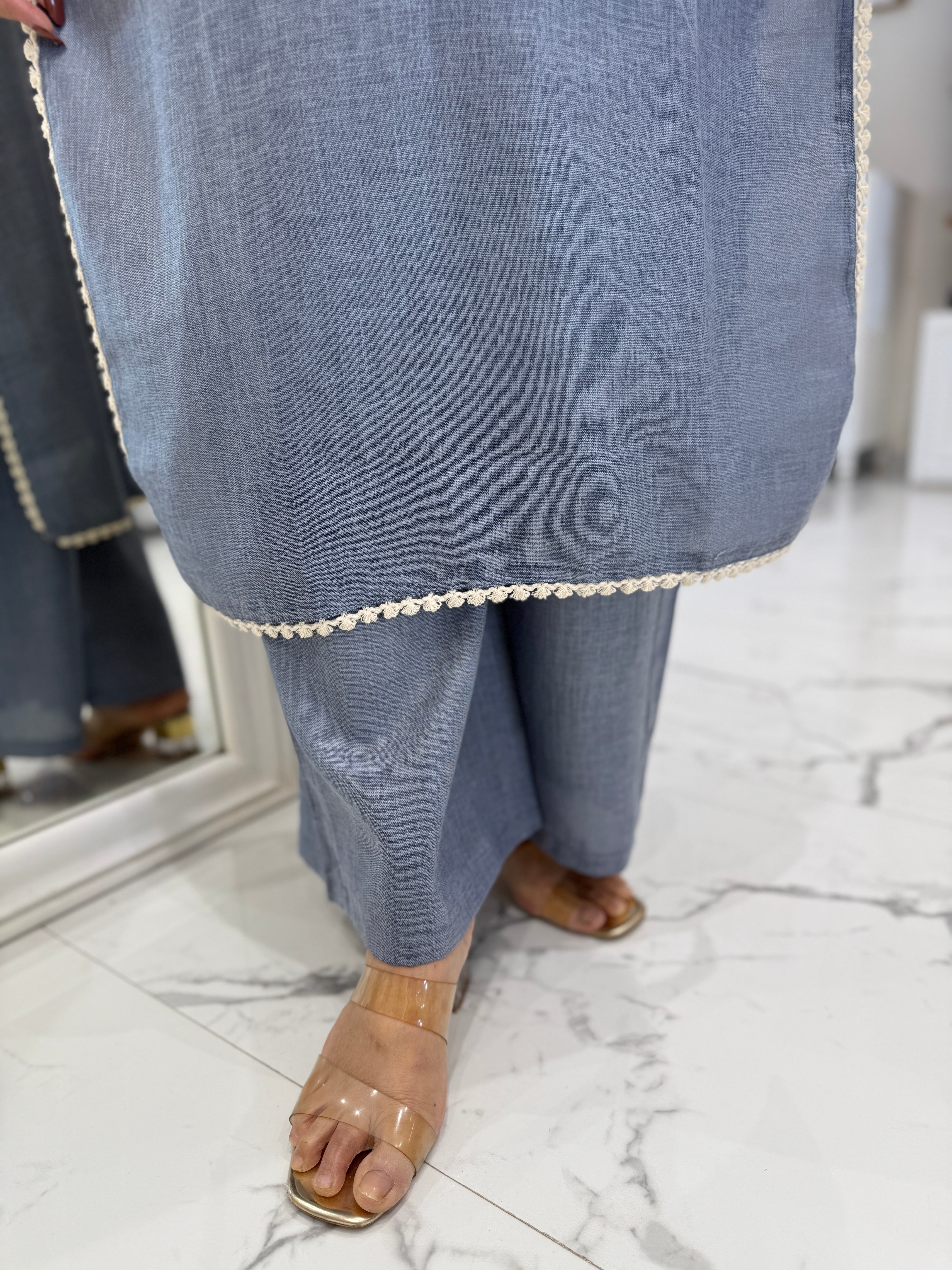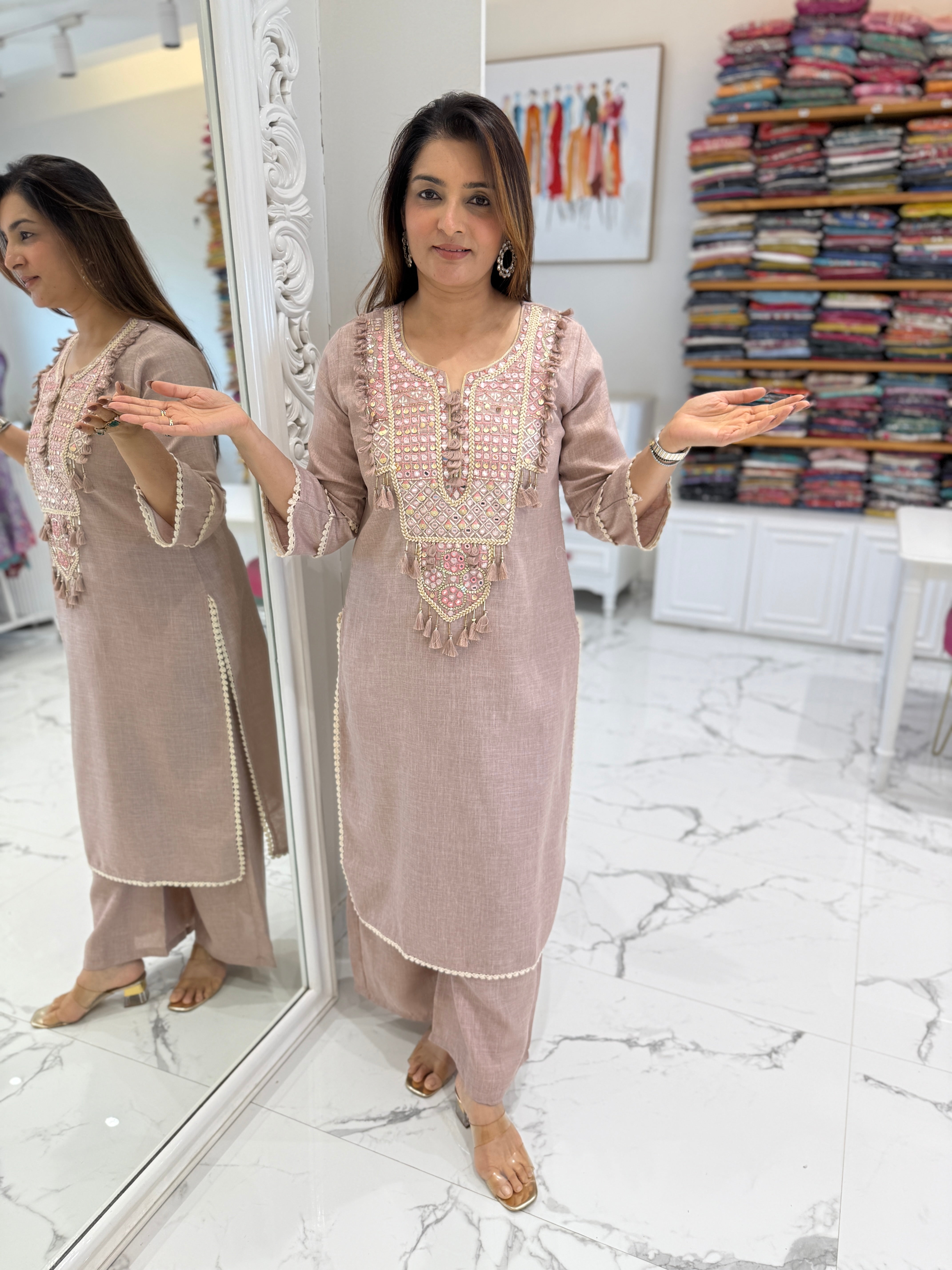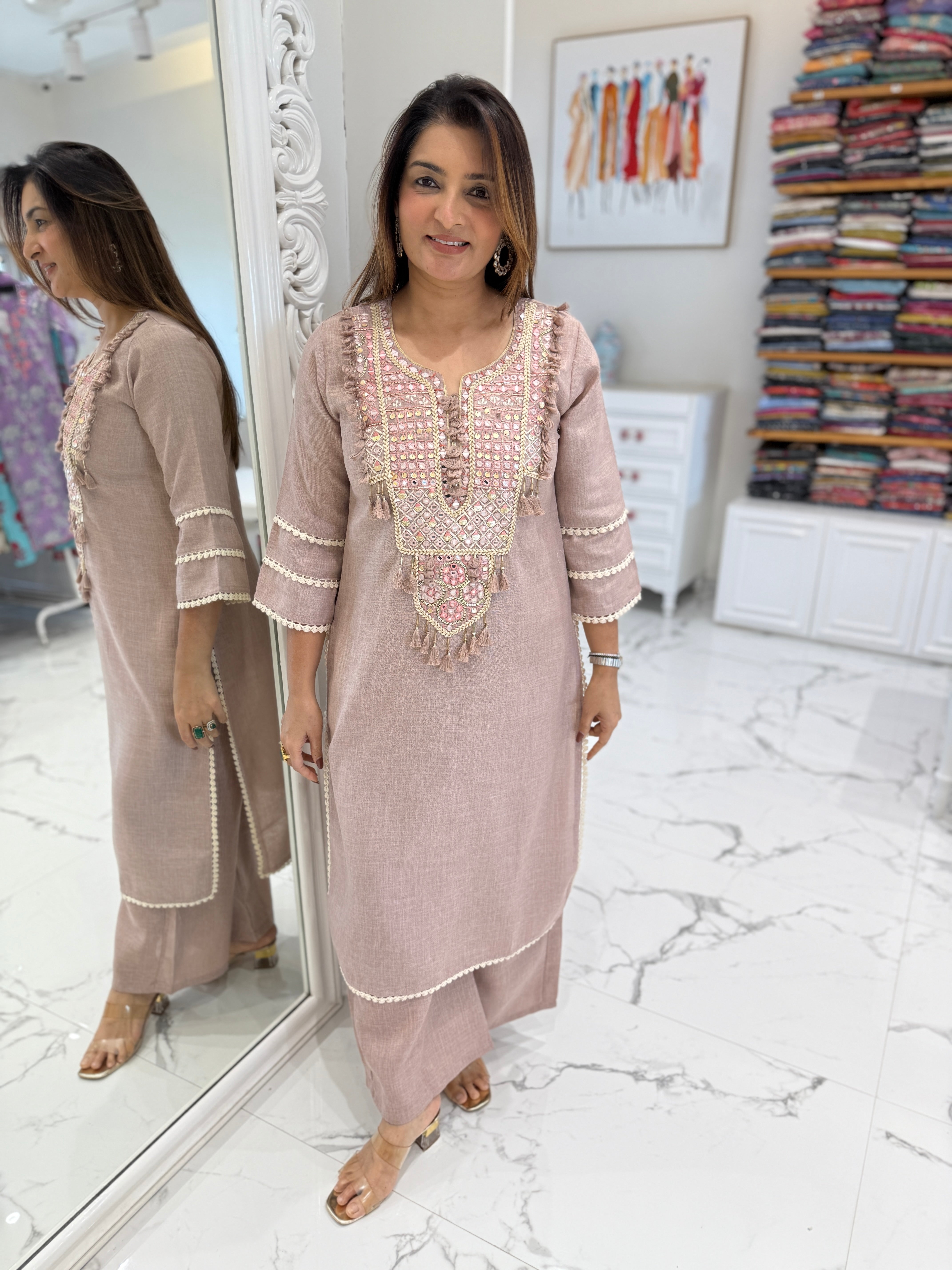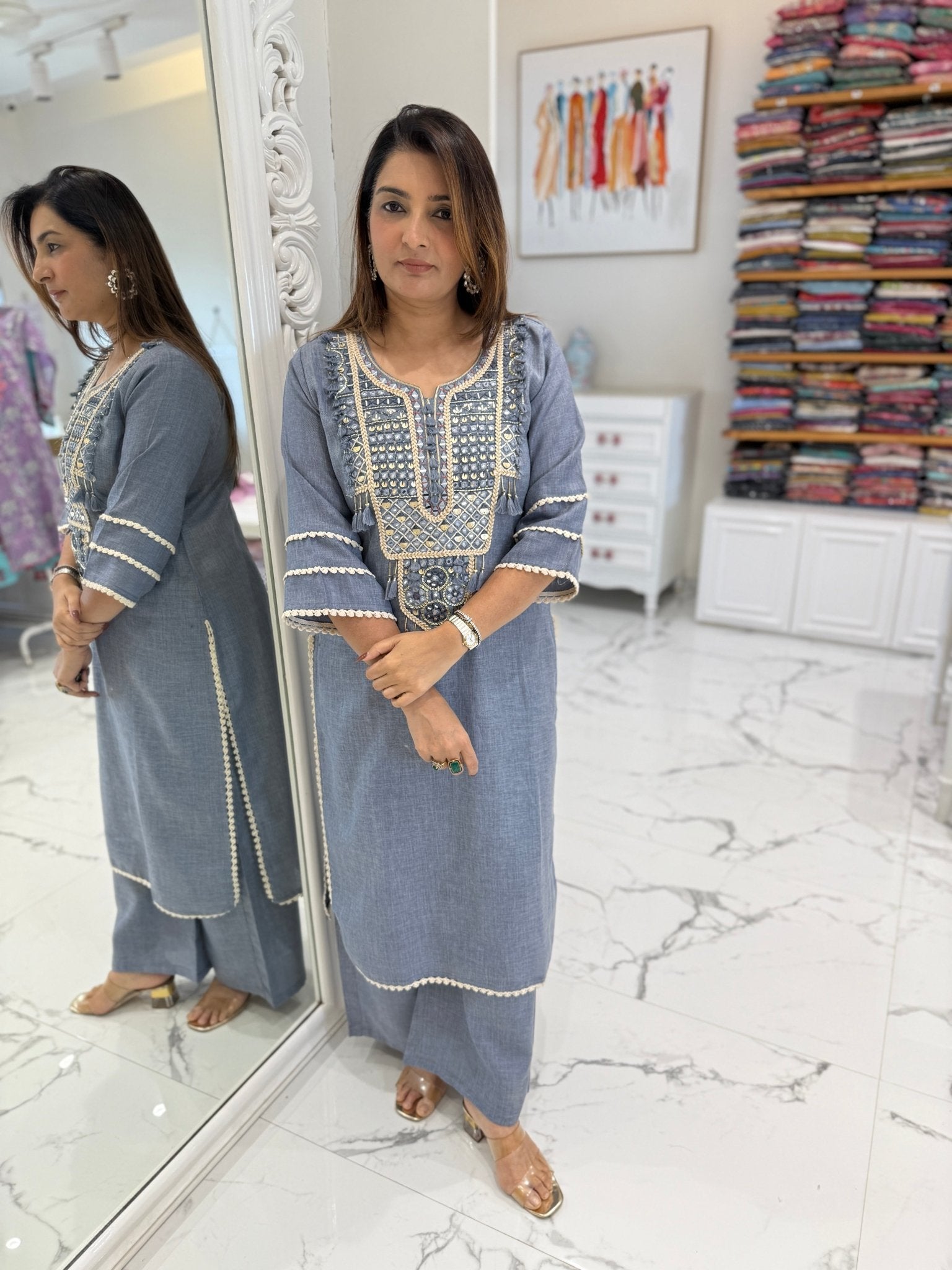 Soft cotton co-ord set featuring delicate mirror-work embroidery on the neckline, paired with comfortable palazzo pants for an elegant, effortless look.