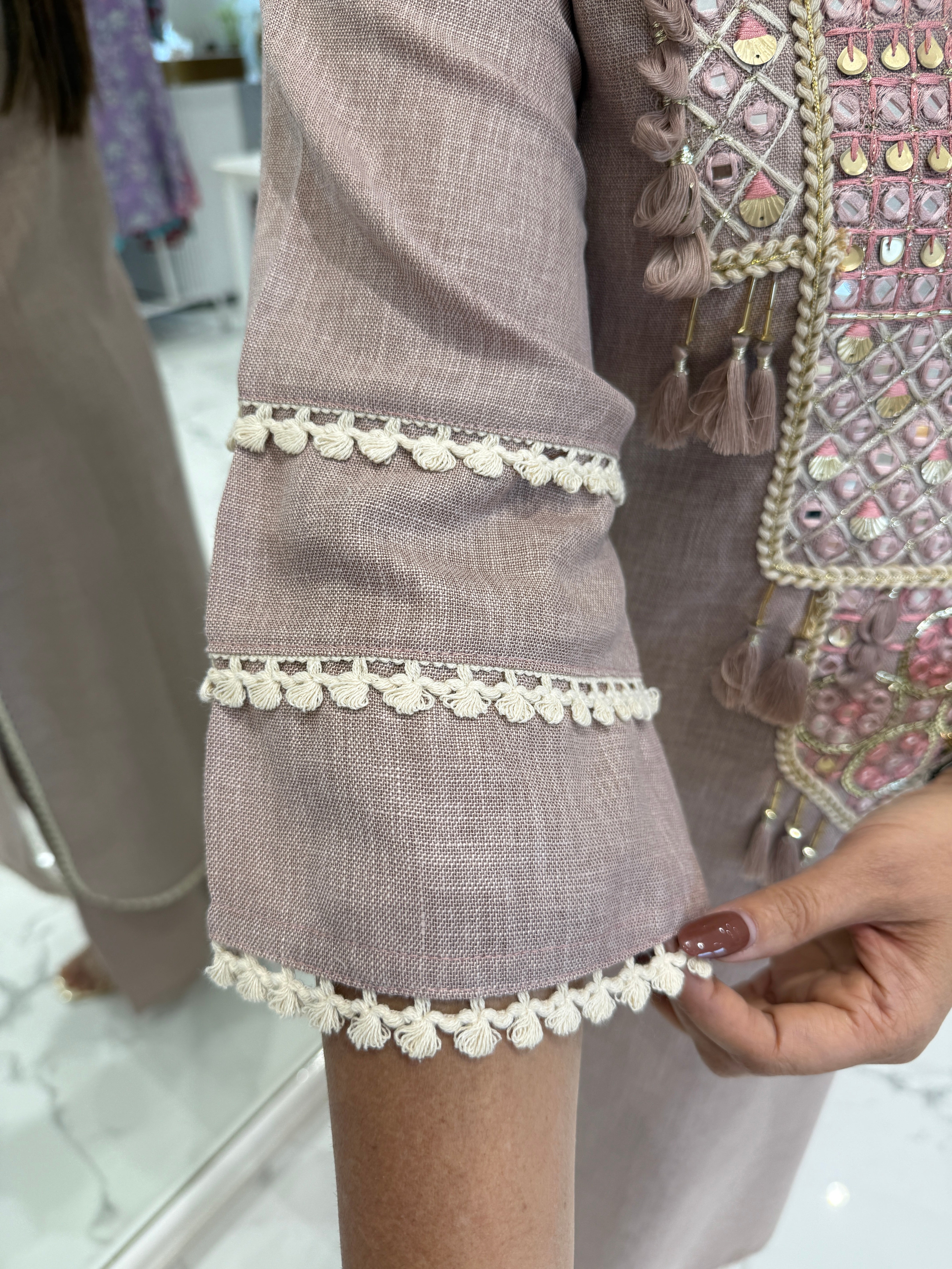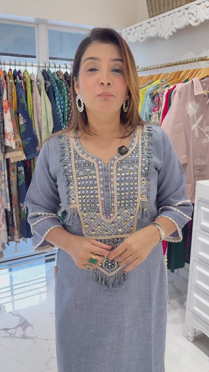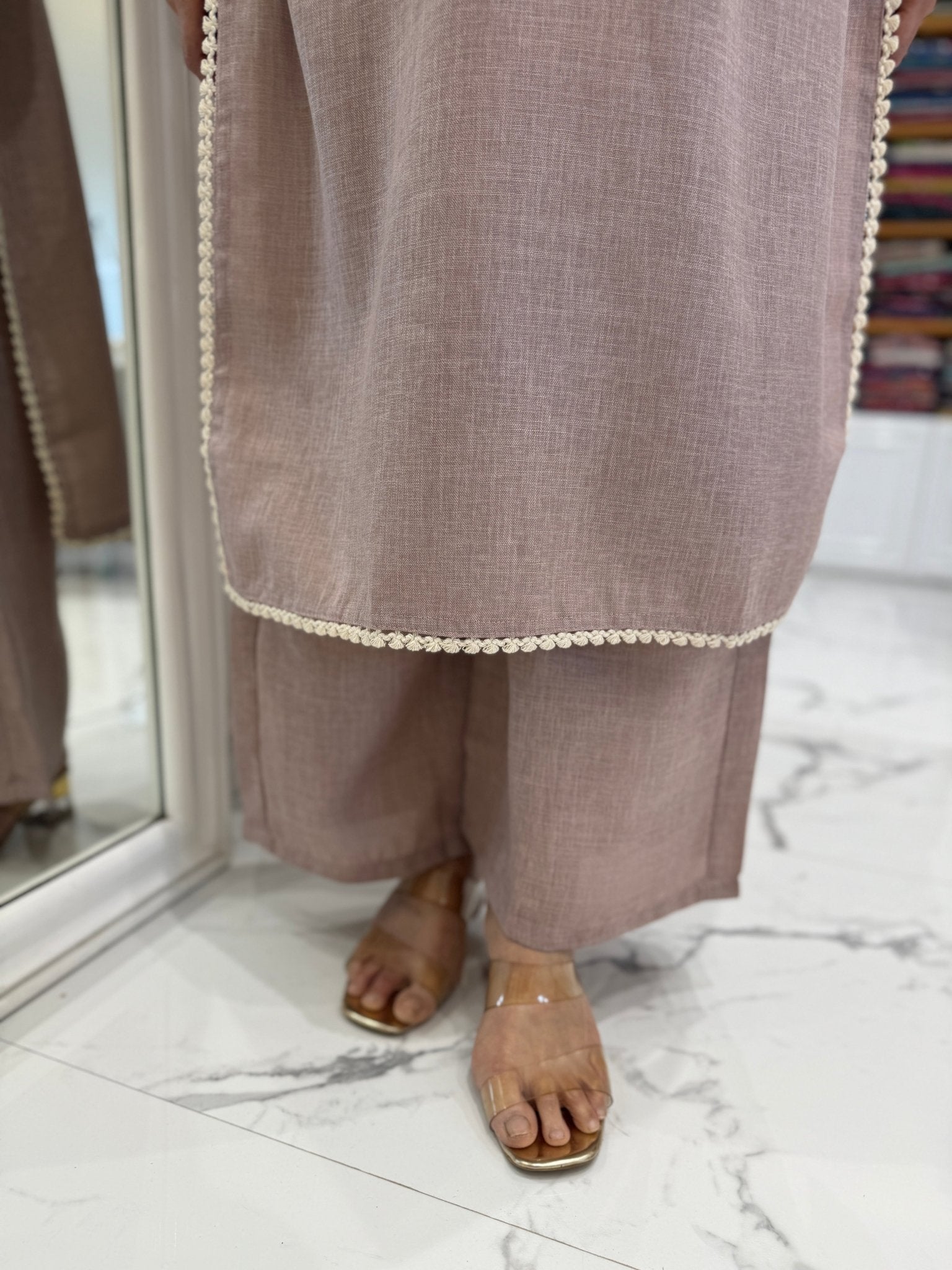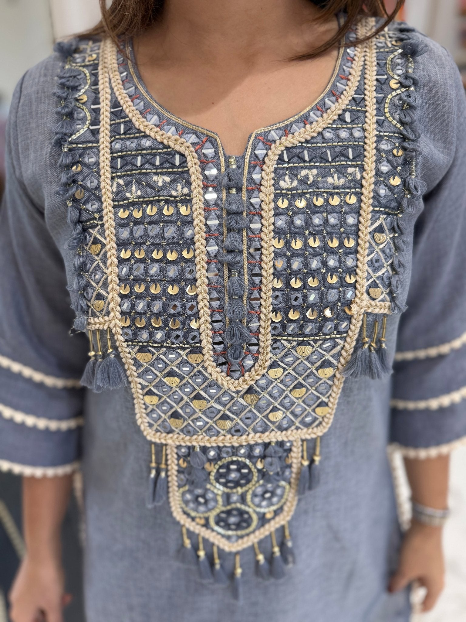 Soft cotton co-ord set featuring delicate mirror-work embroidery on the neckline, paired with comfortable palazzo pants for an elegant, effortless look.