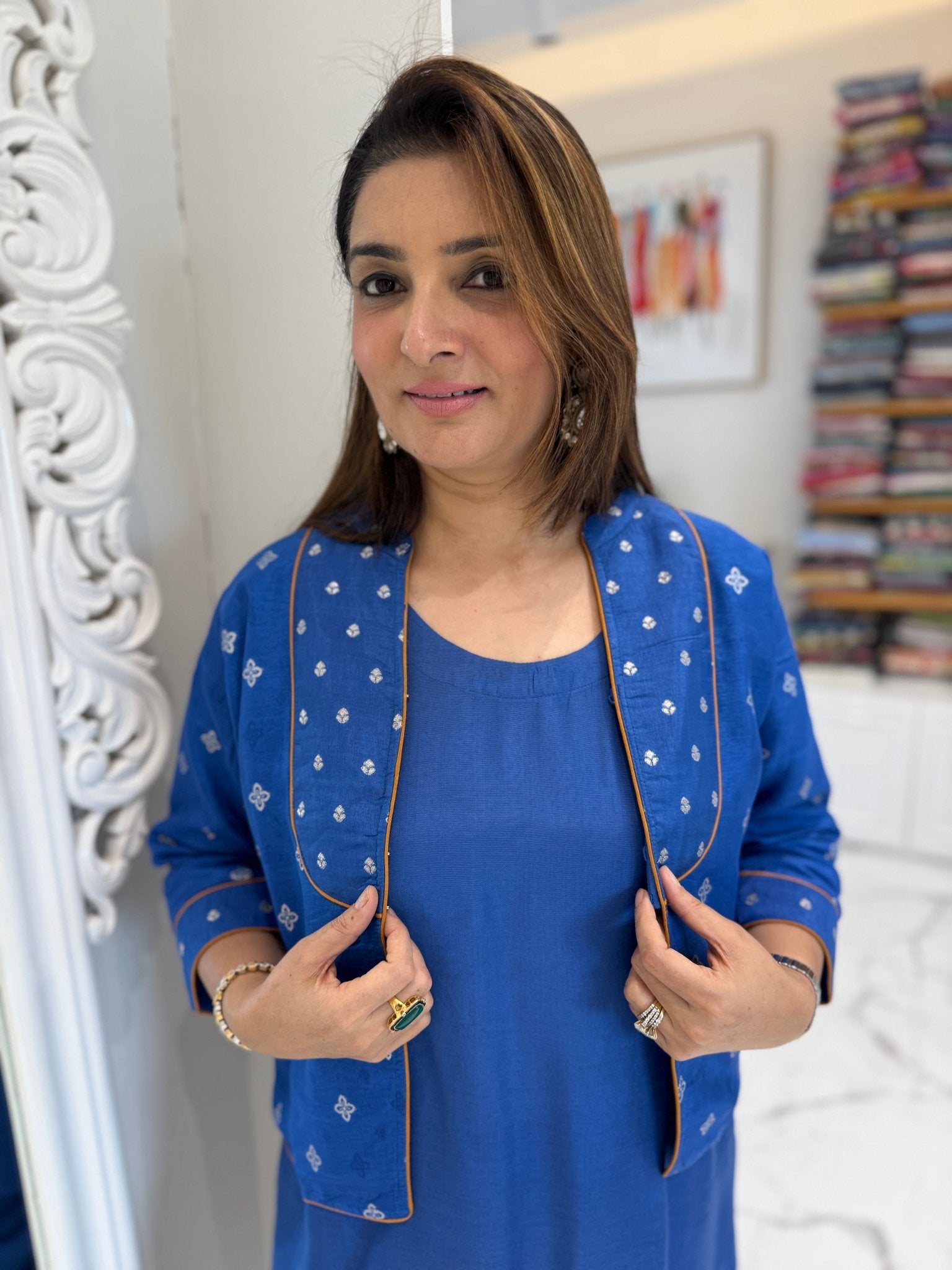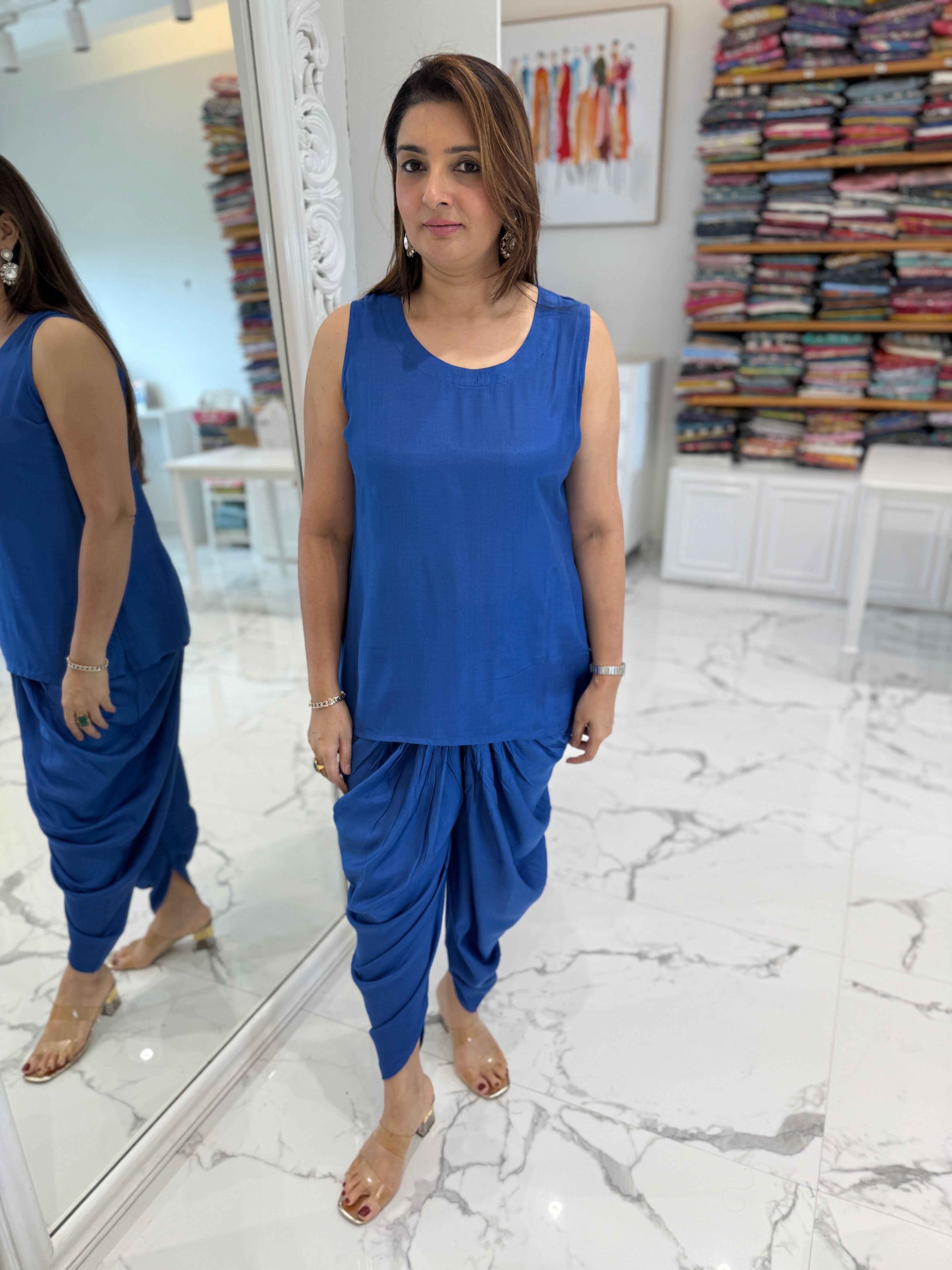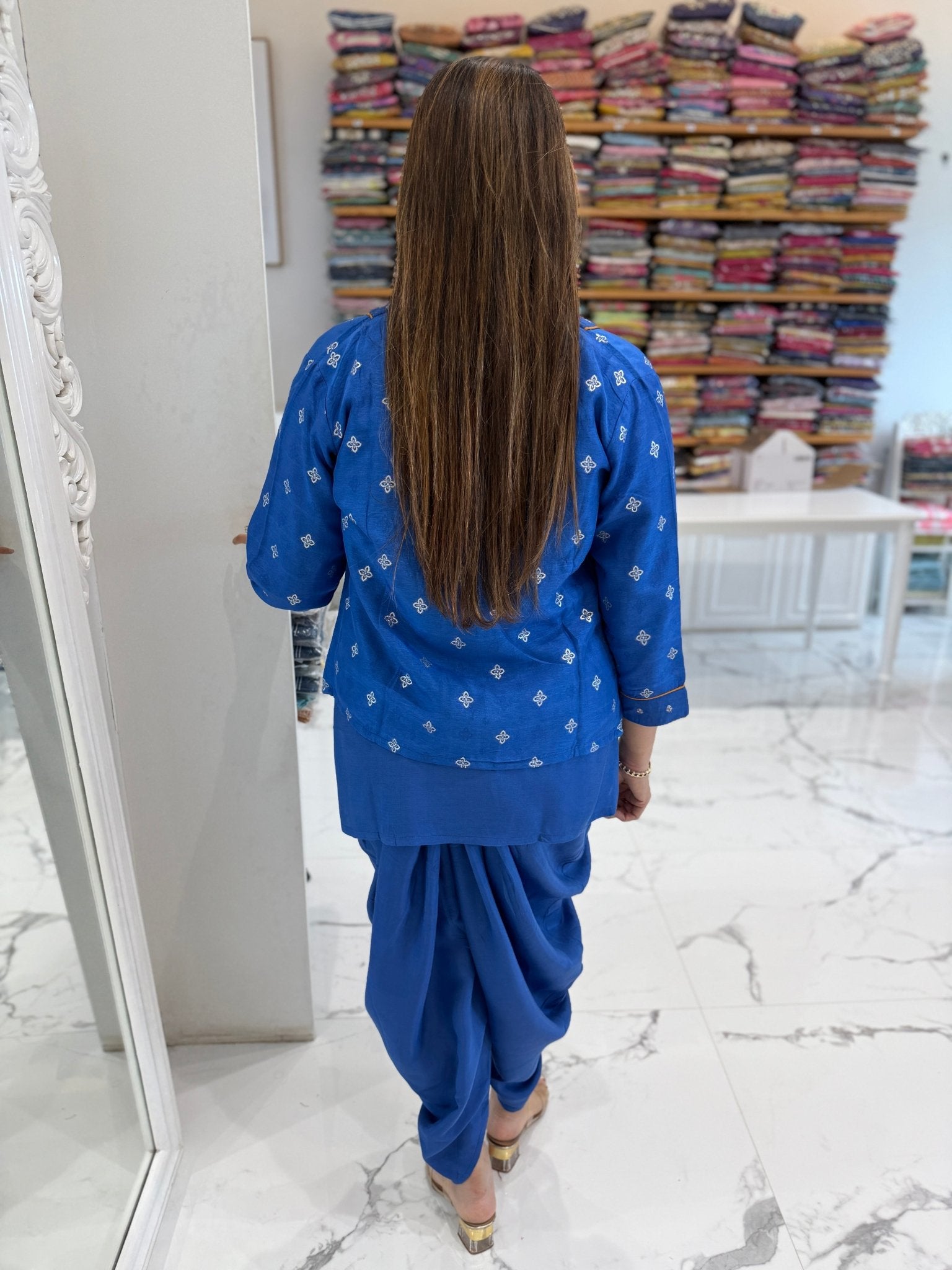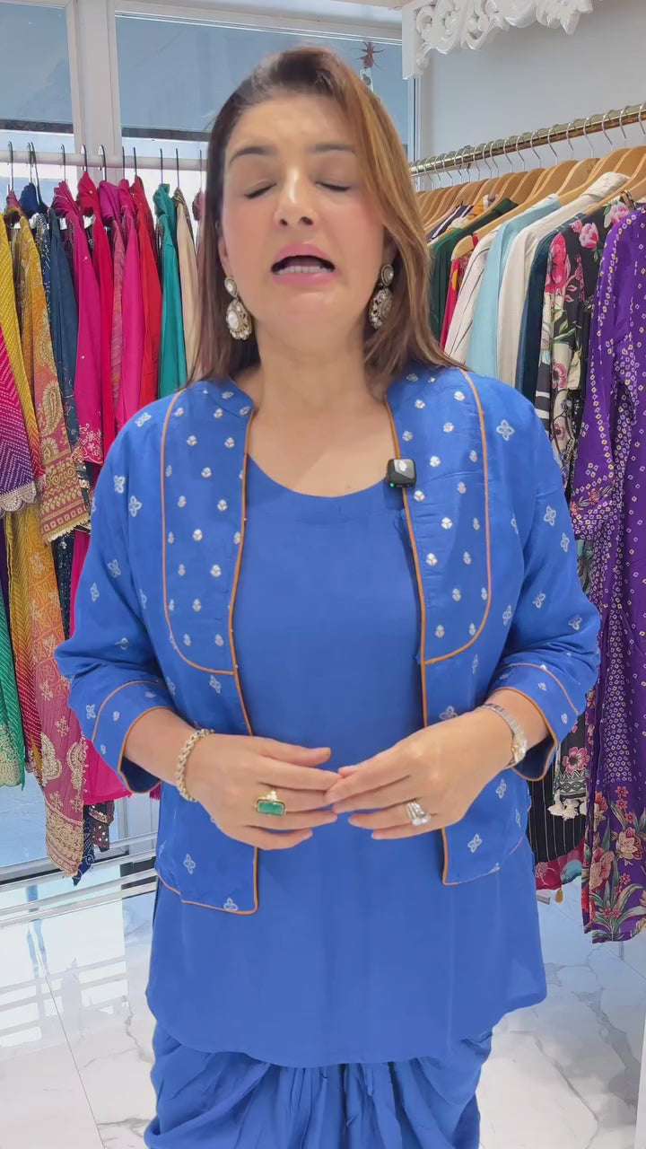 A stylish royal blue three-piece co-ord set featuring a sleeveless top, draped dhoti pants, and an embroidered jacket with golden piping. Made from soft, breathable fabric — perfect for festive wear or casual gatherings.