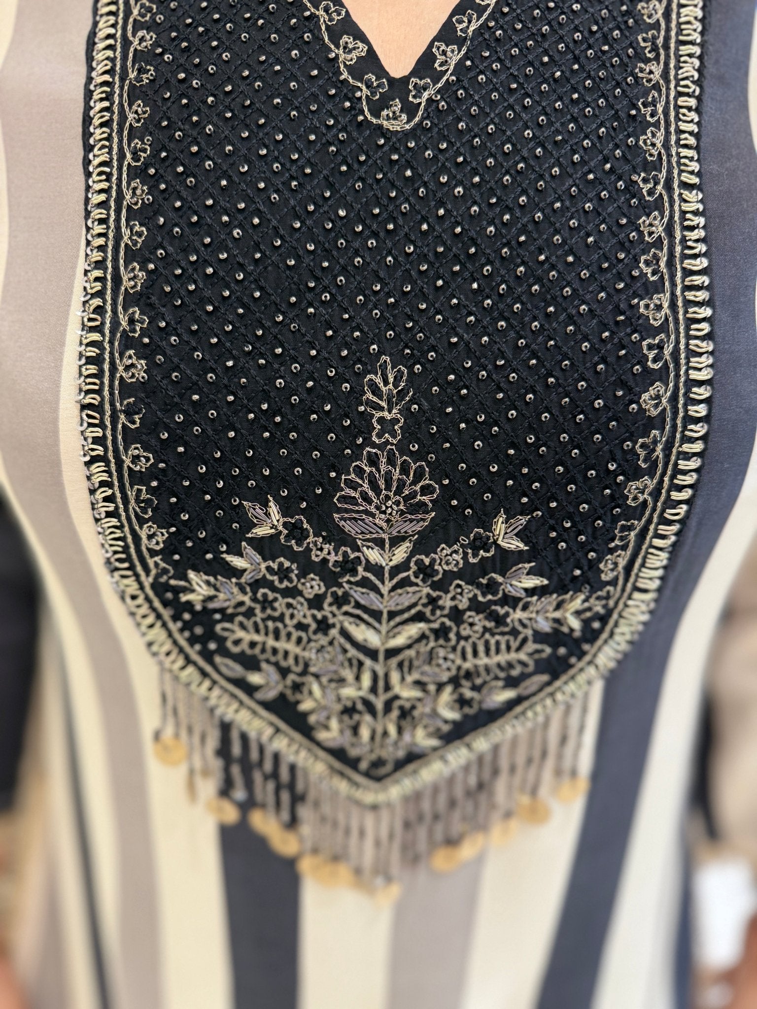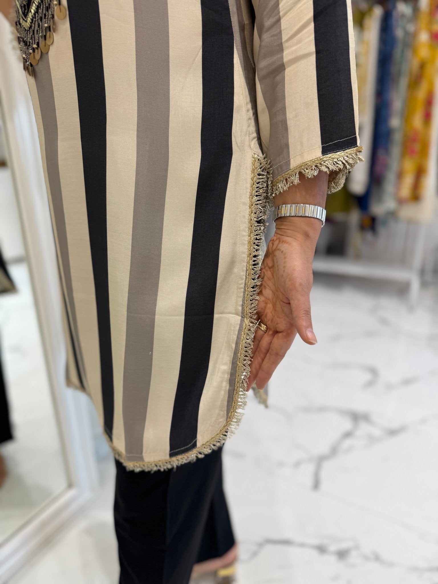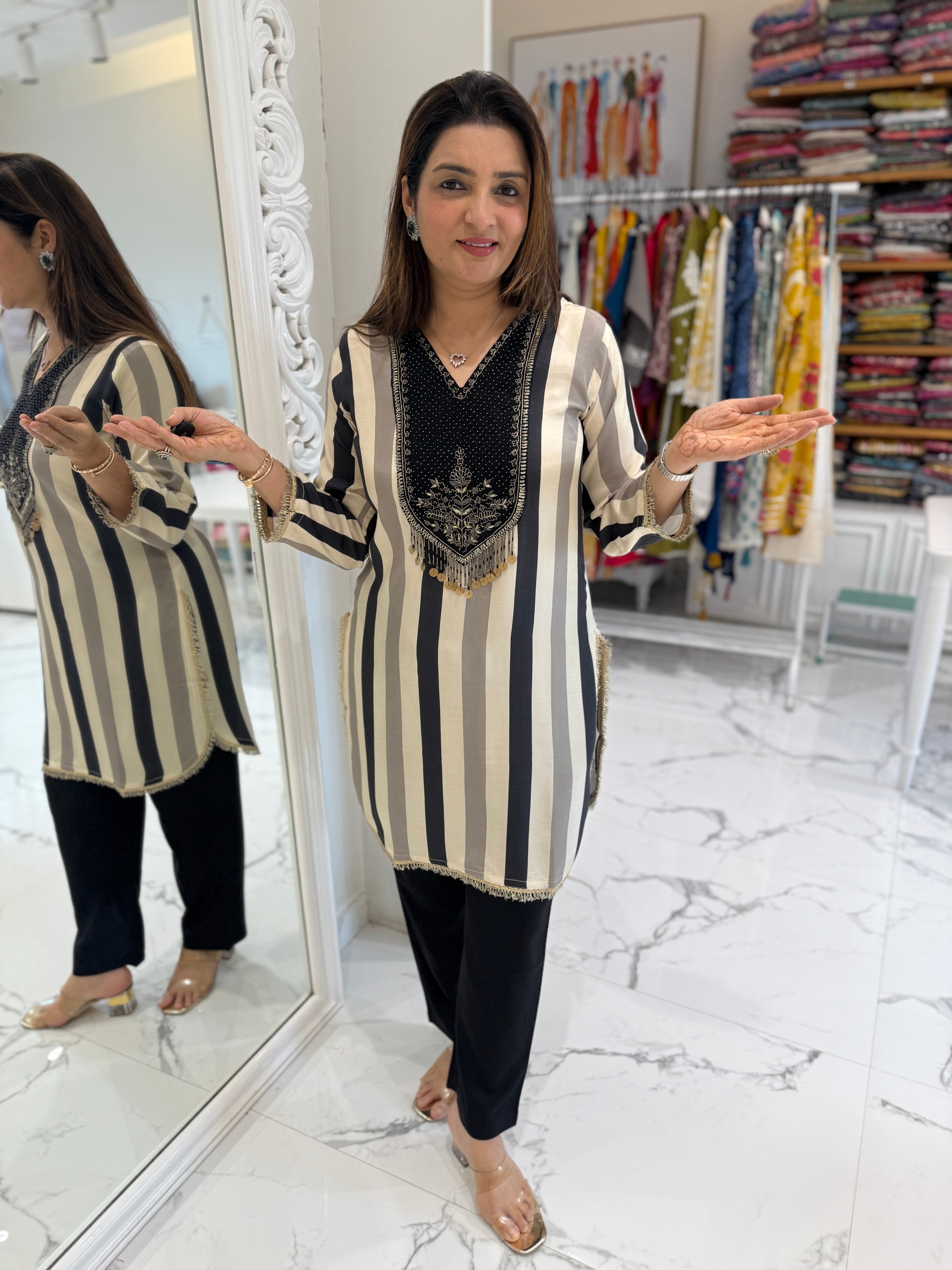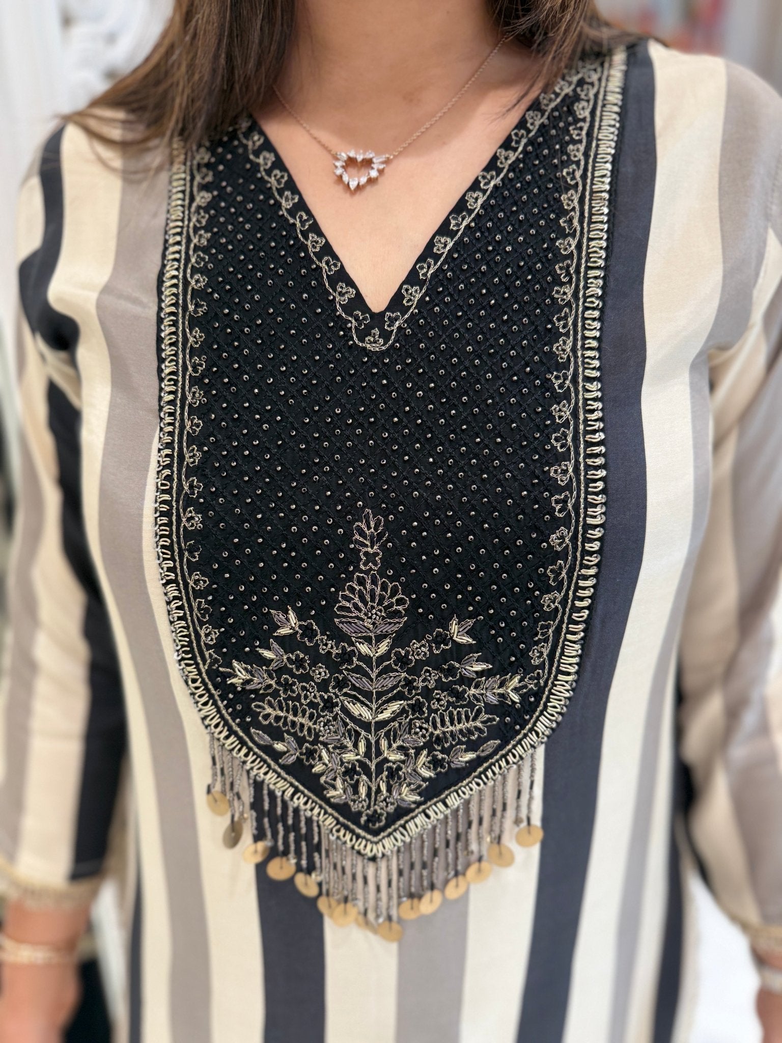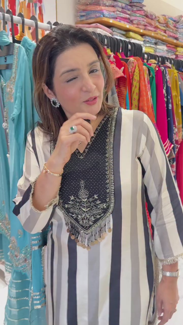 Crafted in soft, breathable pure muslin, this coord set features bold vertical stripes and detailed hand embroidery on the yoke with metallic thread and bead tassels. The black pants include side stripe accents for a coordinated look.
