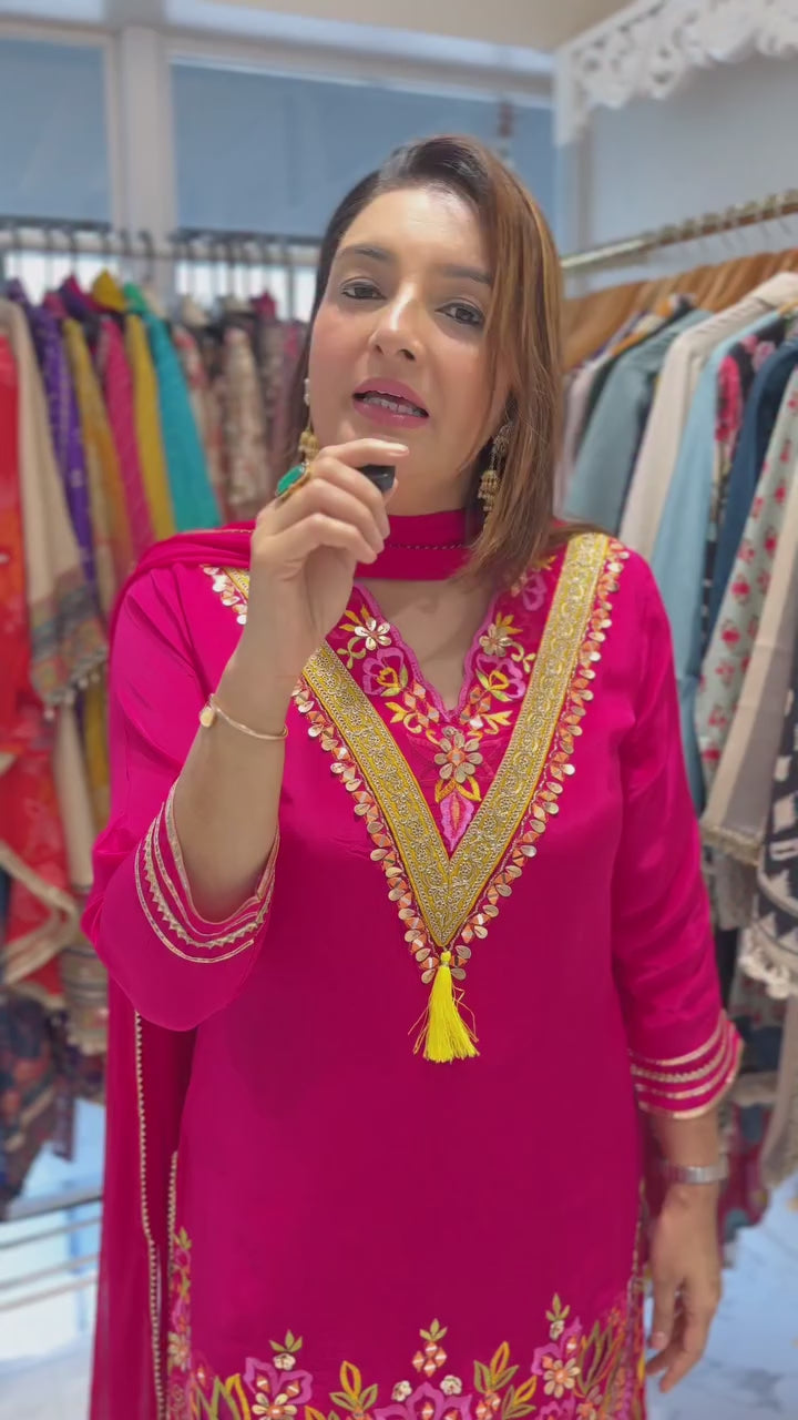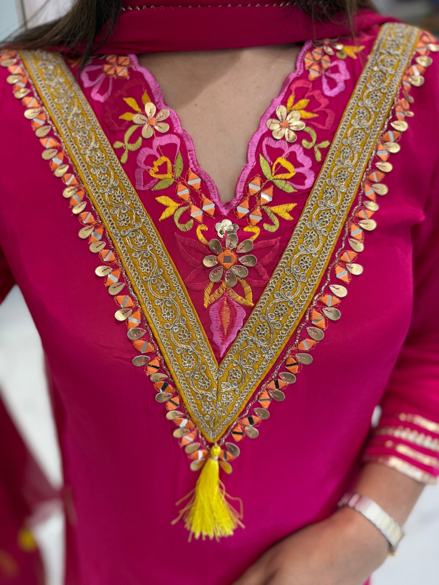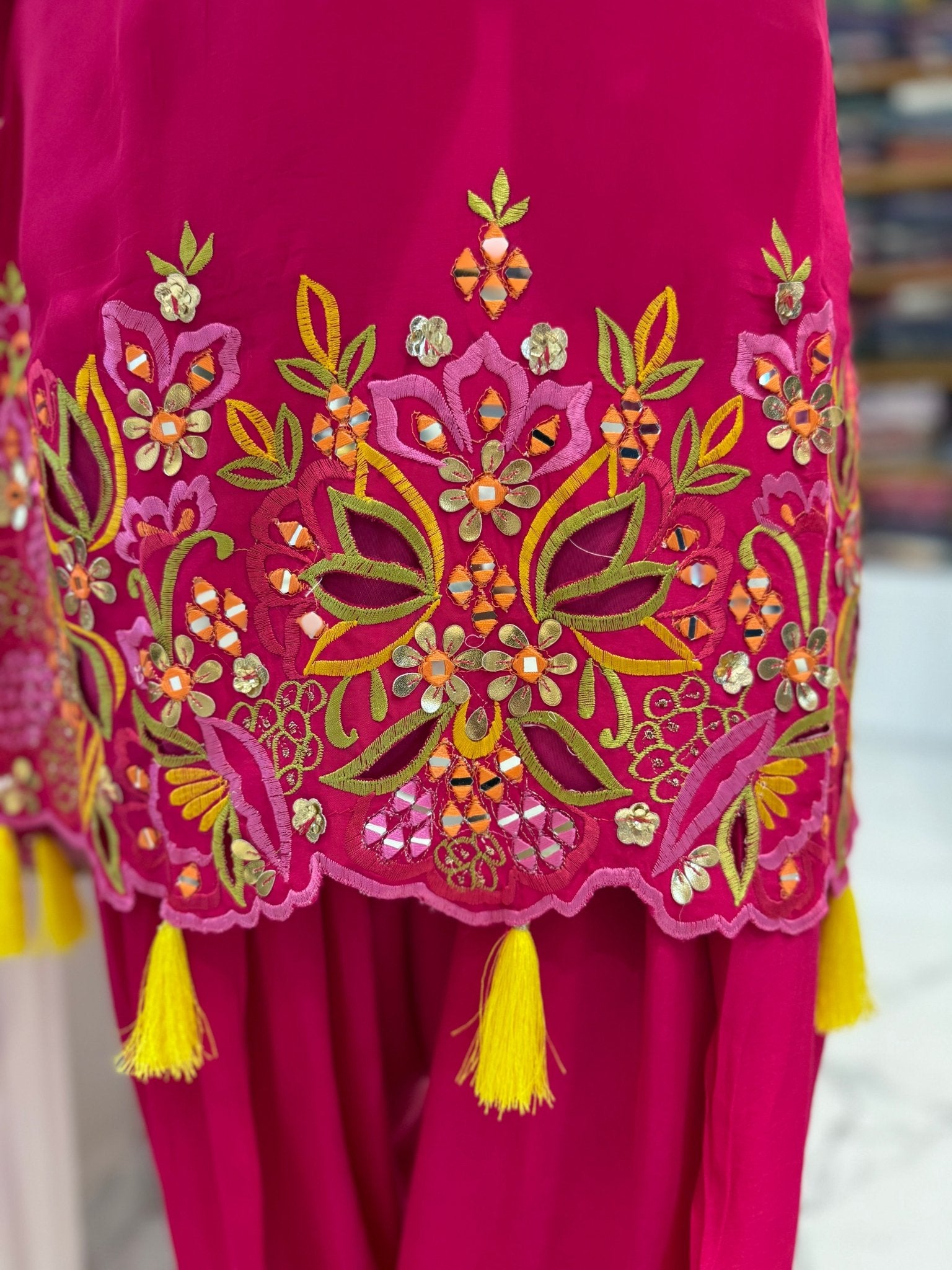 A beautiful emerald green Farshi salwar set in pure muslin silk, featuring vibrant mirror and thread embroidery, cut work detailing, and playful pink tassels. Paired with a soft chiffon dupatta.