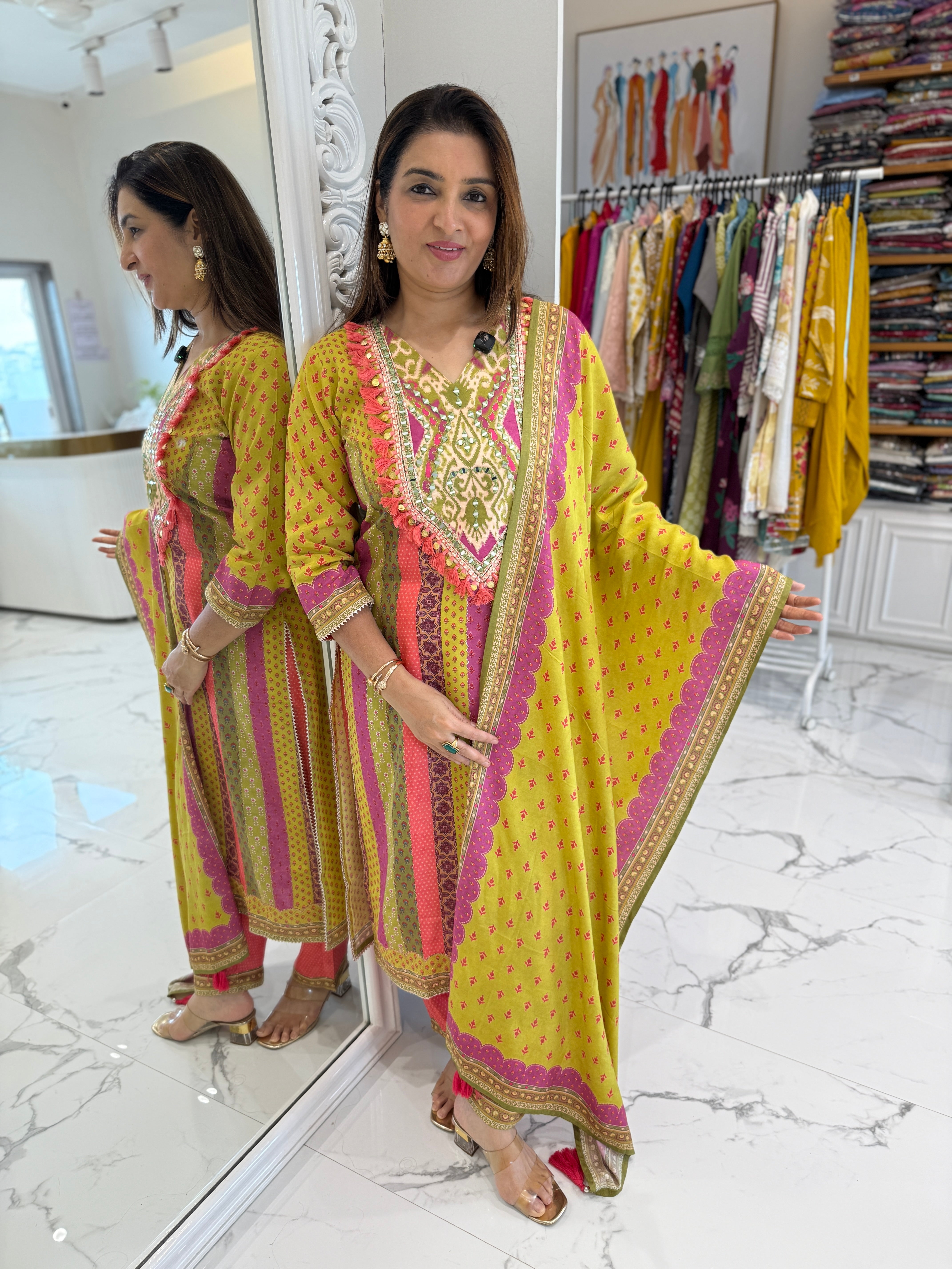 Vibrant muslin suit set with mirror work detailing and a bold mix of orange and pink hues. Paired with matching printed pants and a flowy dupatta for a festive-ready look.