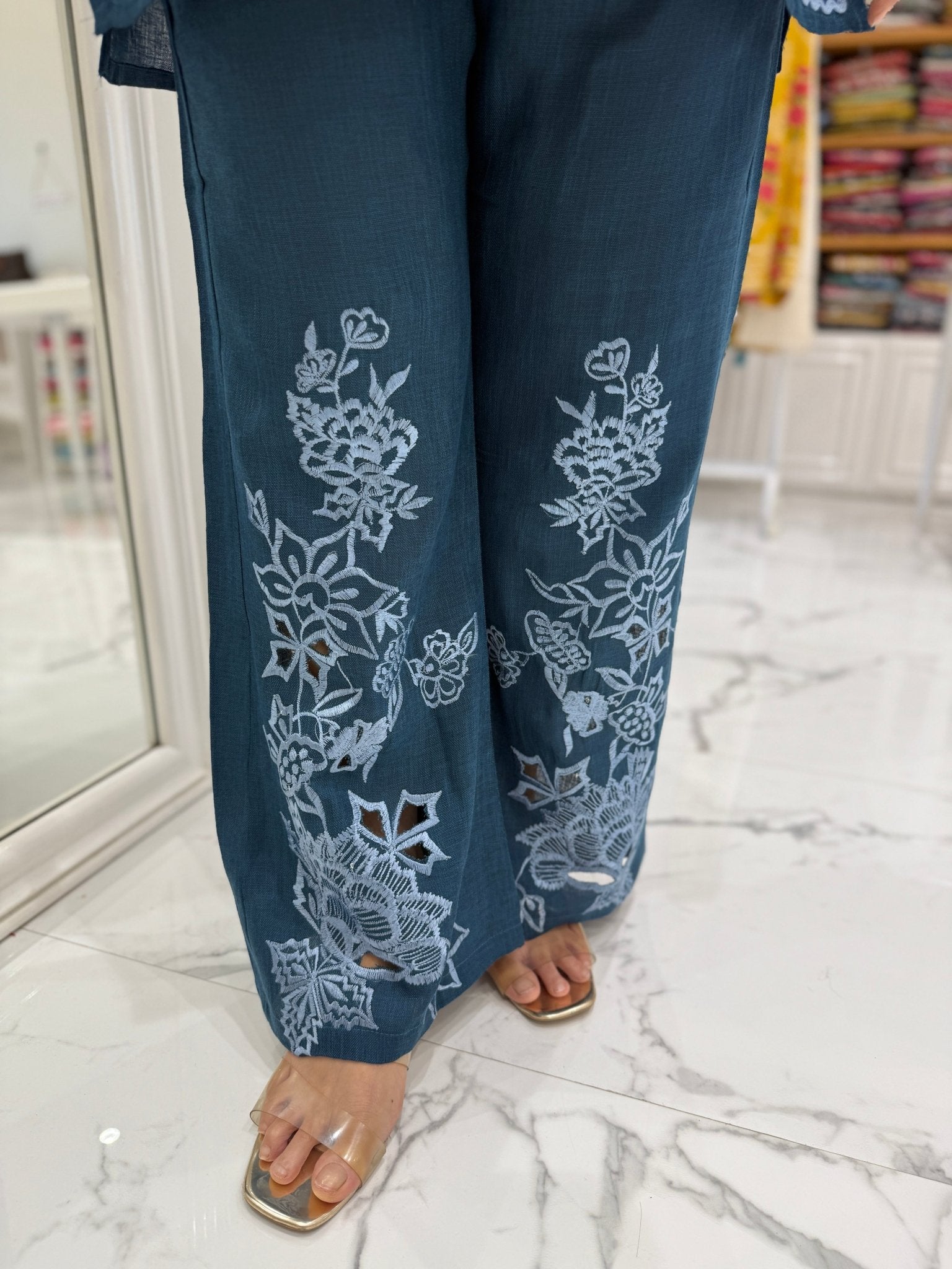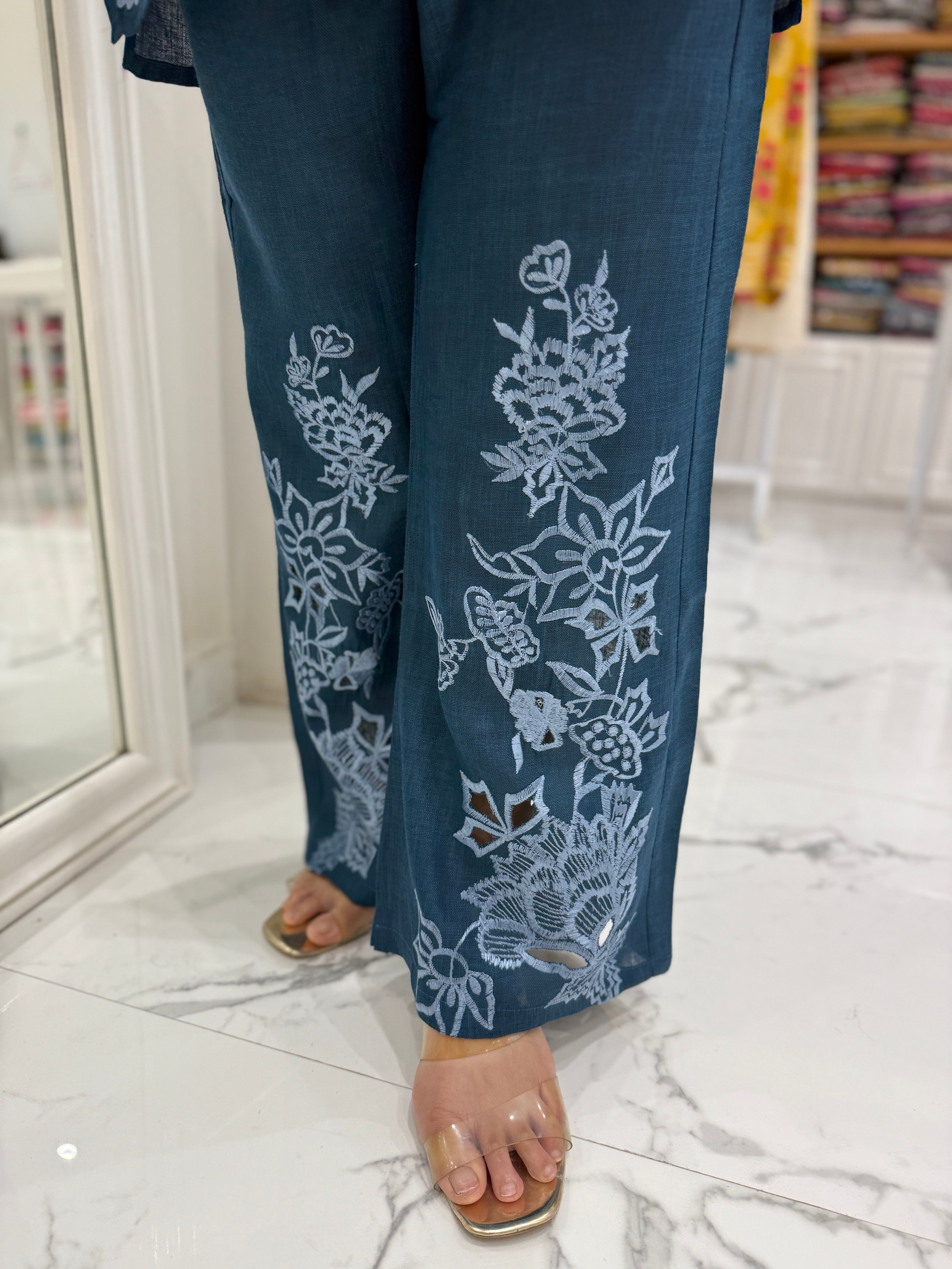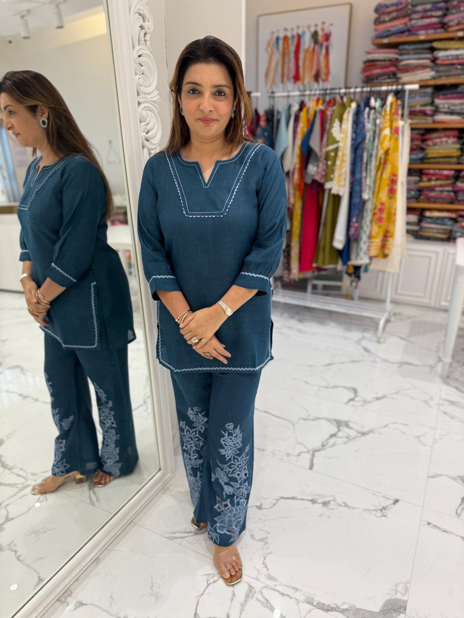 This is our cotton Indo-Western co-ord set with beautiful cutwork detailing. The fabric is soft, breathable, and has a nice subtle shine. It comes with boot-cut pants that have elegant embroidery—perfect for a stylish and comfortable look.