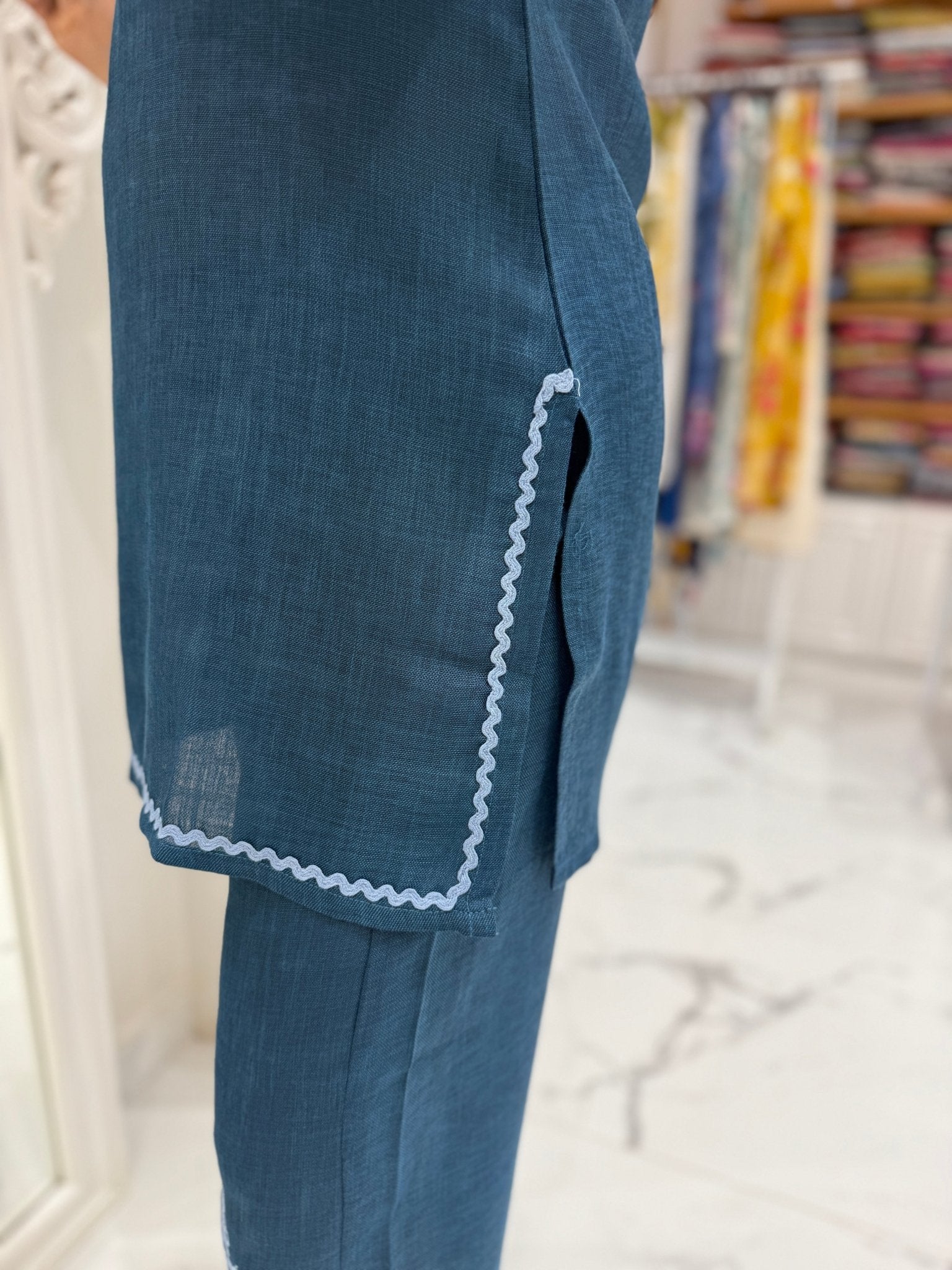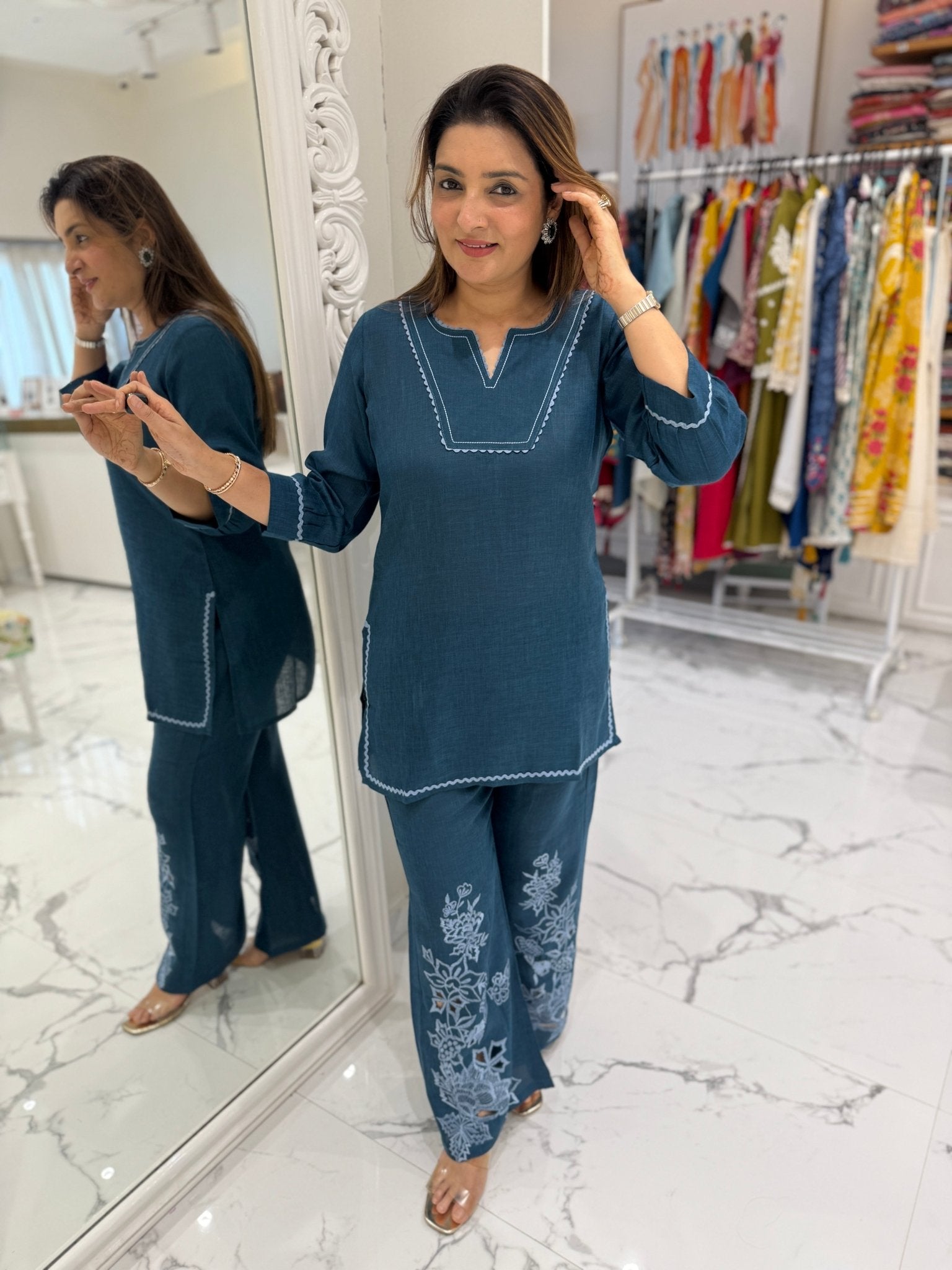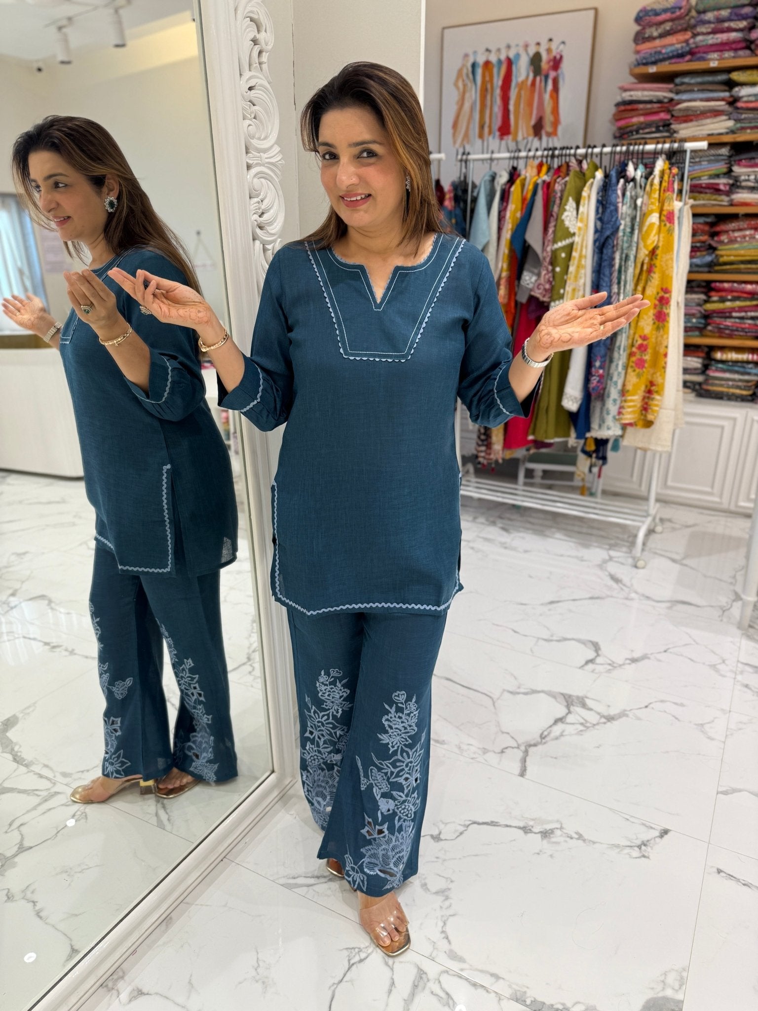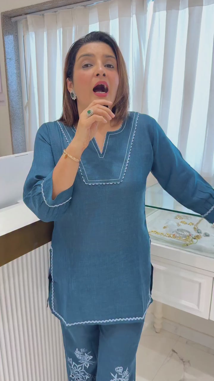This is our cotton Indo-Western co-ord set with beautiful cutwork detailing. The fabric is soft, breathable, and has a nice subtle shine. It comes with boot-cut pants that have elegant embroidery—perfect for a stylish and comfortable look.