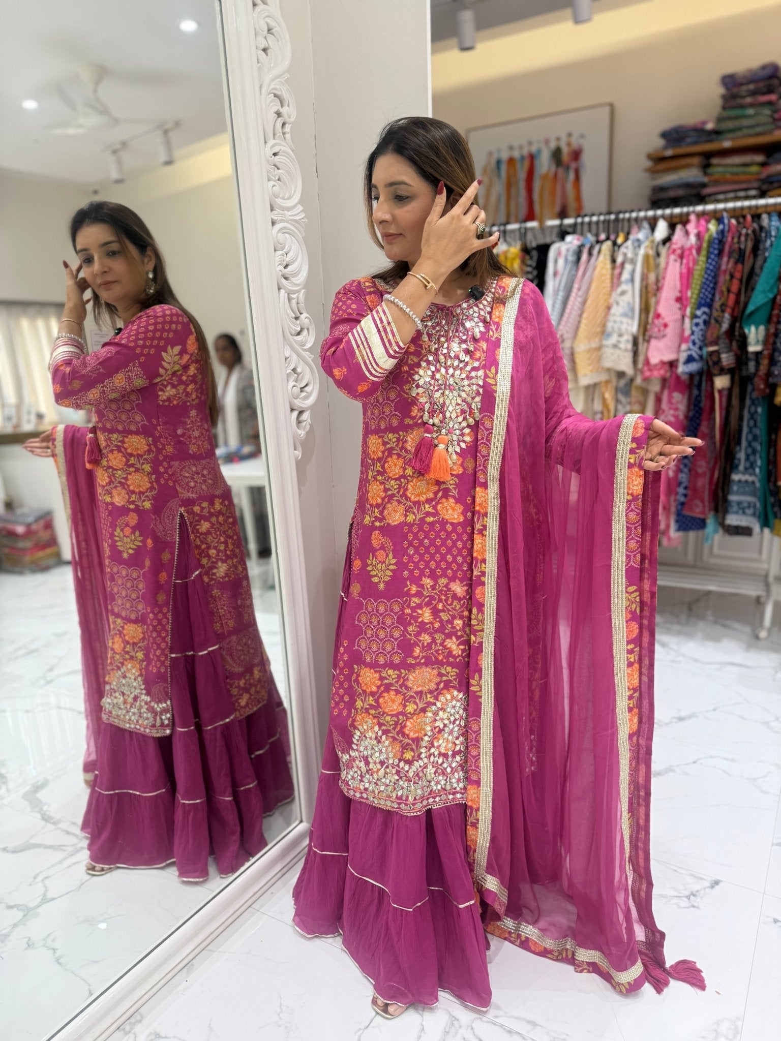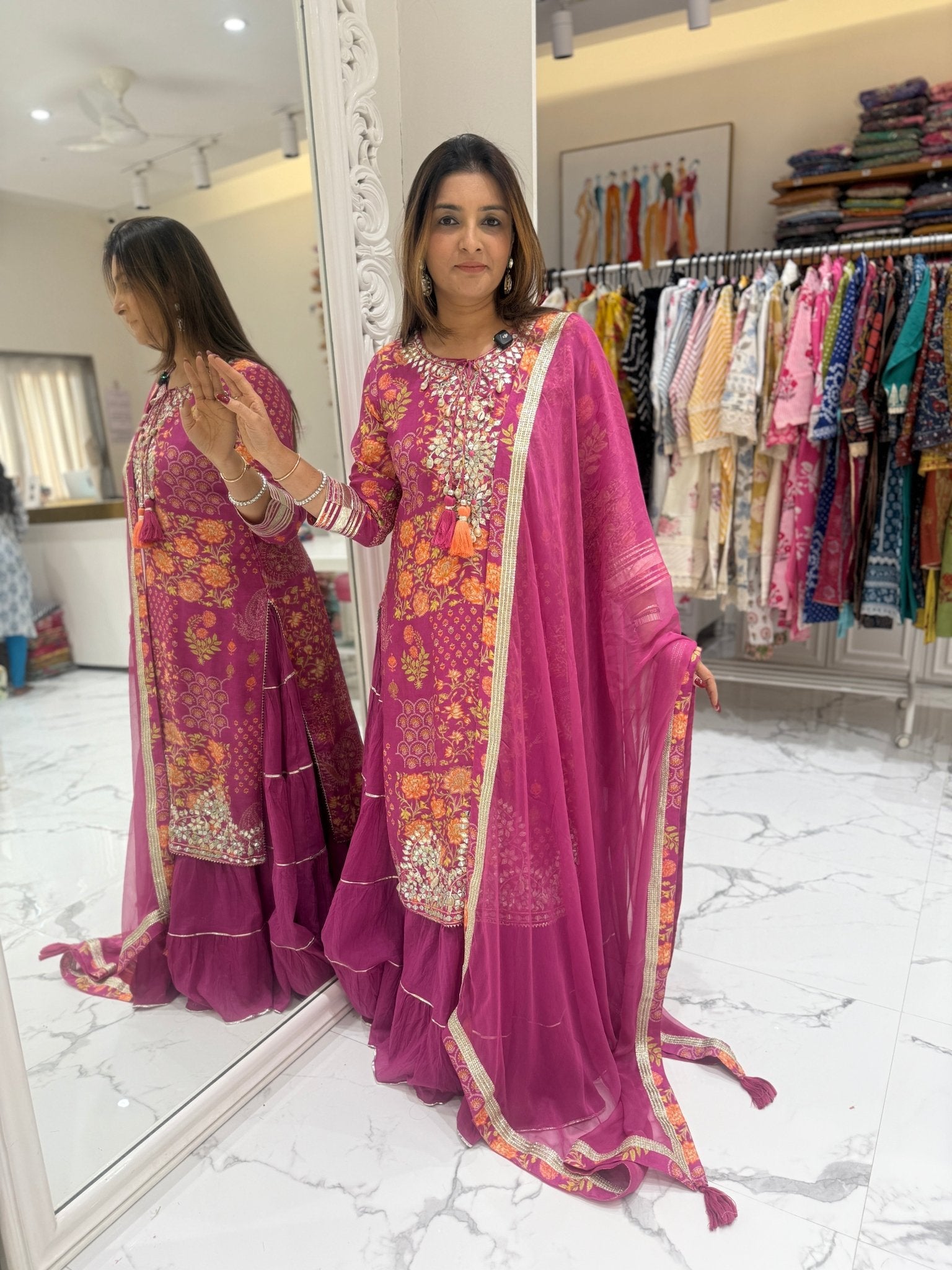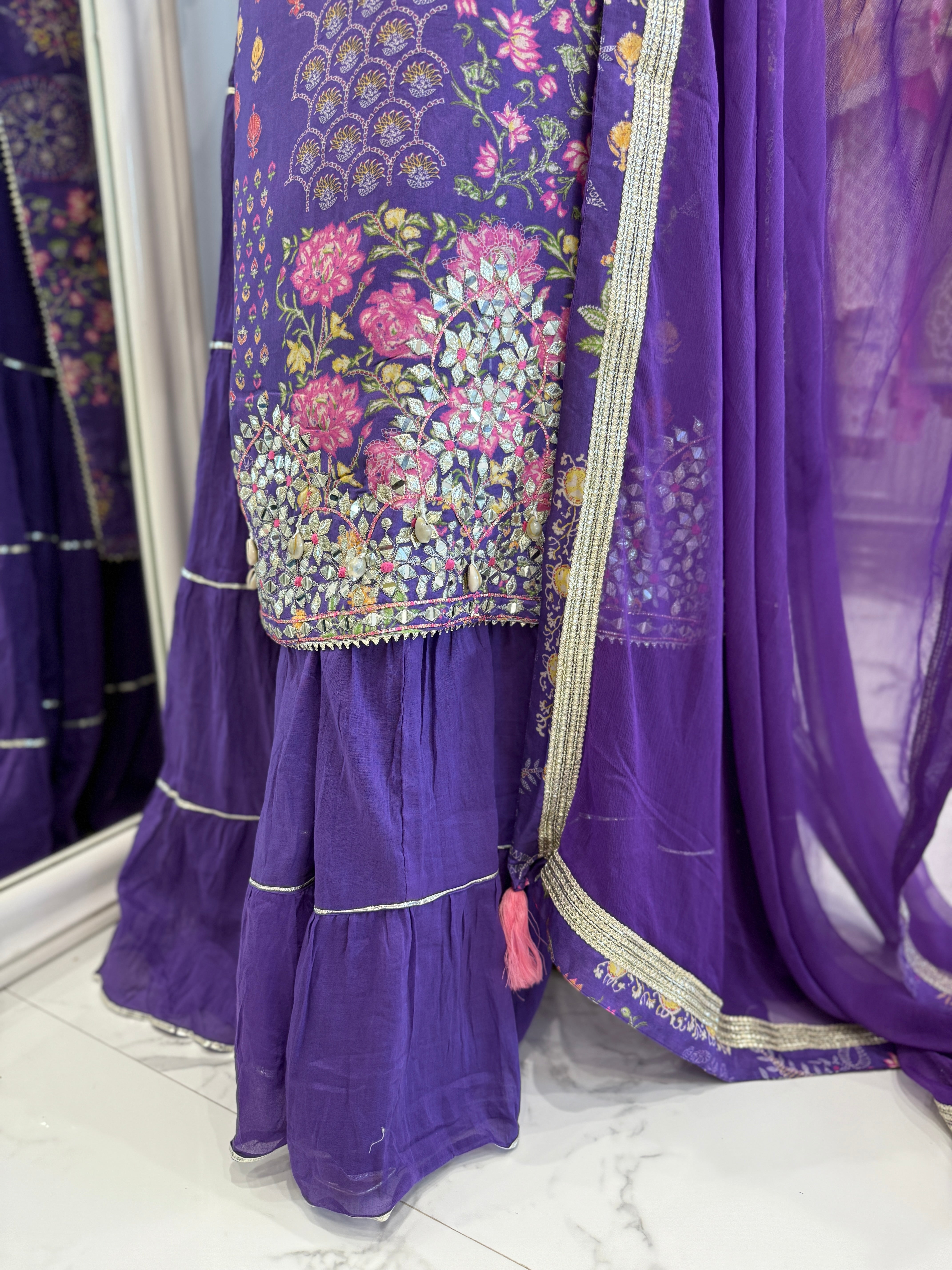 This pure muslin one-piece outfit features a painting-inspired floral print with delicate gota embellishments. It has a soft, flowy cotton inner skirt with gota patti detailing on the cuffs, skirt, and hem, paired with a pure chiffon dupatta finished with elegant zari lace.