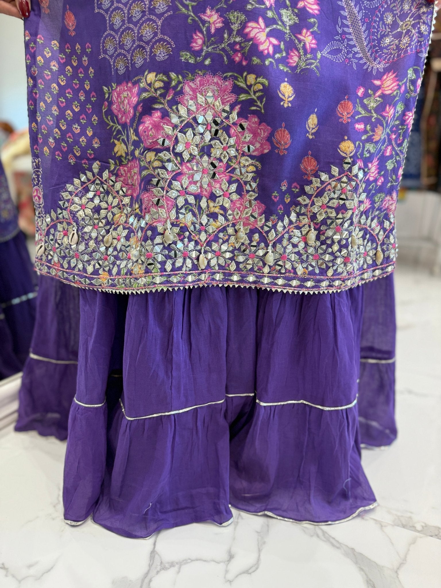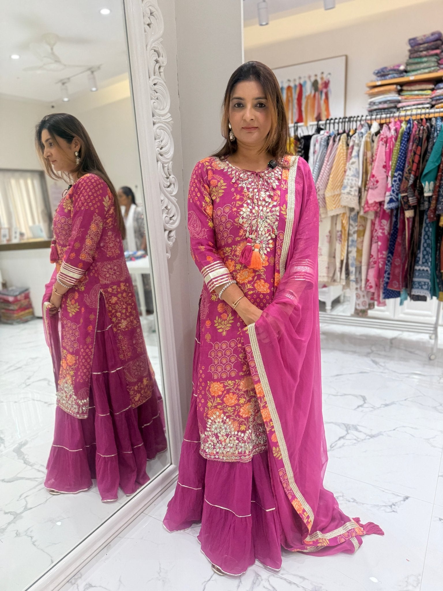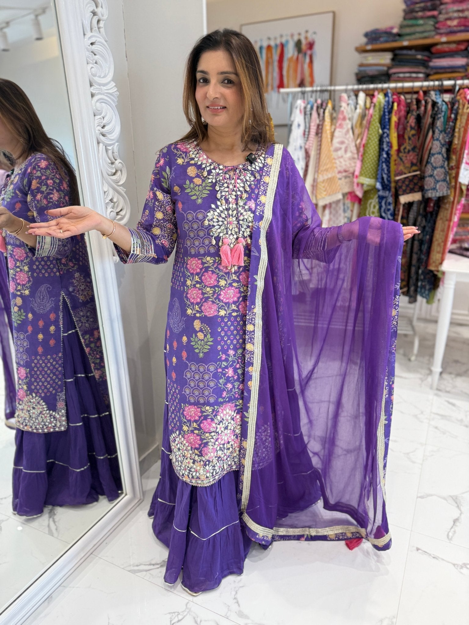 This pure muslin one-piece outfit features a painting-inspired floral print with delicate gota embellishments. It has a soft, flowy cotton inner skirt with gota patti detailing on the cuffs, skirt, and hem, paired with a pure chiffon dupatta finished with elegant zari lace.