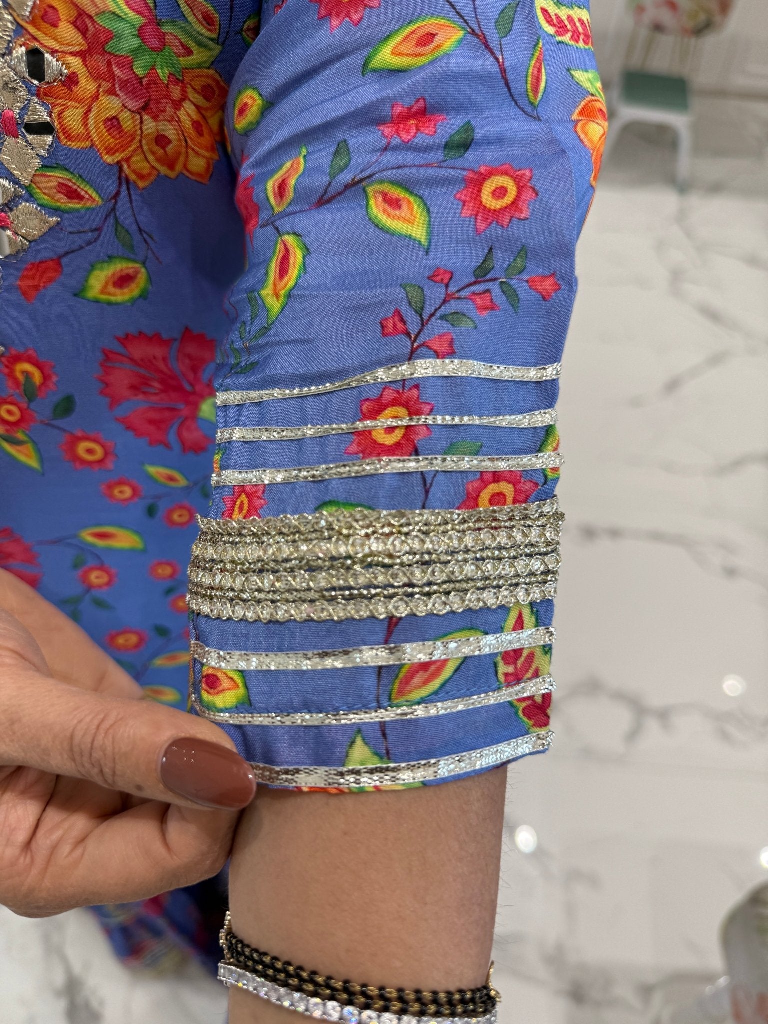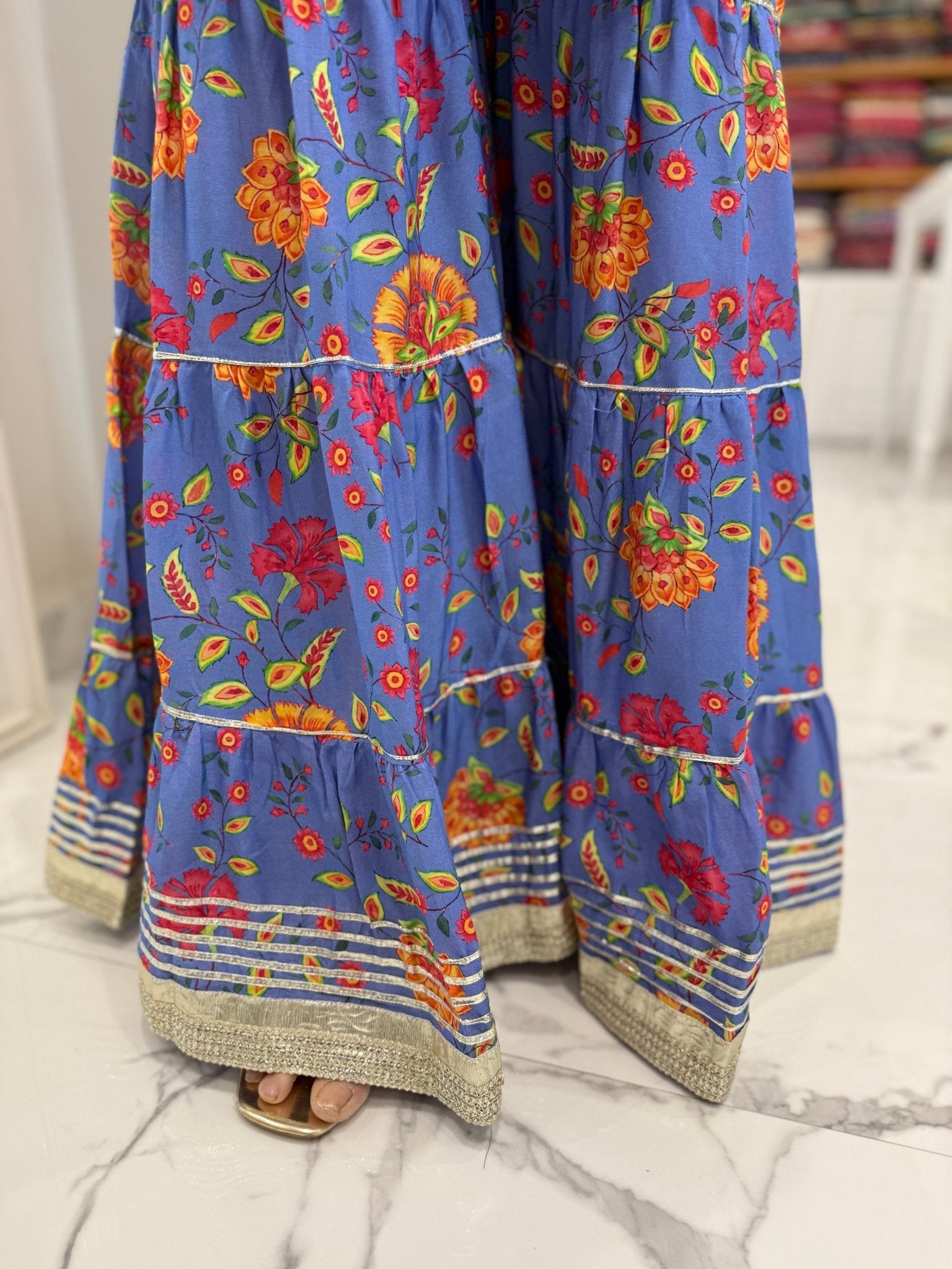 This elegant 3-piece sharara set features a richly detailed kurta with Gota  and mirror work on the neckline, sleeves, and daman. It is paired with a flowy sharara and a lightweight chiffon dupatta.