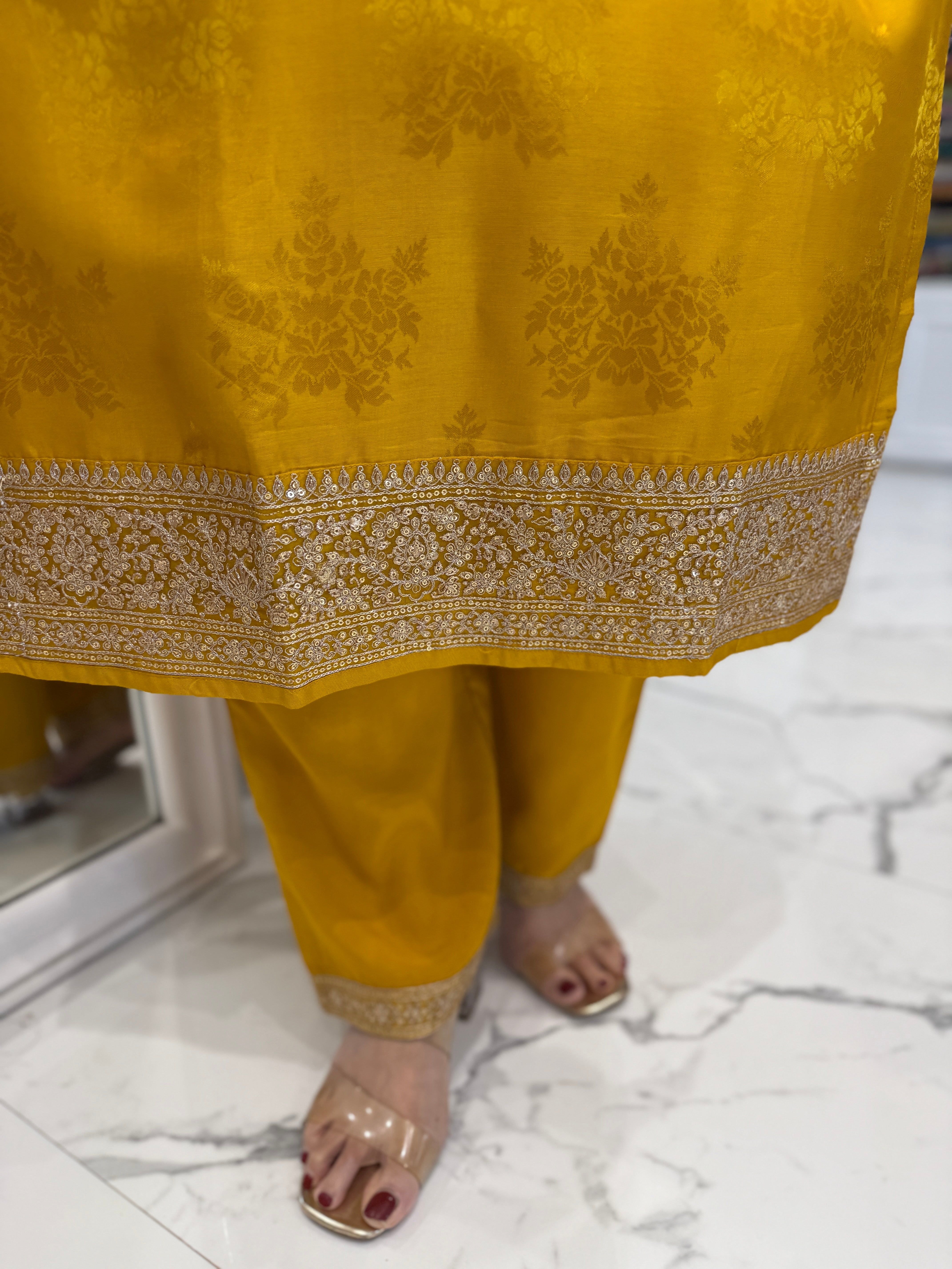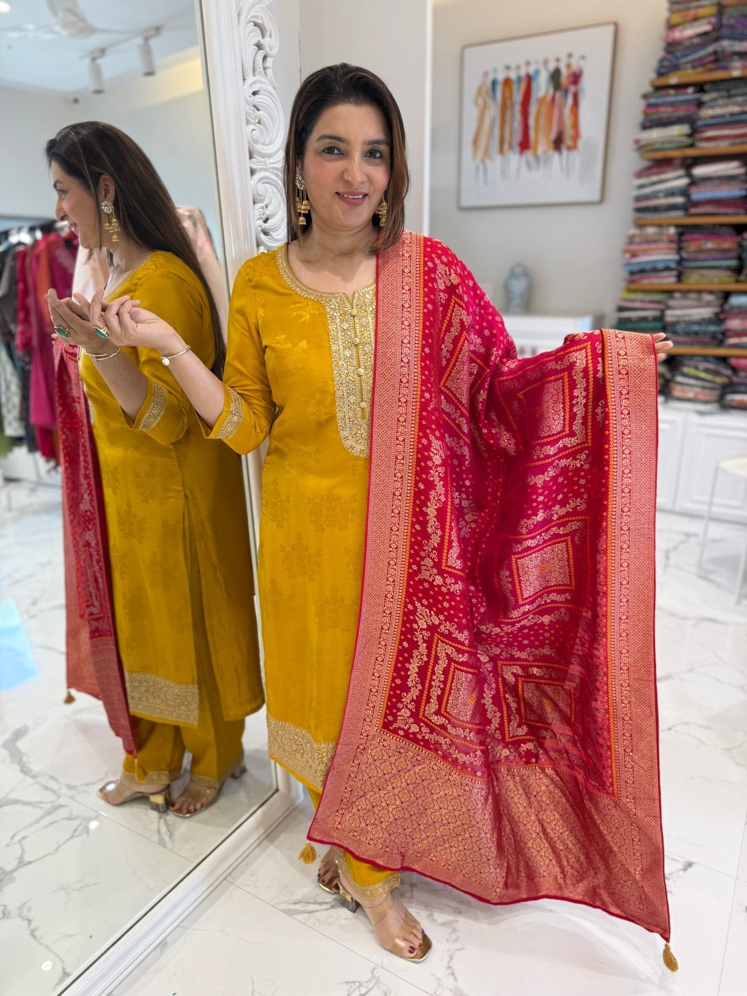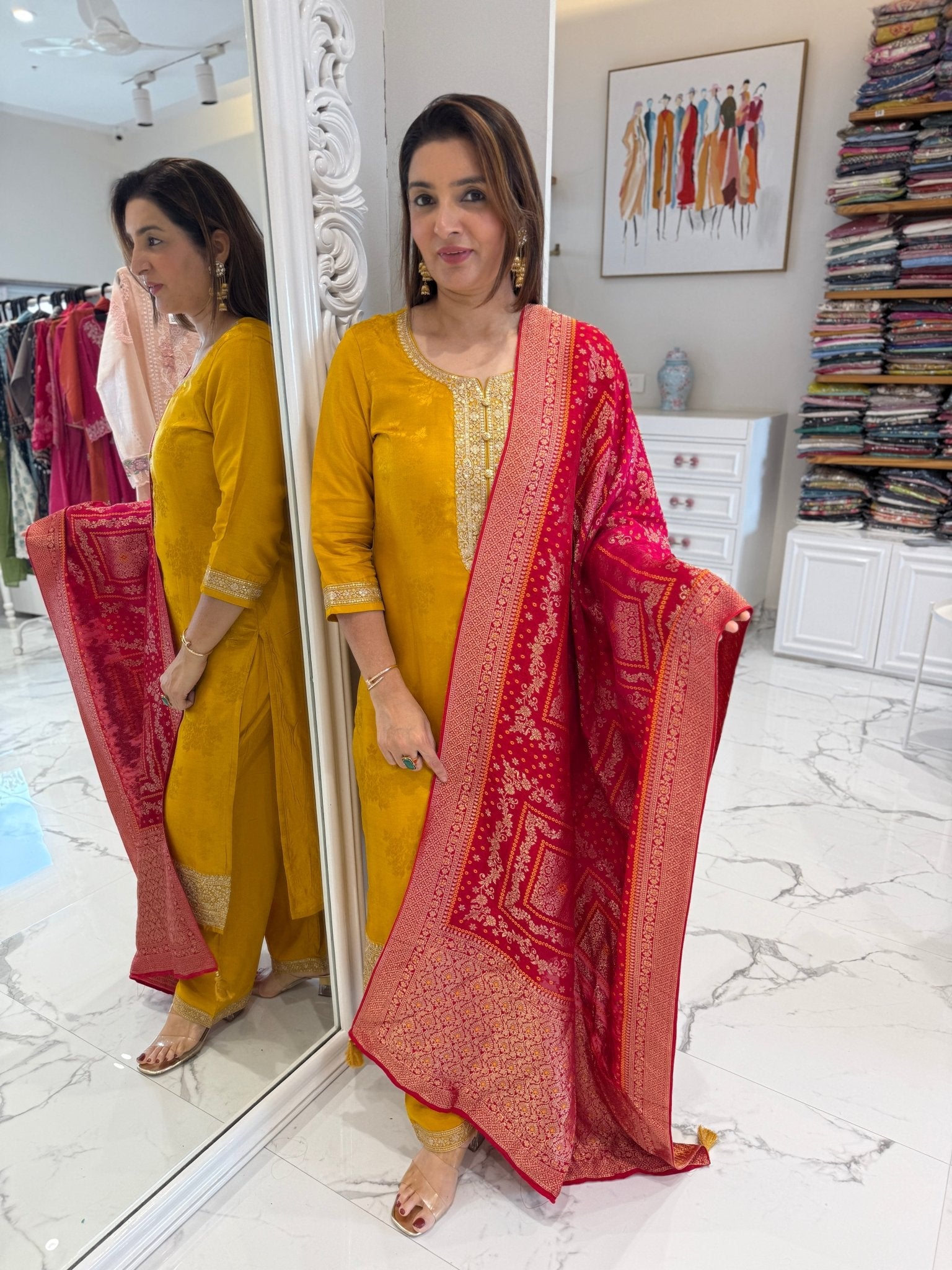 A graceful mustard yellow suit set adorned with delicate sequin and zari embroidery on the neckline and hem. Paired with chic straight pants and a rich Banarasi dupatta in vibrant red, this ensemble blends elegance with timeless tradition.