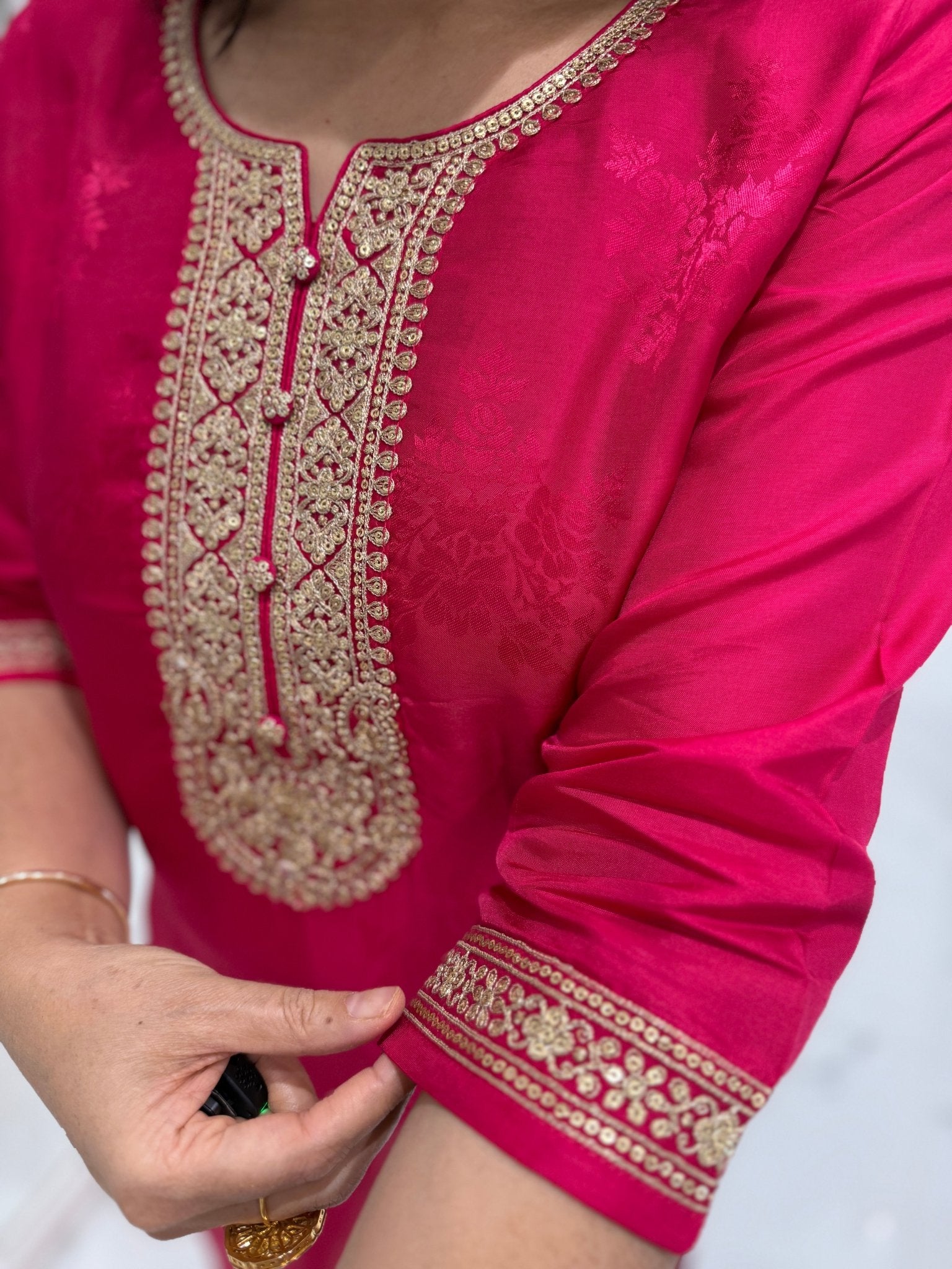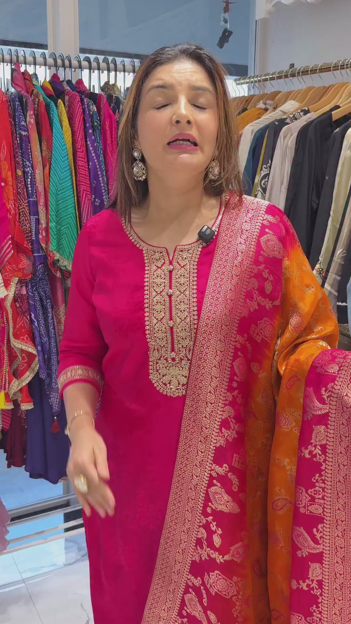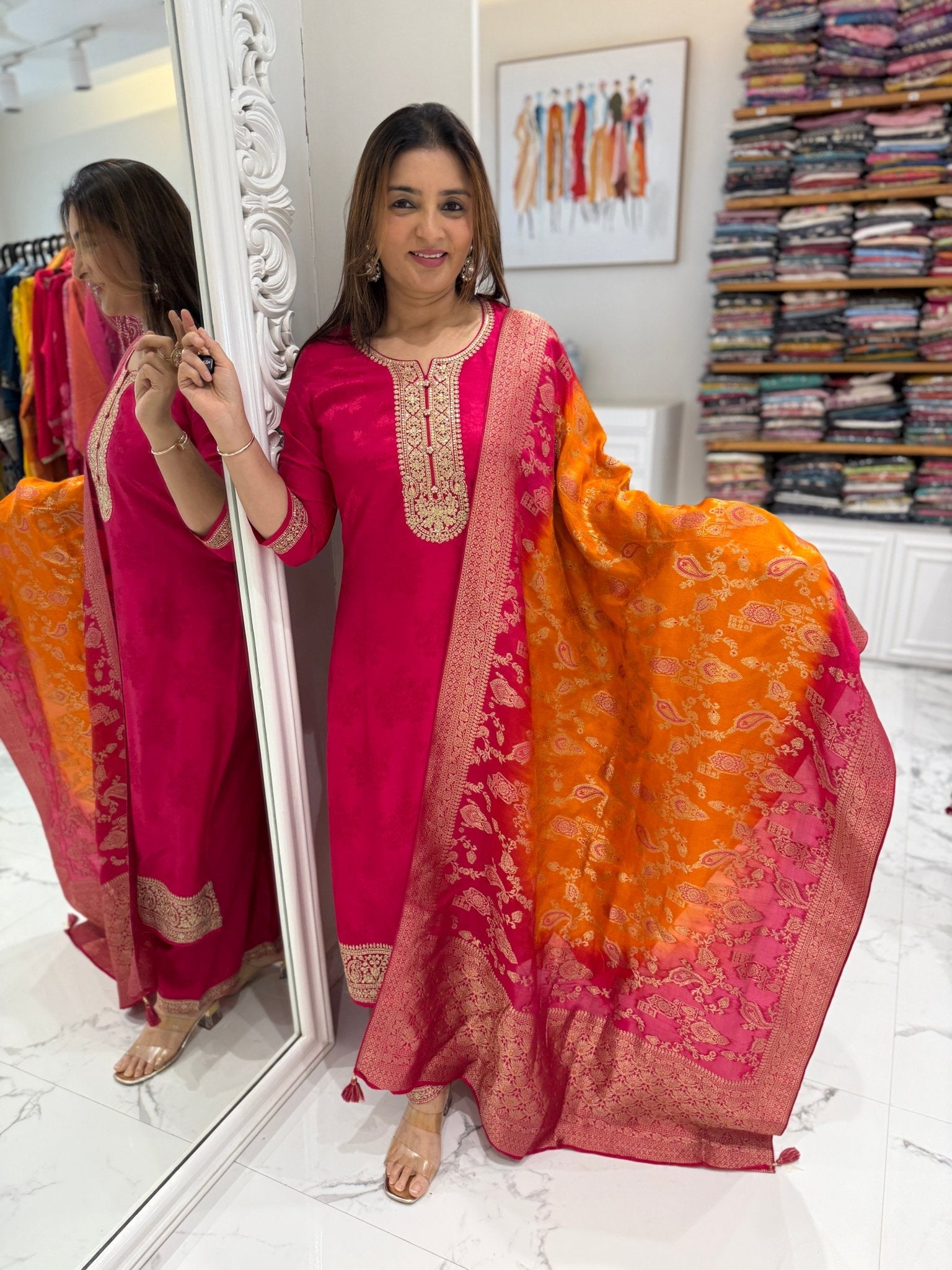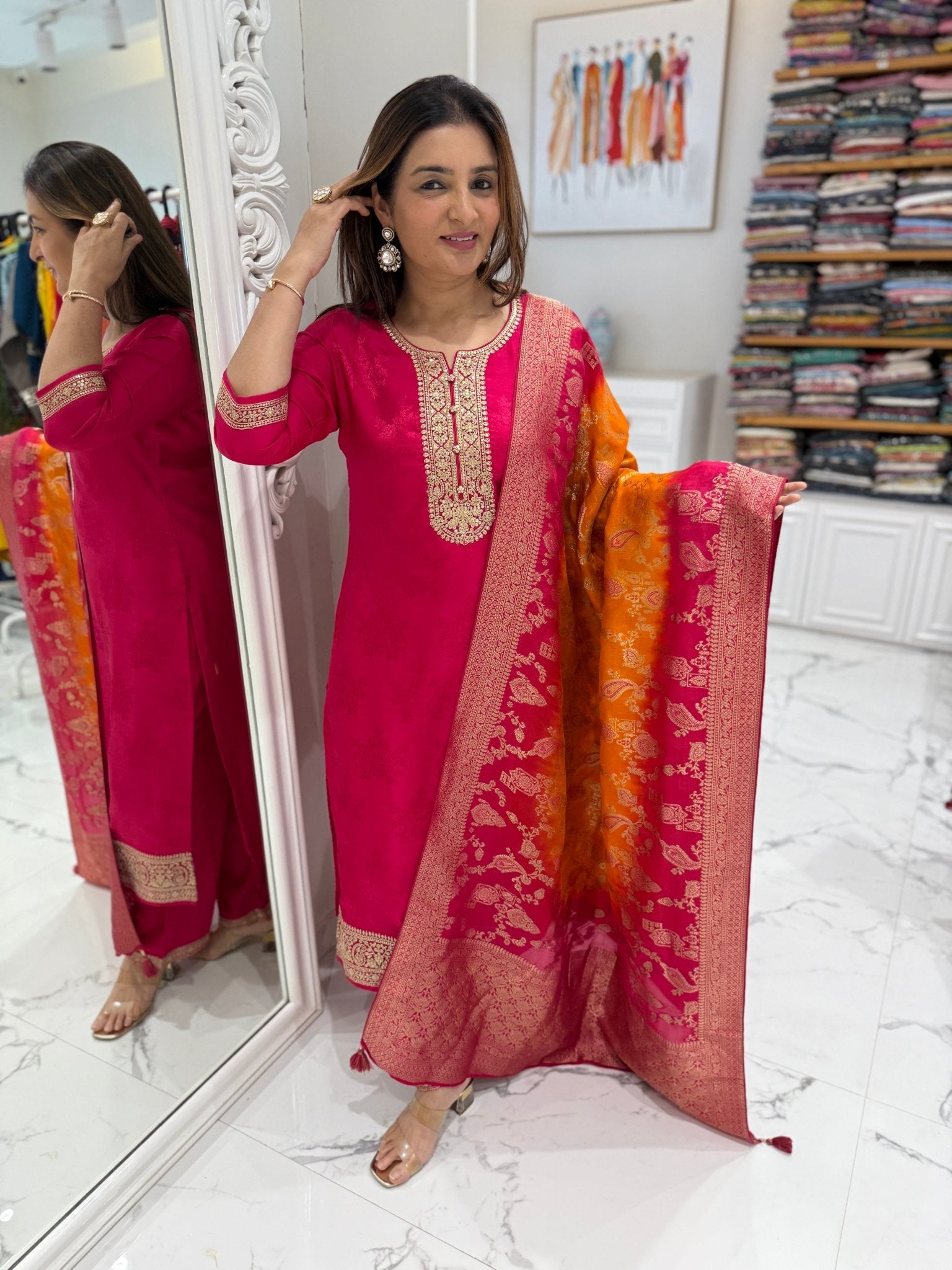 A graceful mustard yellow suit set adorned with delicate sequin and zari embroidery on the neckline and hem. Paired with chic straight pants and a rich Banarasi dupatta in vibrant red, this ensemble blends elegance with timeless tradition.