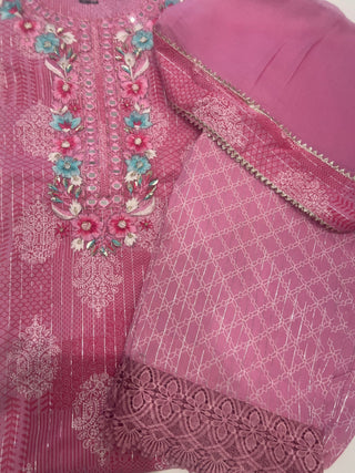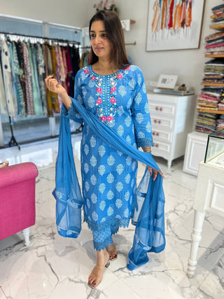 A cotton suit set featuring exquisite Parsi embroidery on the neckline and a soft chiffon dupatta. The kurta boasts delicate lace and fusion work, crafted from cotton fabric, paired with chic straight pants.