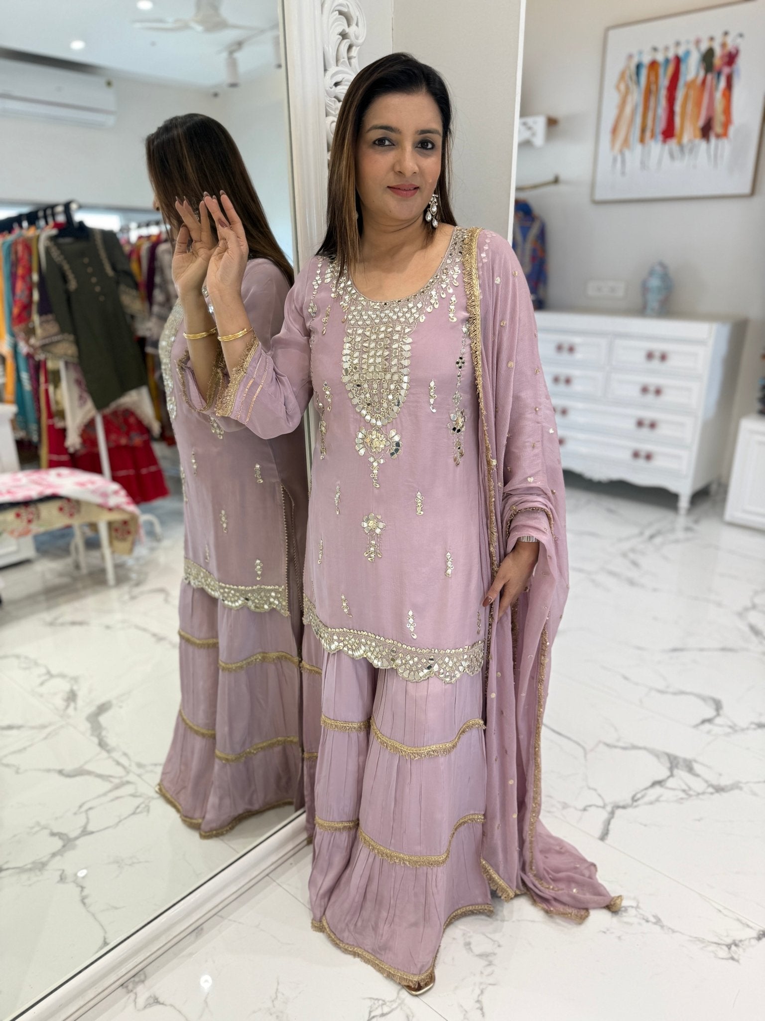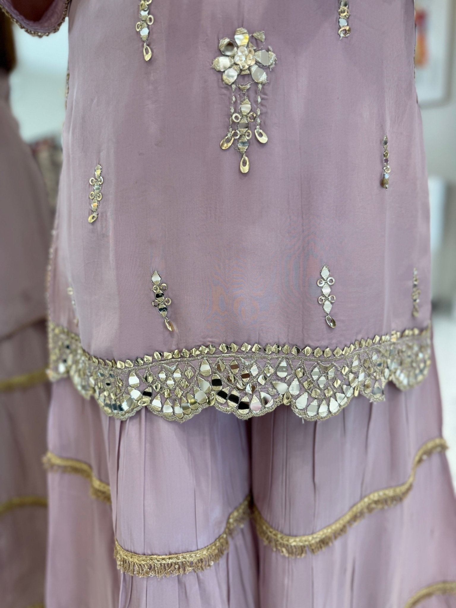 An elegant sharara set in pure Russian silk, featuring delicate mirror embroidery on the kurta with a beautifully finished hem. Paired with flowy tiered sharara pants and a soft chiffon dupatta highlighted with zari lace.