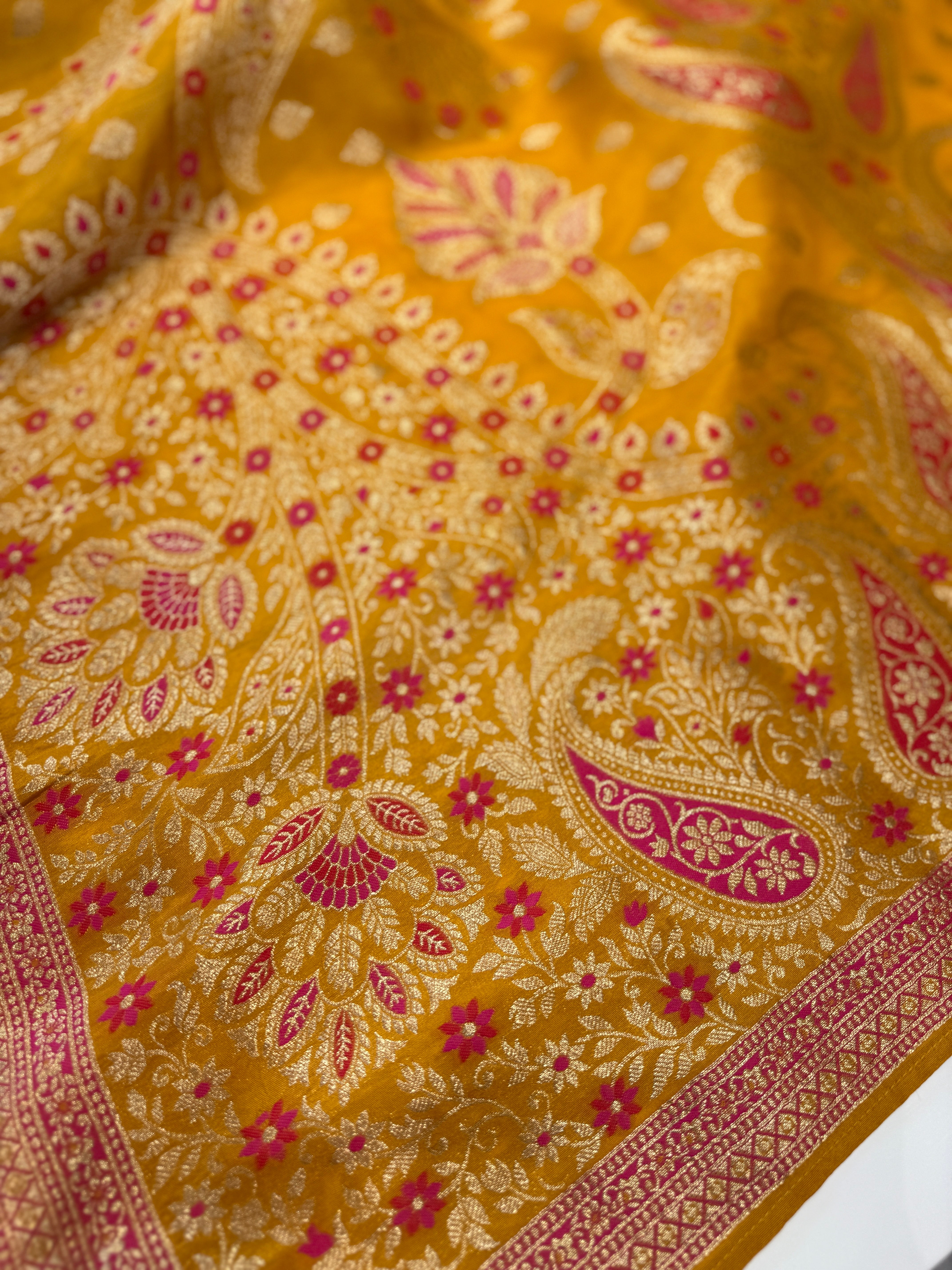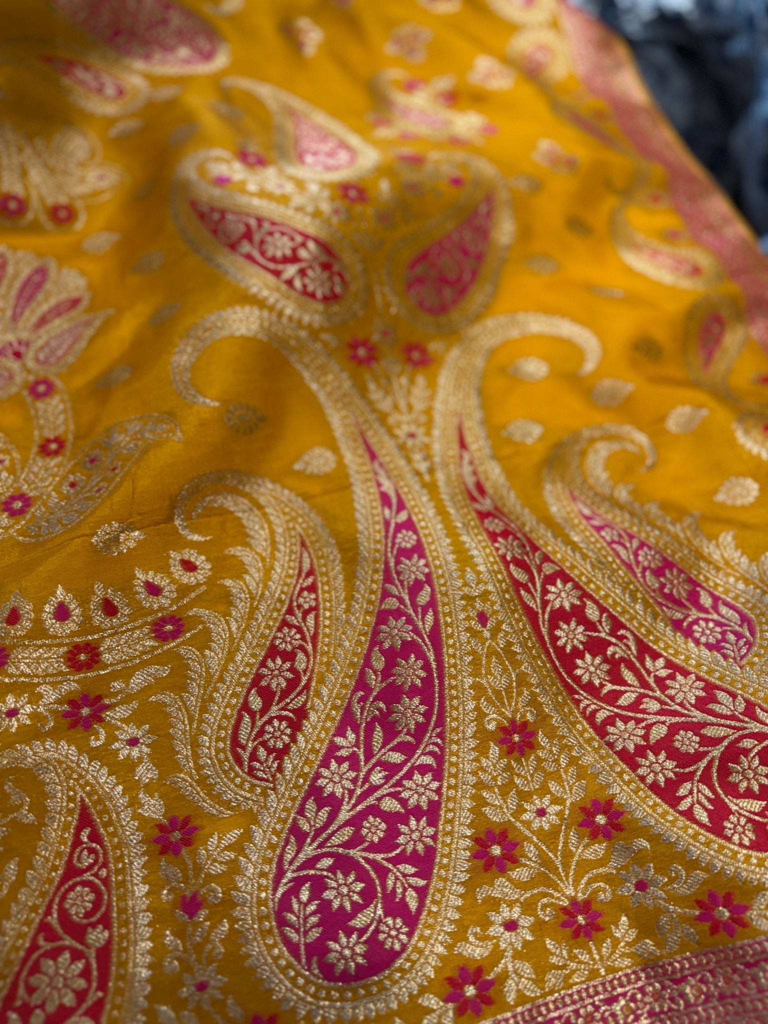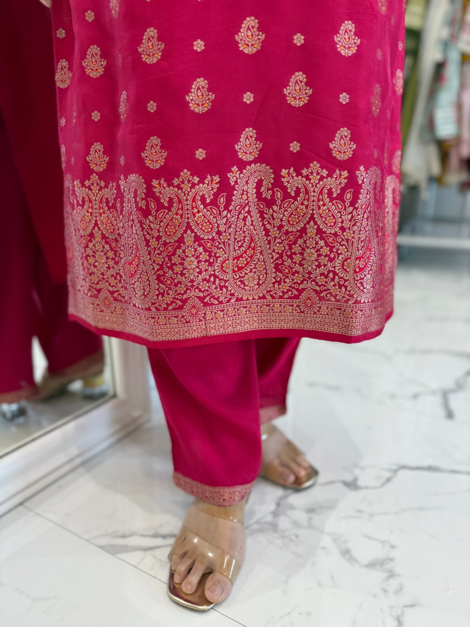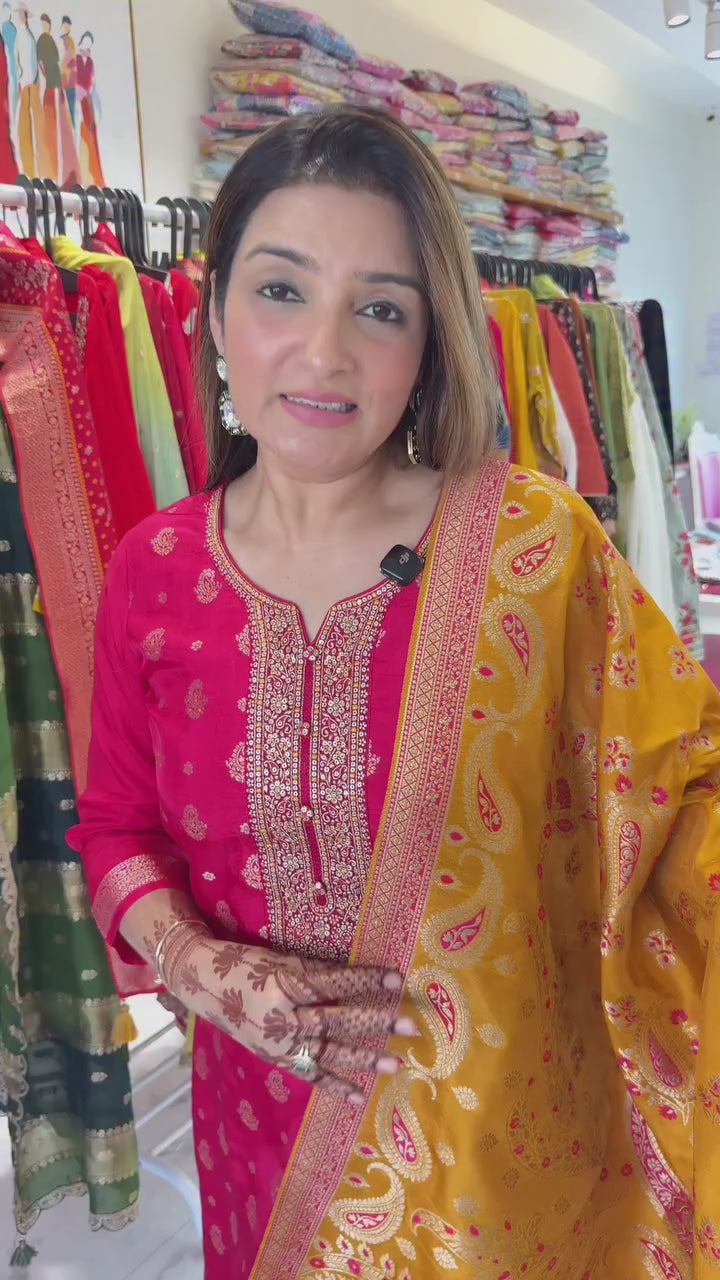 Elegant silk suit set featuring delicate zari embroidery on the neckline and hem. Paired with straight pants and a rich mustard Banarasi dupatta for a timeless festive look.