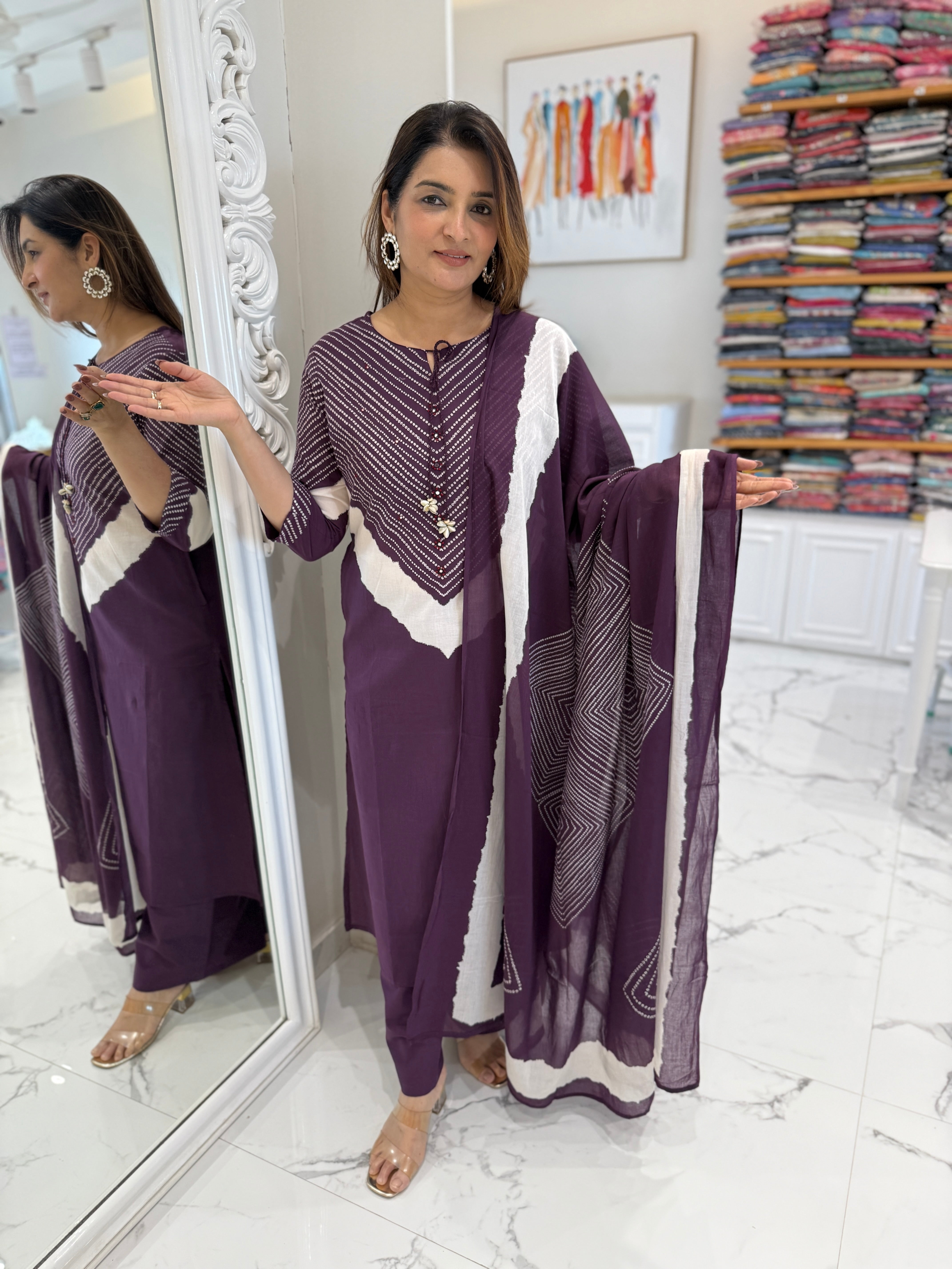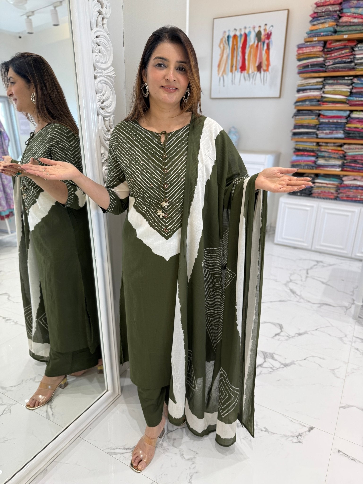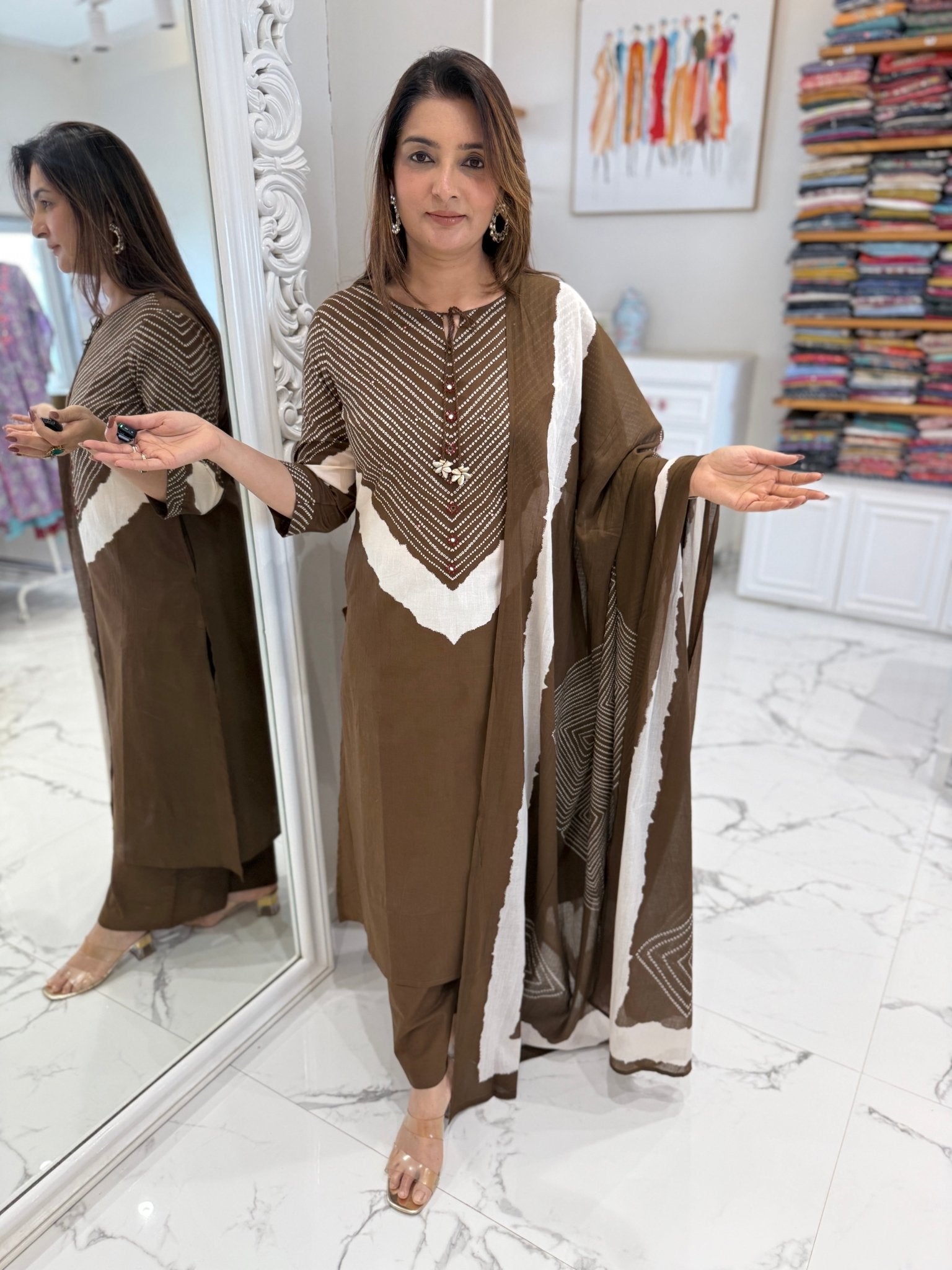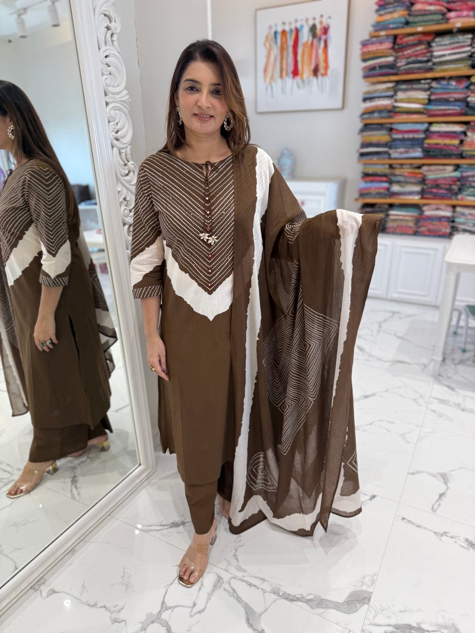 A comfortable cotton Bandhej suit set featuring a subtle Bandhej print on the neckline, paired with a matching printed pant and dupatta.