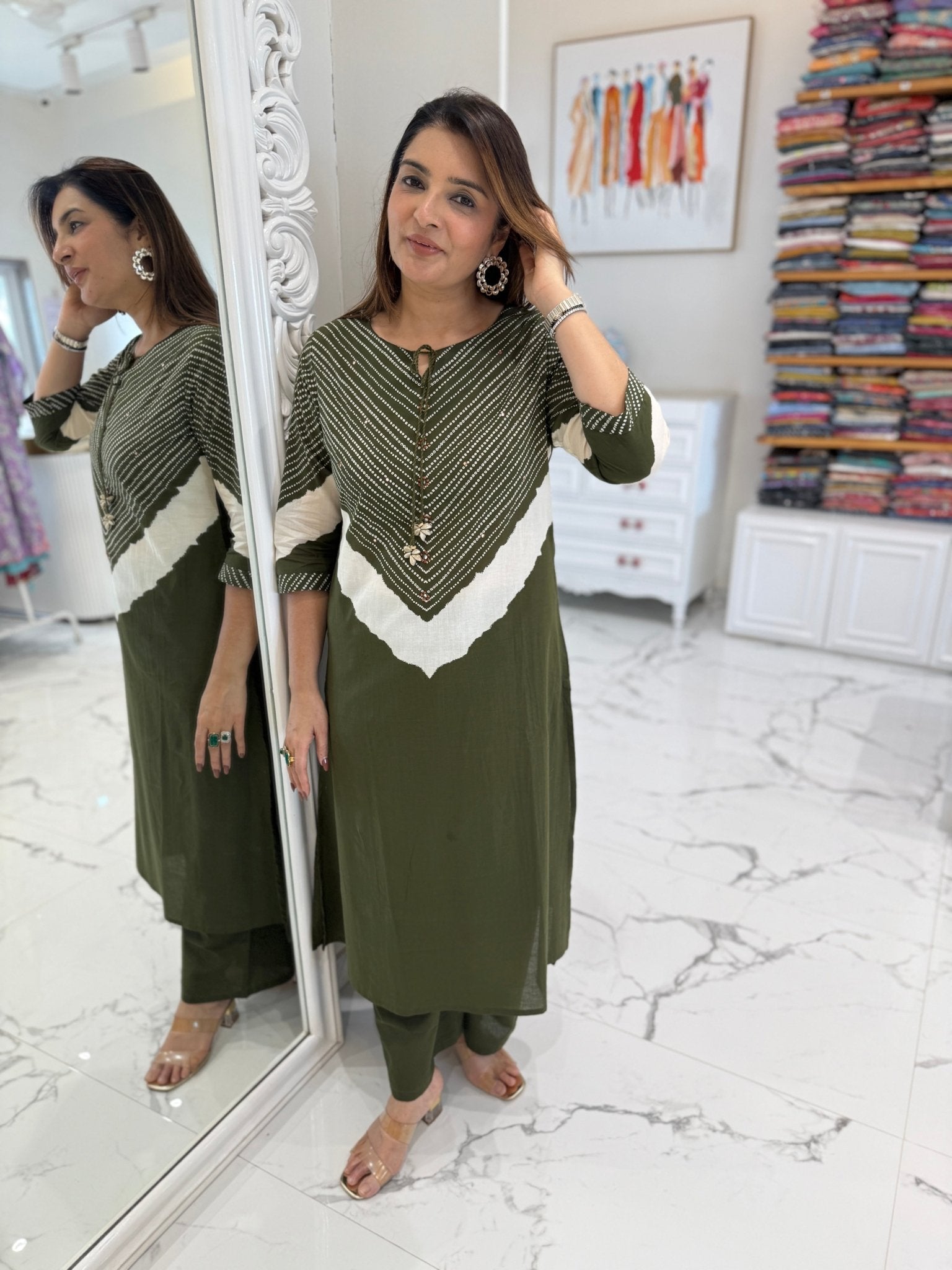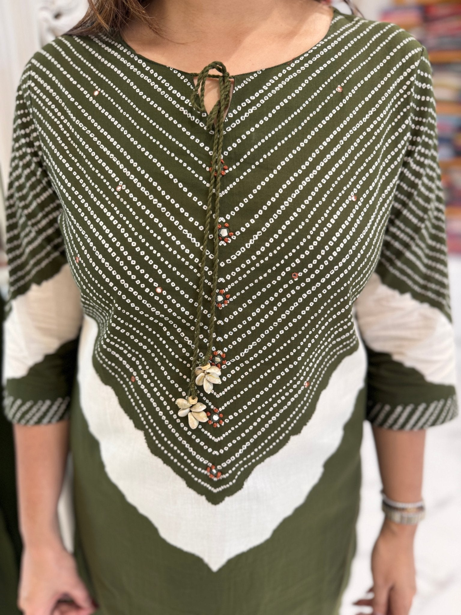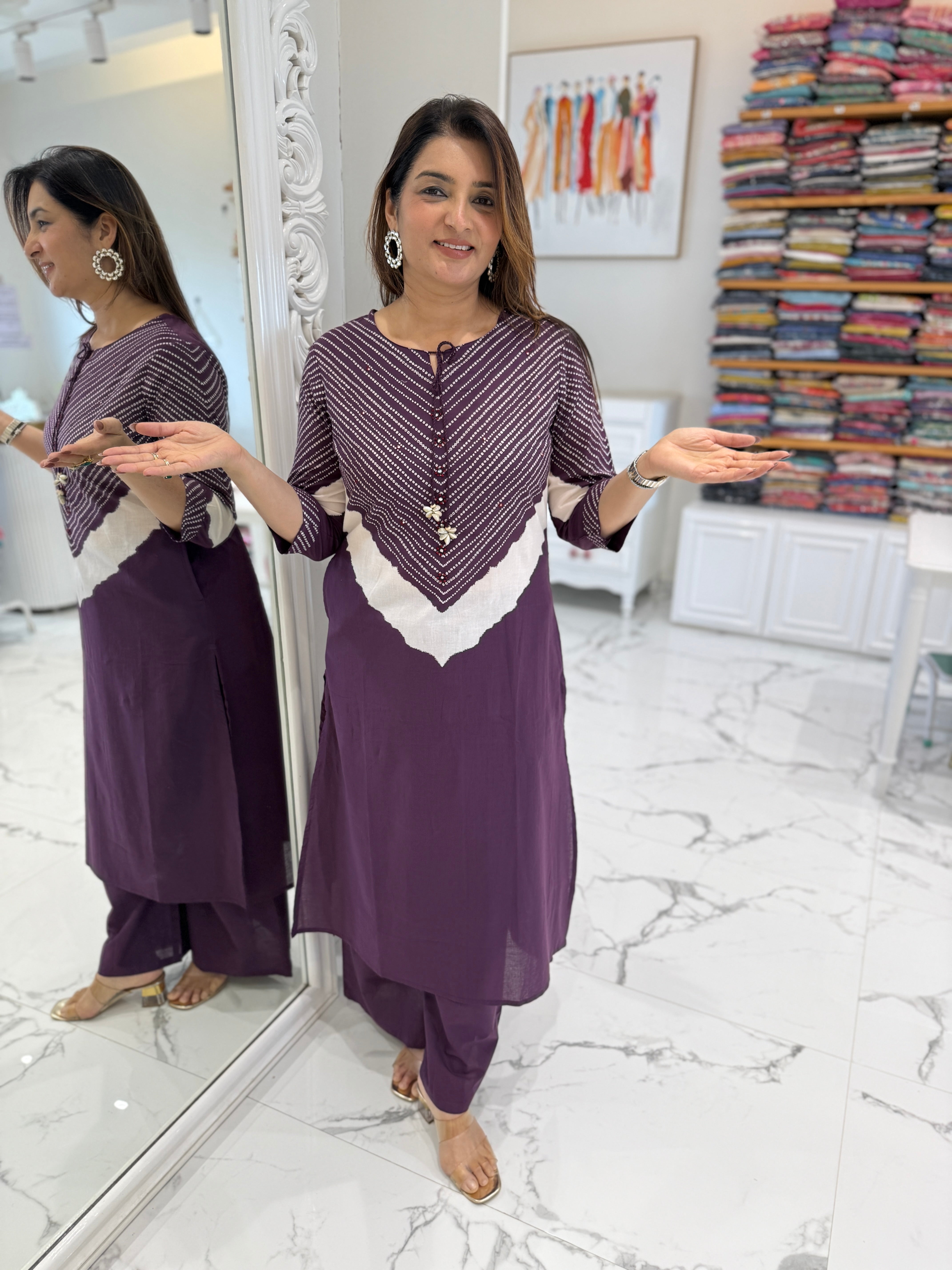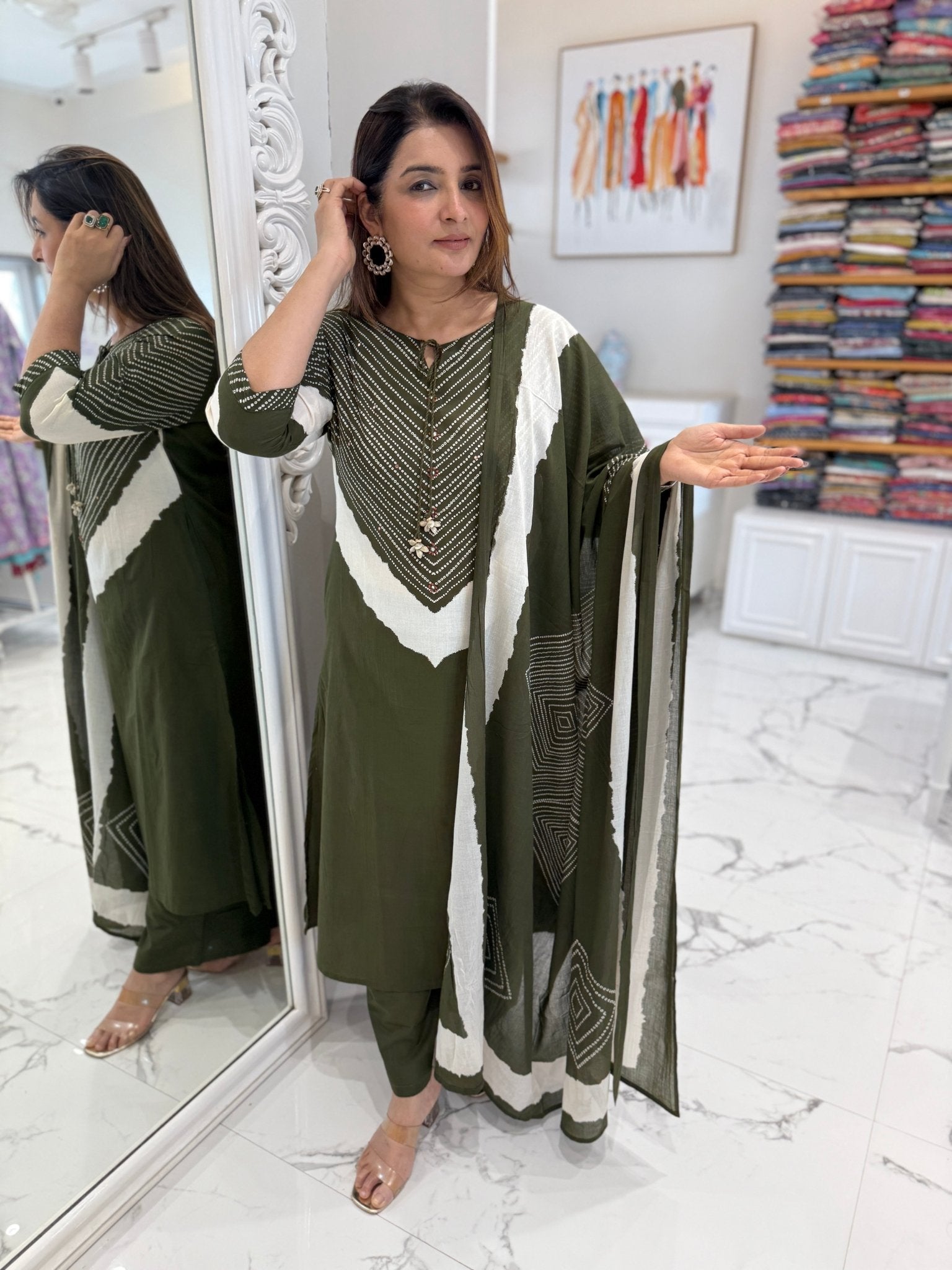 A comfortable cotton Bandhej suit set featuring a subtle Bandhej print on the neckline, paired with a matching printed pant and dupatta.