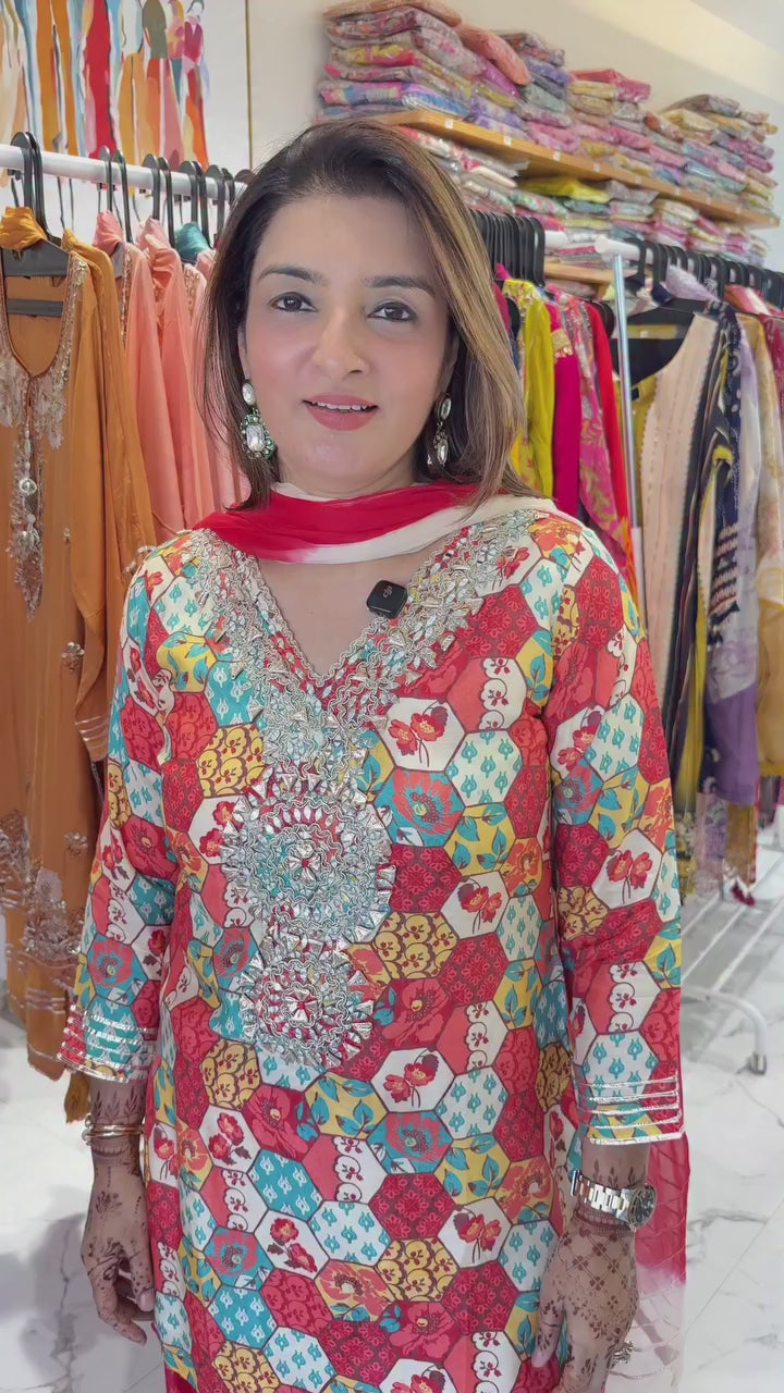 Vibrant muslin kurta with intricate mirror and gota work, paired with a classic farshi salwar in red printed fabric. Comes with a soft chiffon dupatta for a graceful finishing touch.