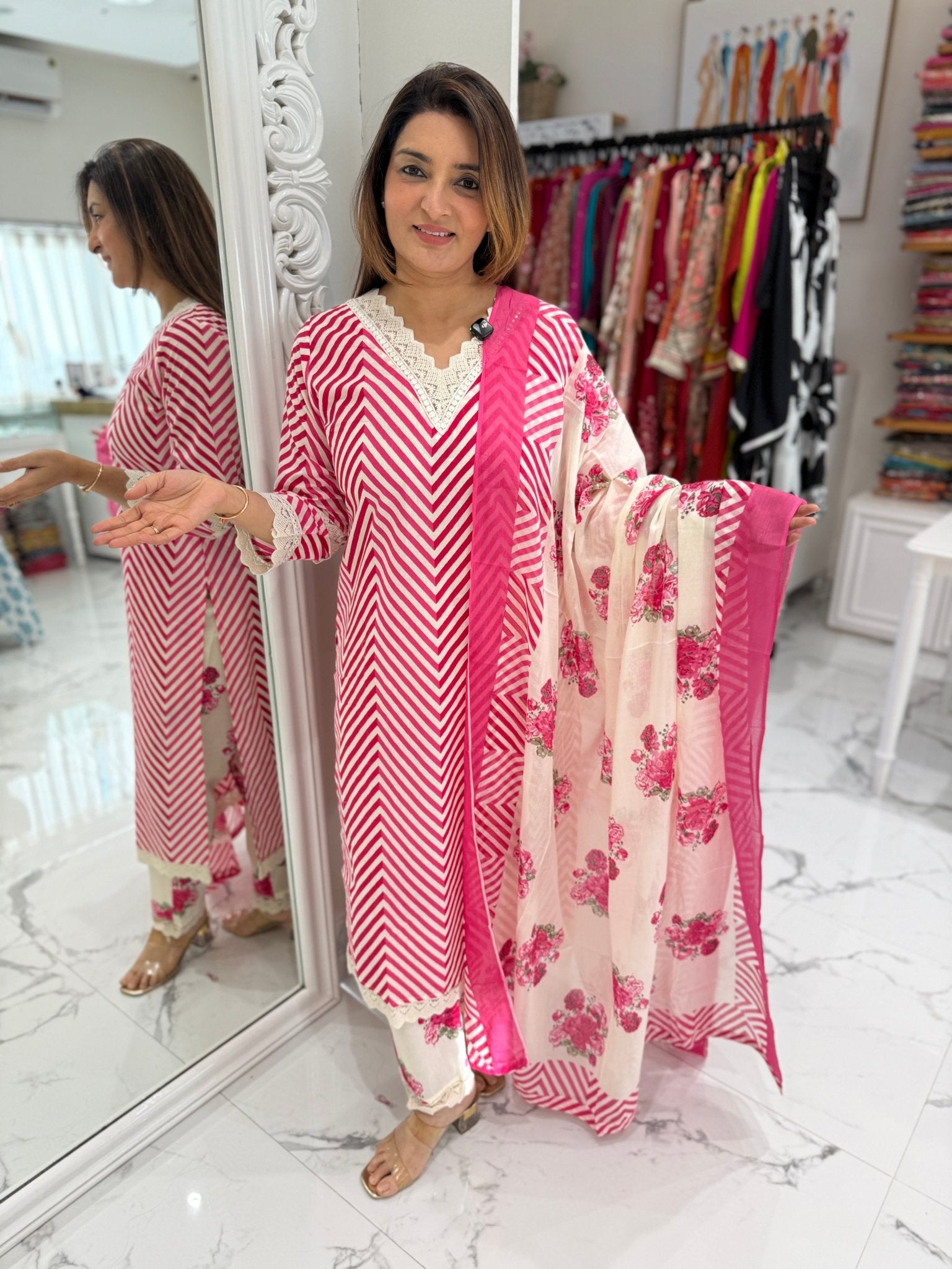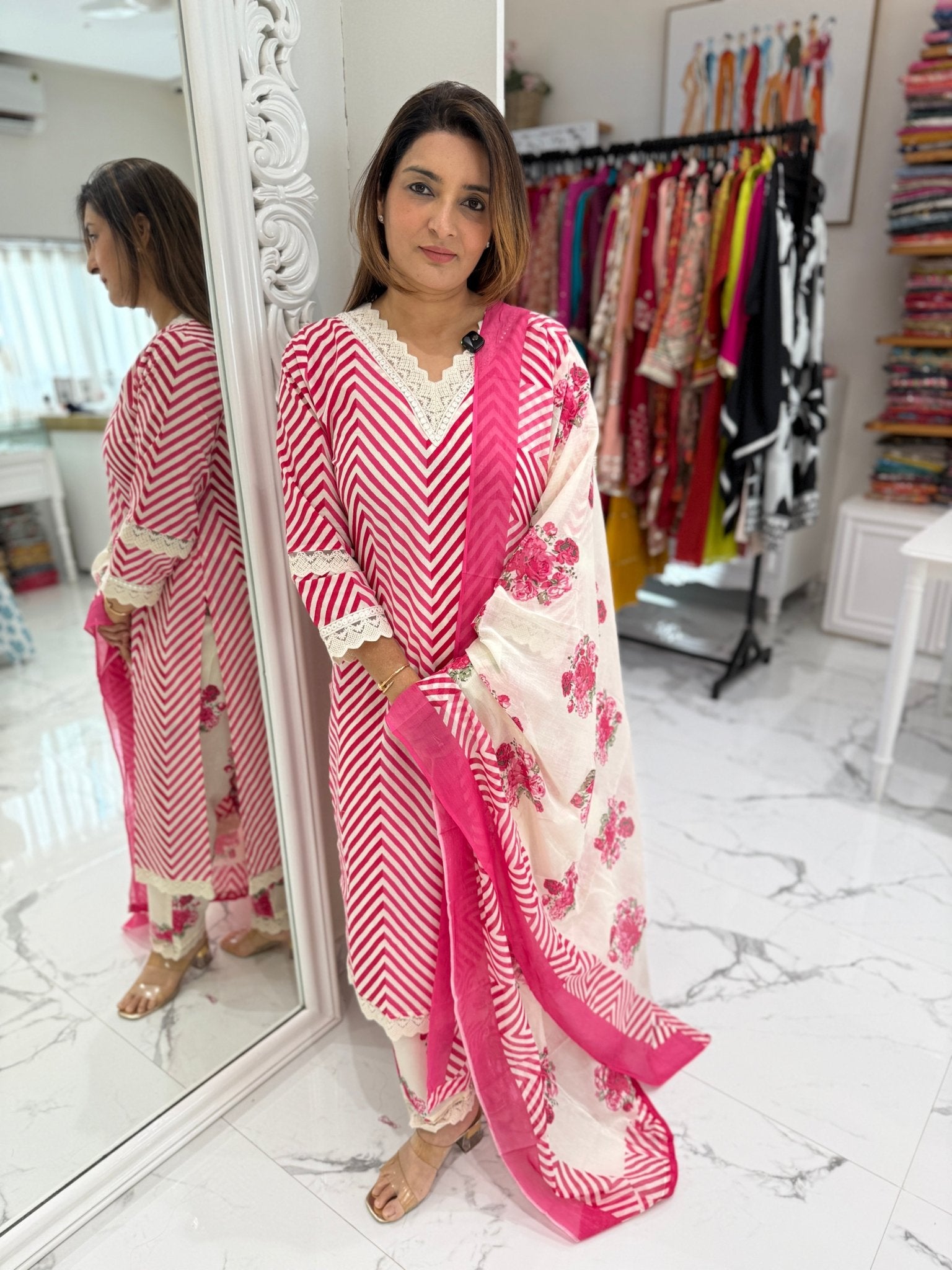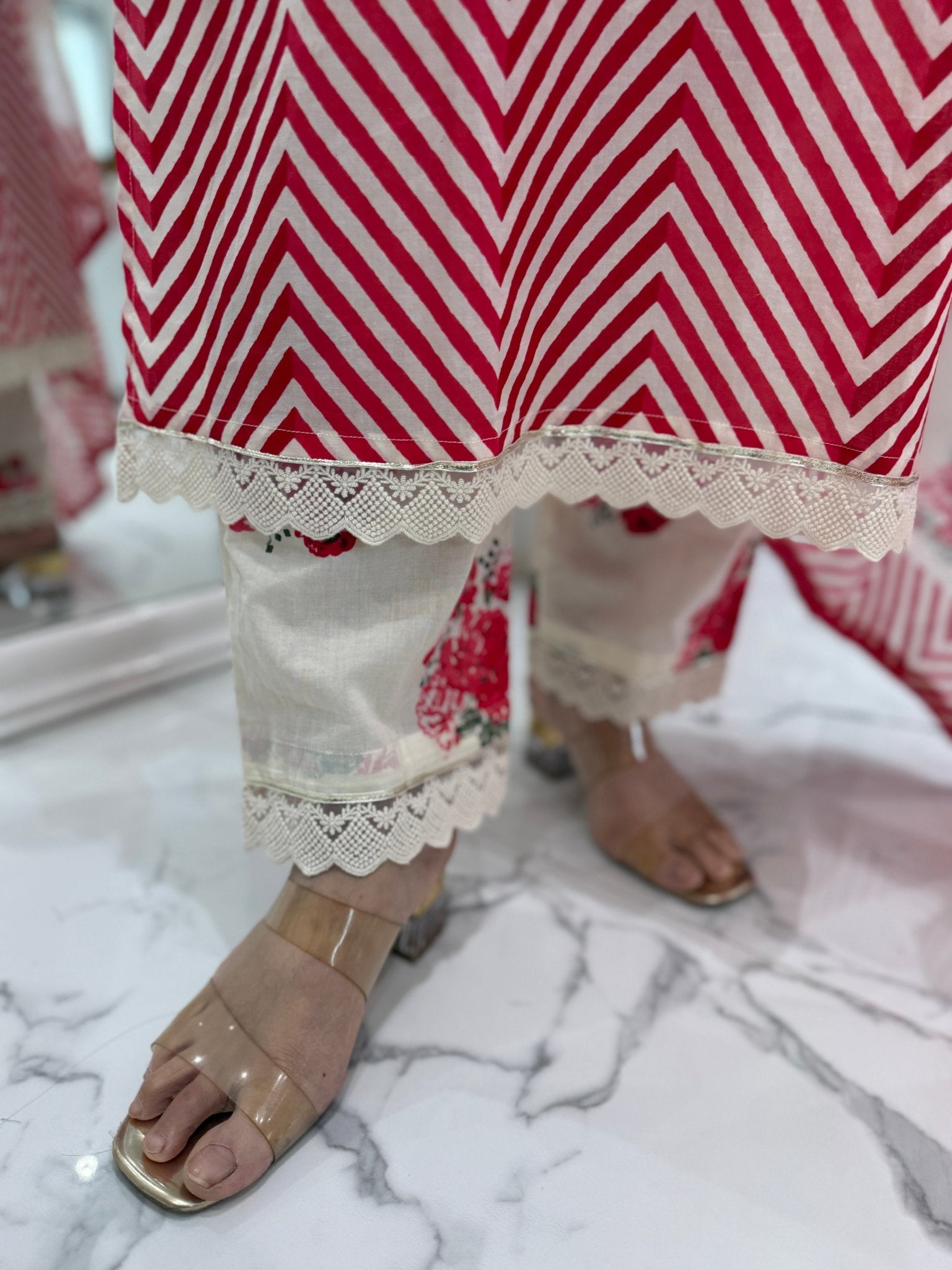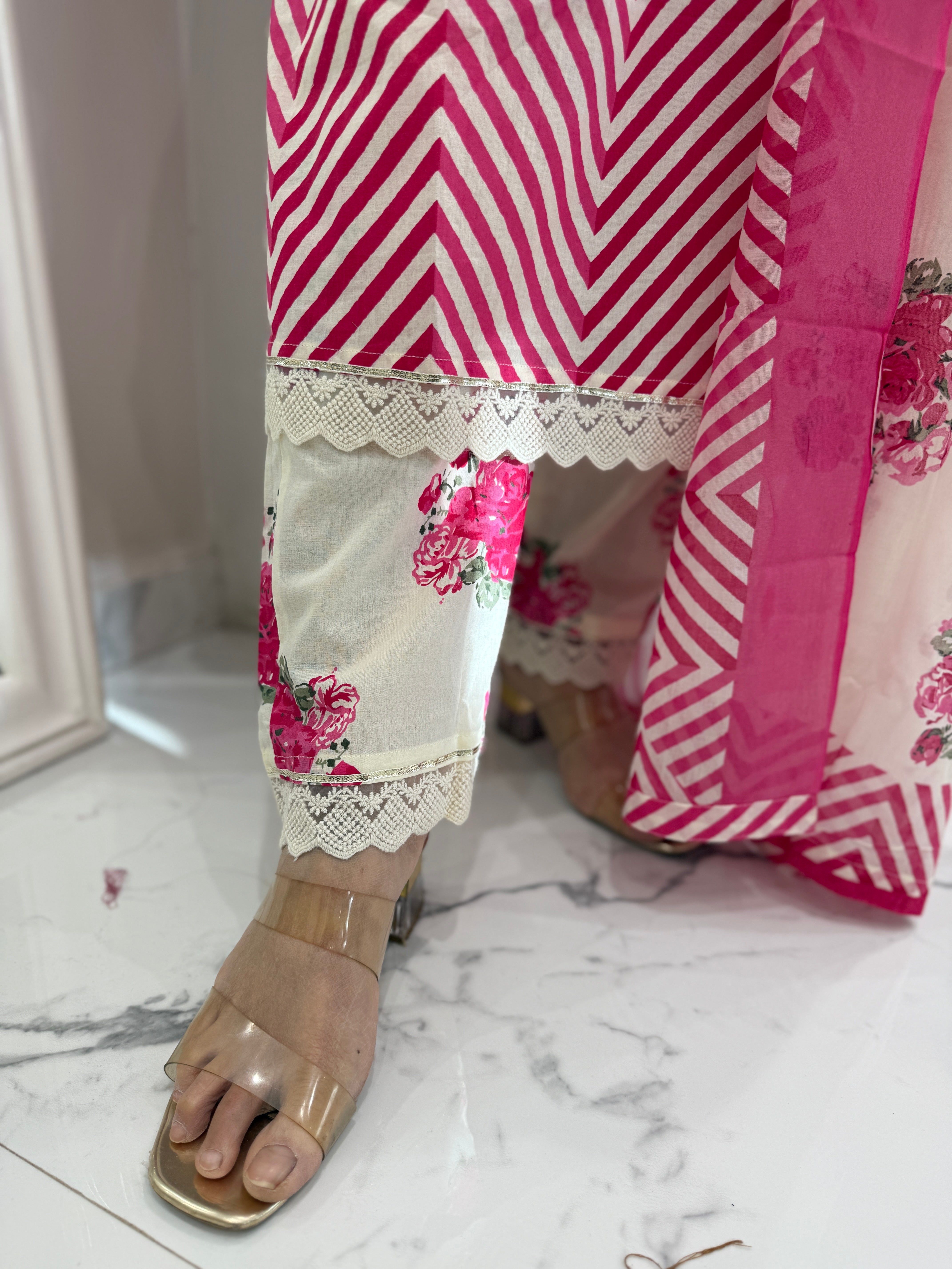 A cotton straight pants set featuring leheriya and floral print, with lace on the kurta and pants, along with a soft pure mul dupatta.