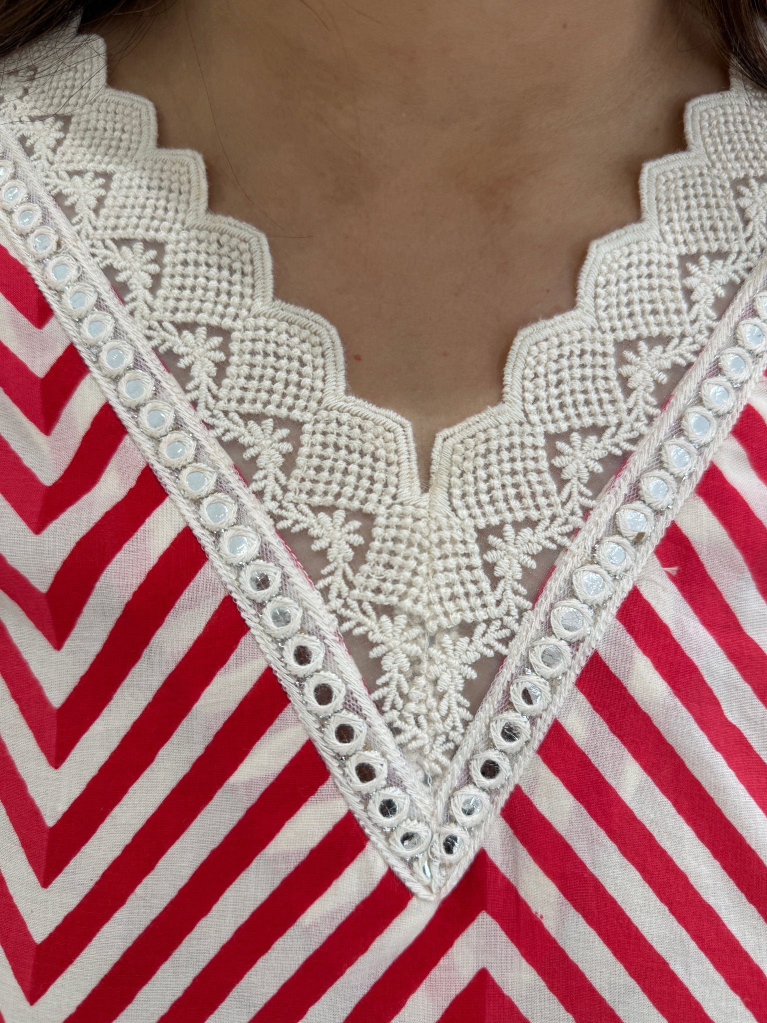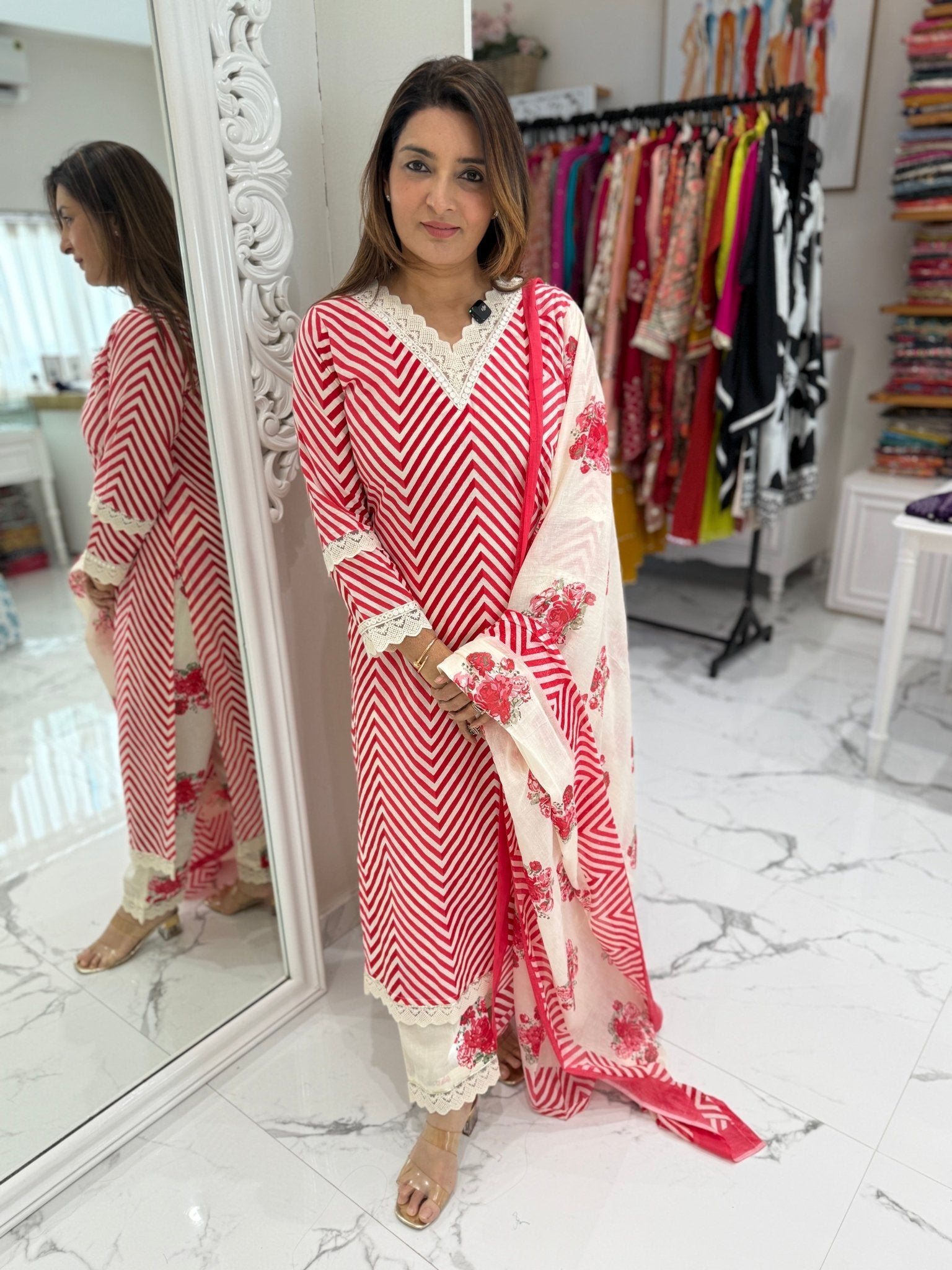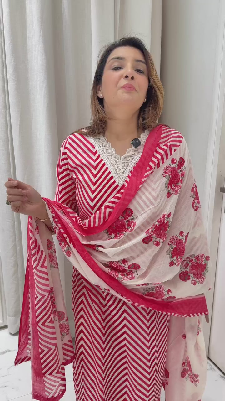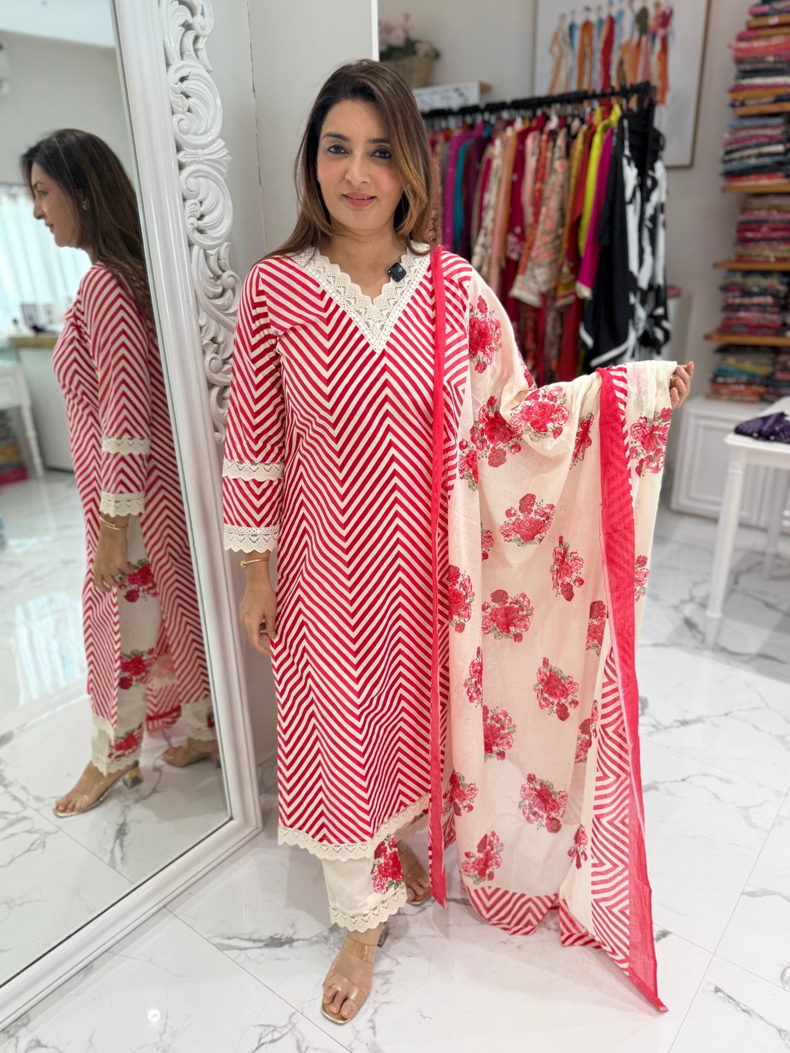 A cotton straight pants set featuring leheriya and floral print, with lace on the kurta and pants, along with a soft pure mul dupatta.