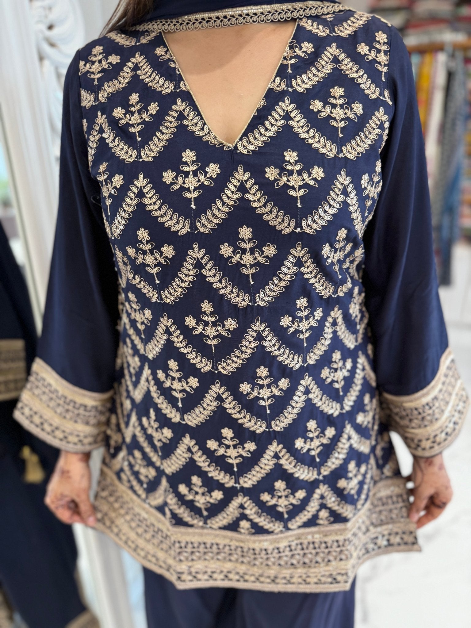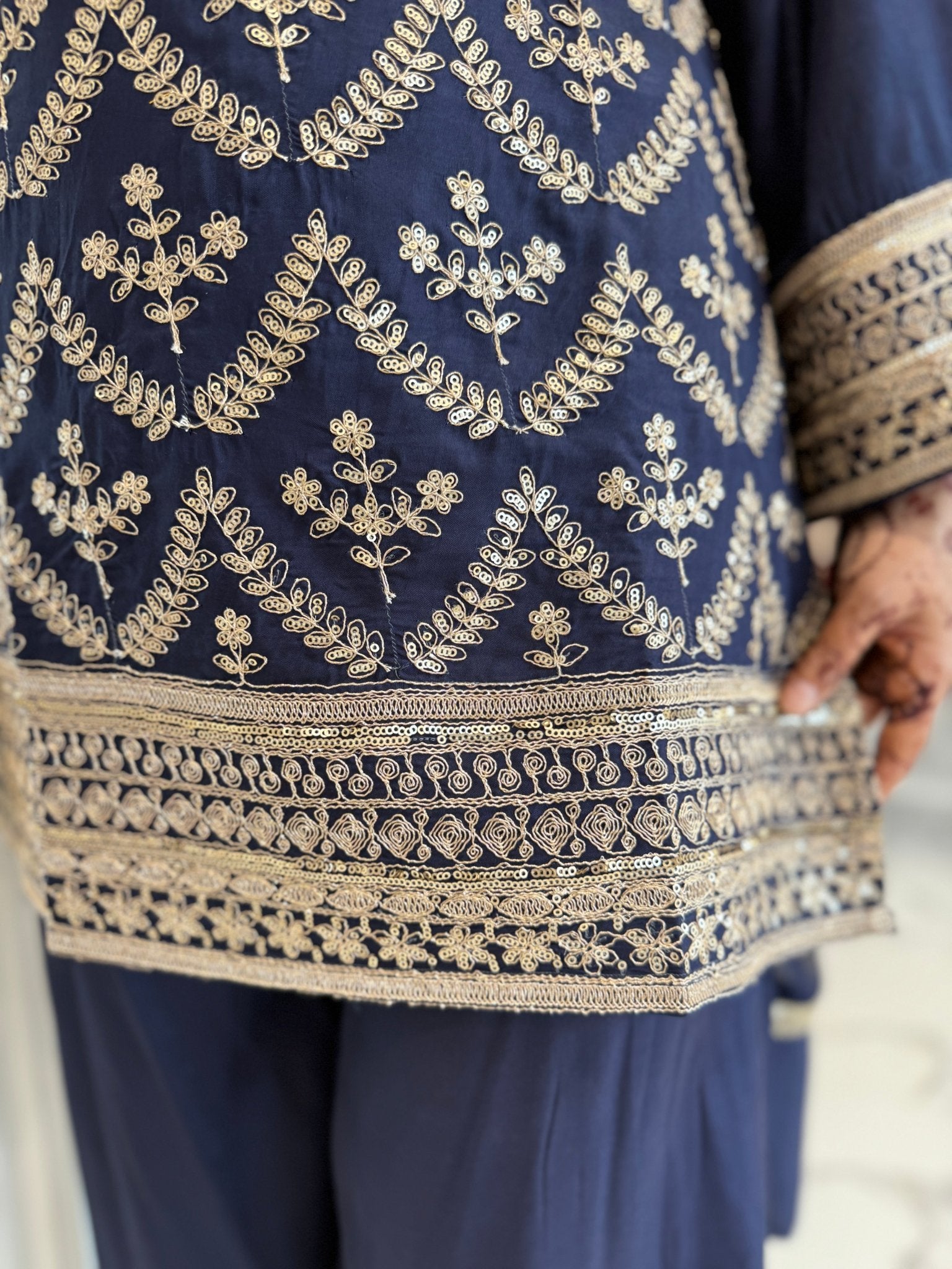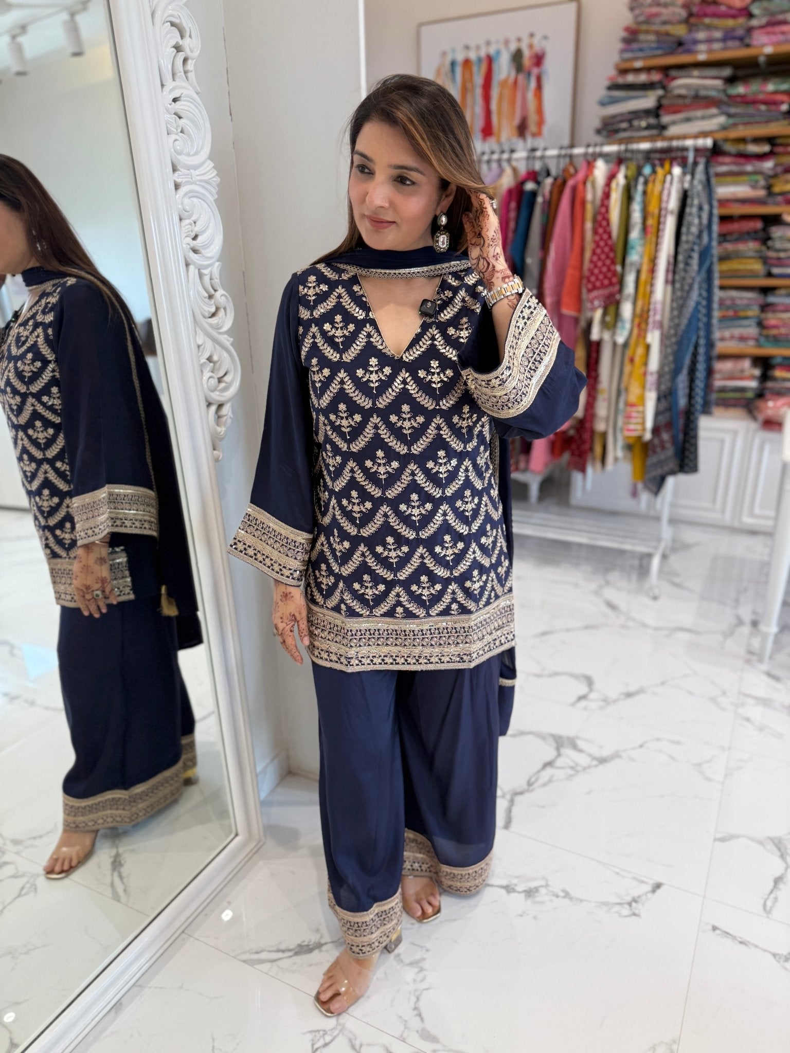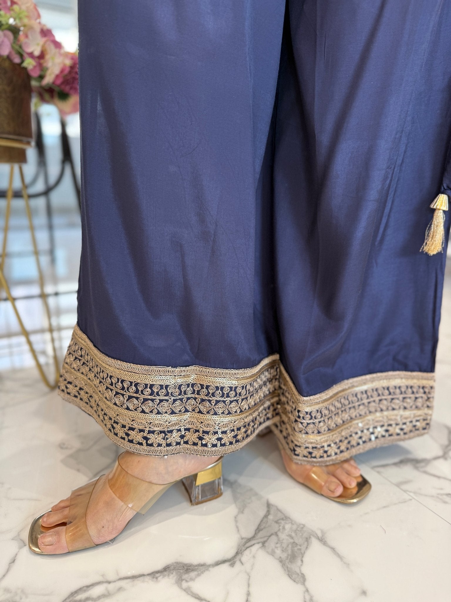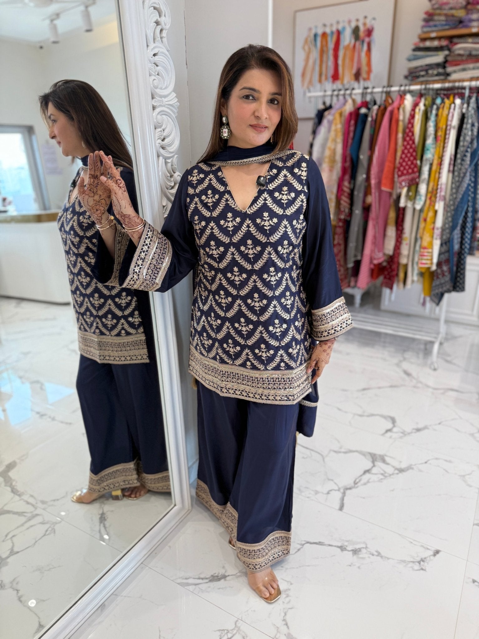 Elegant navy blue muslin suit set featuring intricate gold zari embroidery on the kurta and matching palazzo pants.