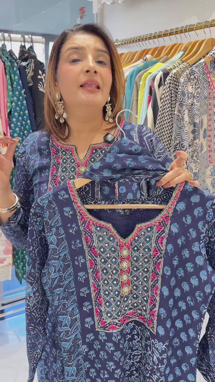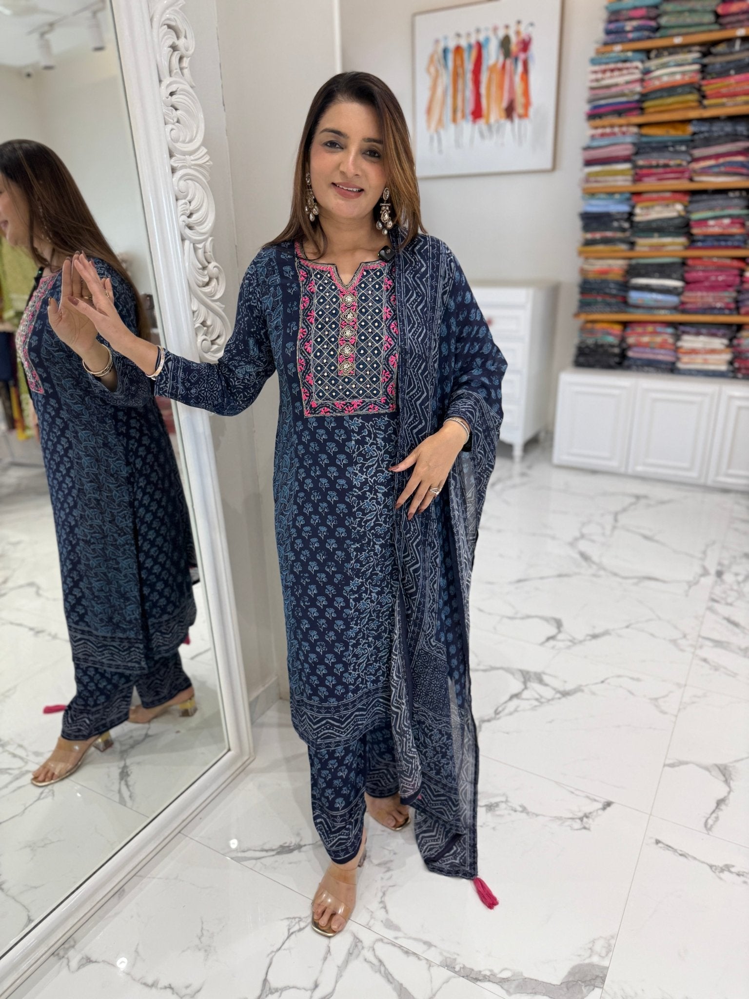 Indigo blue printed crepe kurta set with sequin & mirror work on the neckline, paired with matching pants and a tasselled dupatta.