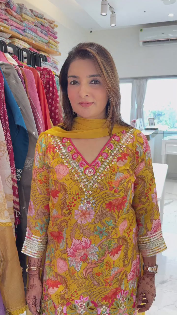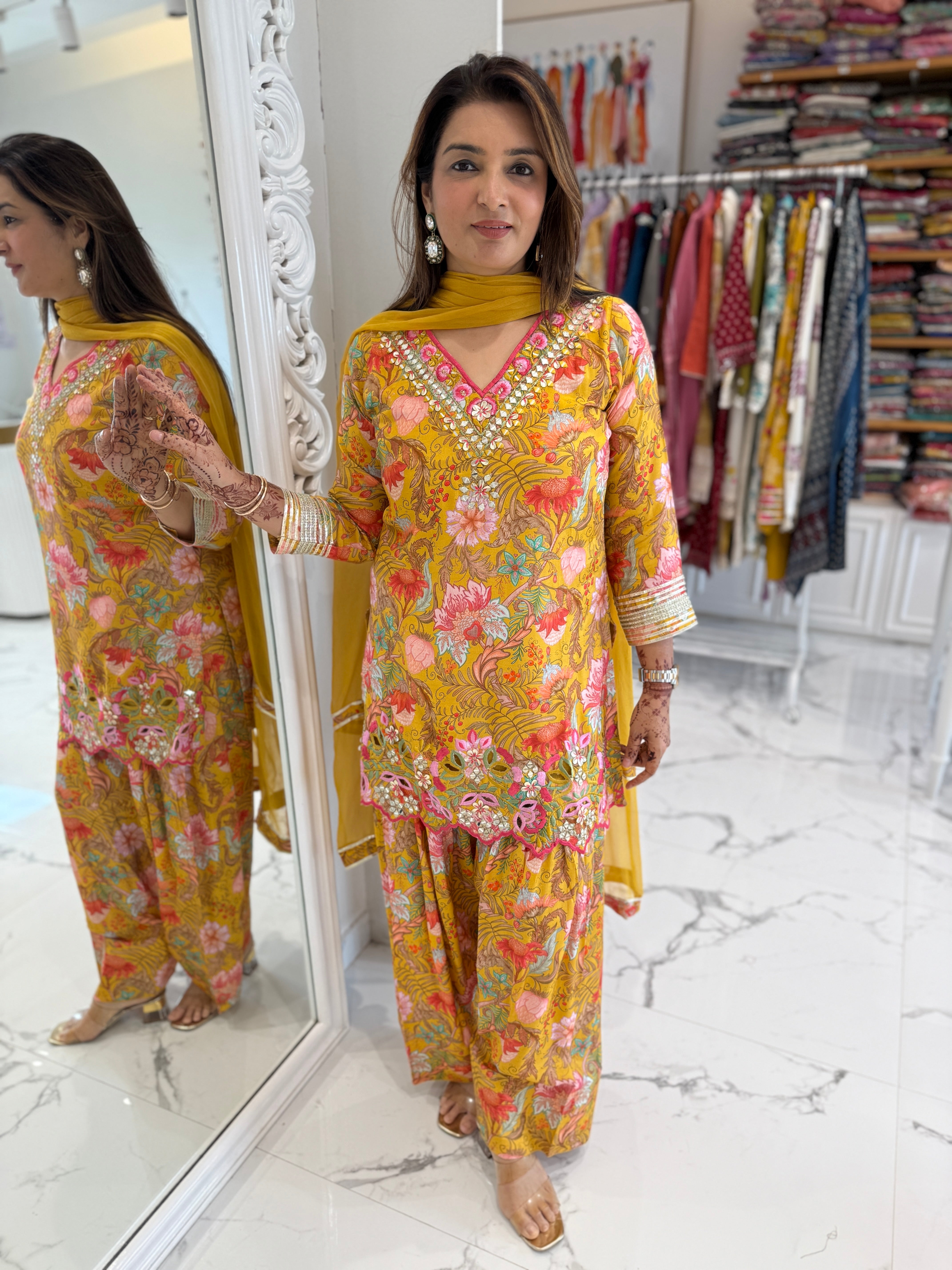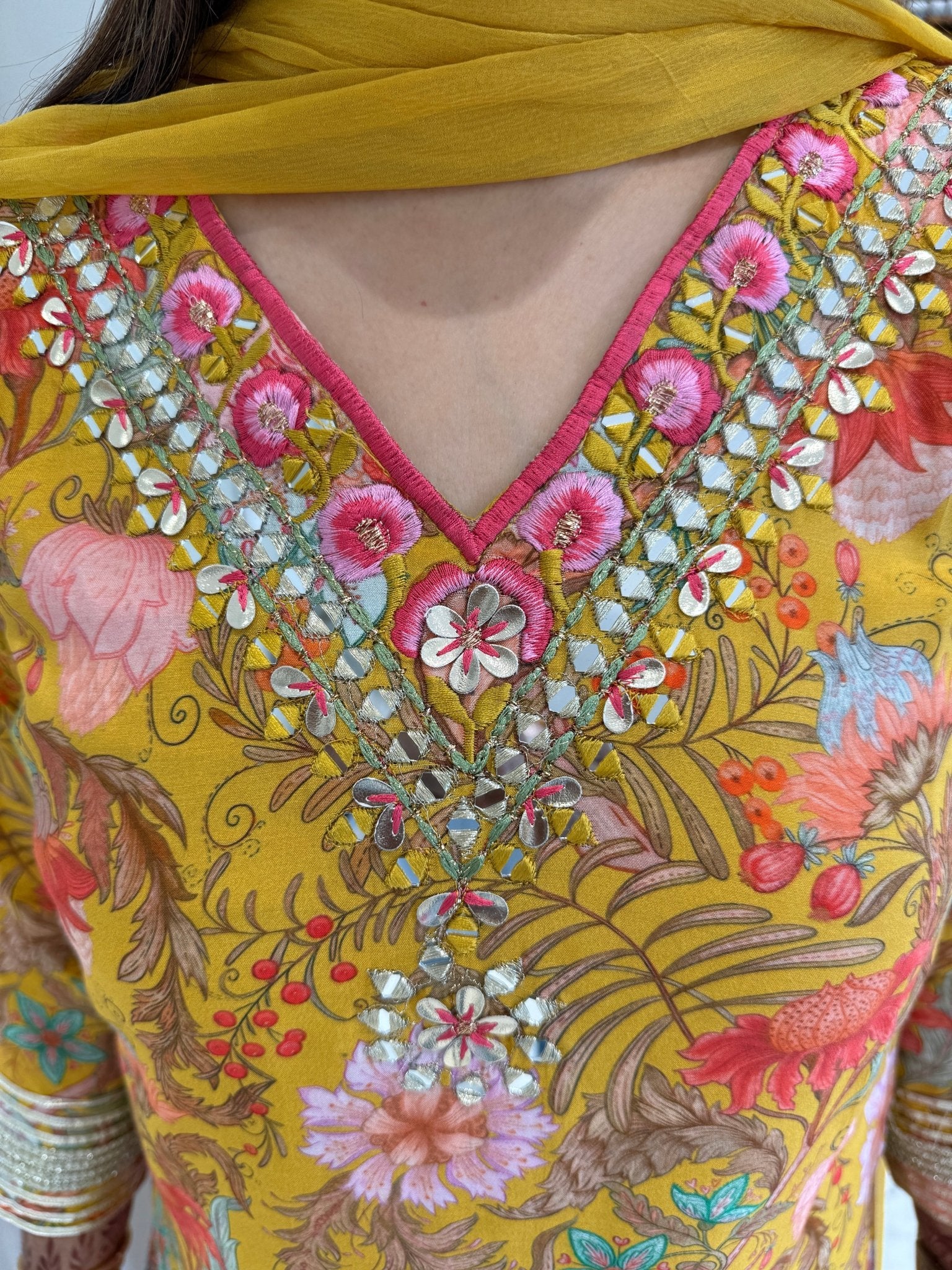 Bright and beautiful muslin kurta set featuring mirror and gota work, paired with a flowy farshi salwar and soft chiffon dupatta.