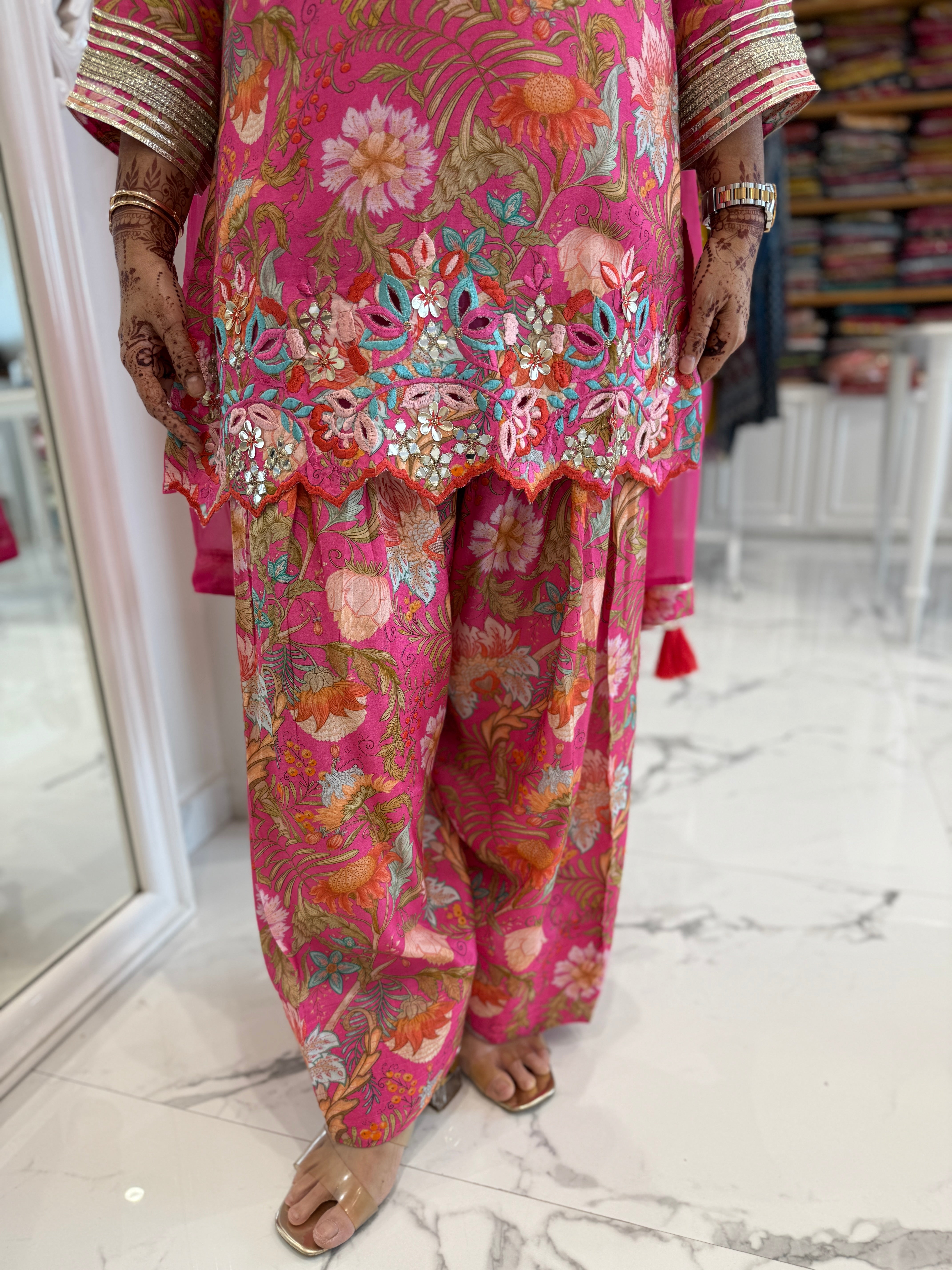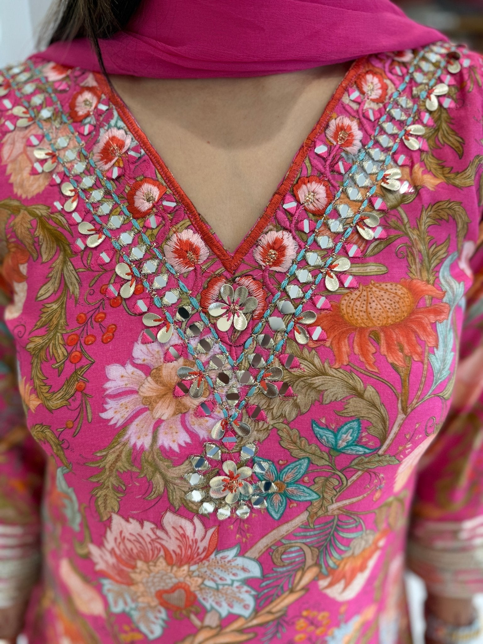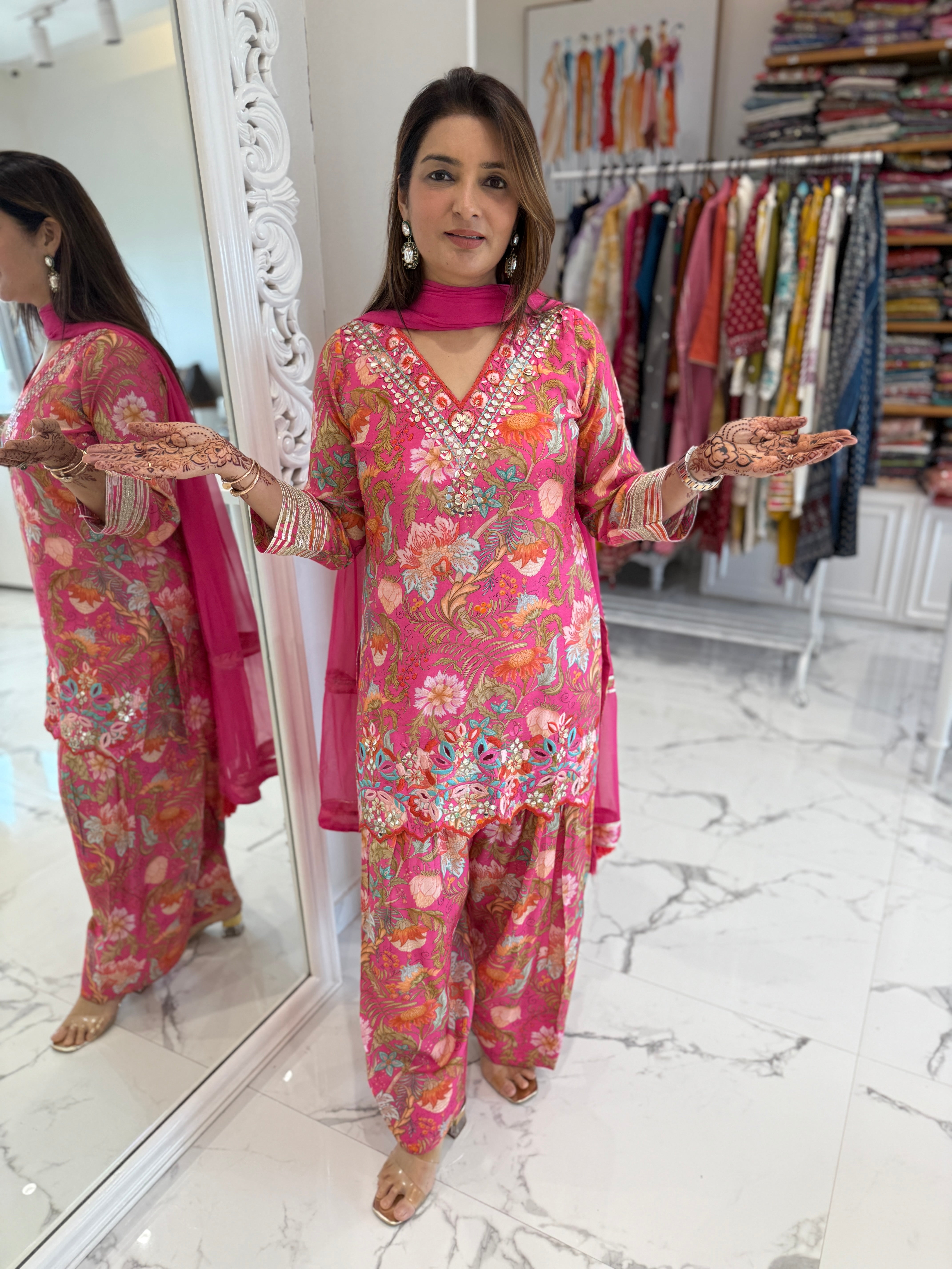 Bright and beautiful muslin kurta set featuring mirror and gota work, paired with a flowy farshi salwar and soft chiffon dupatta.