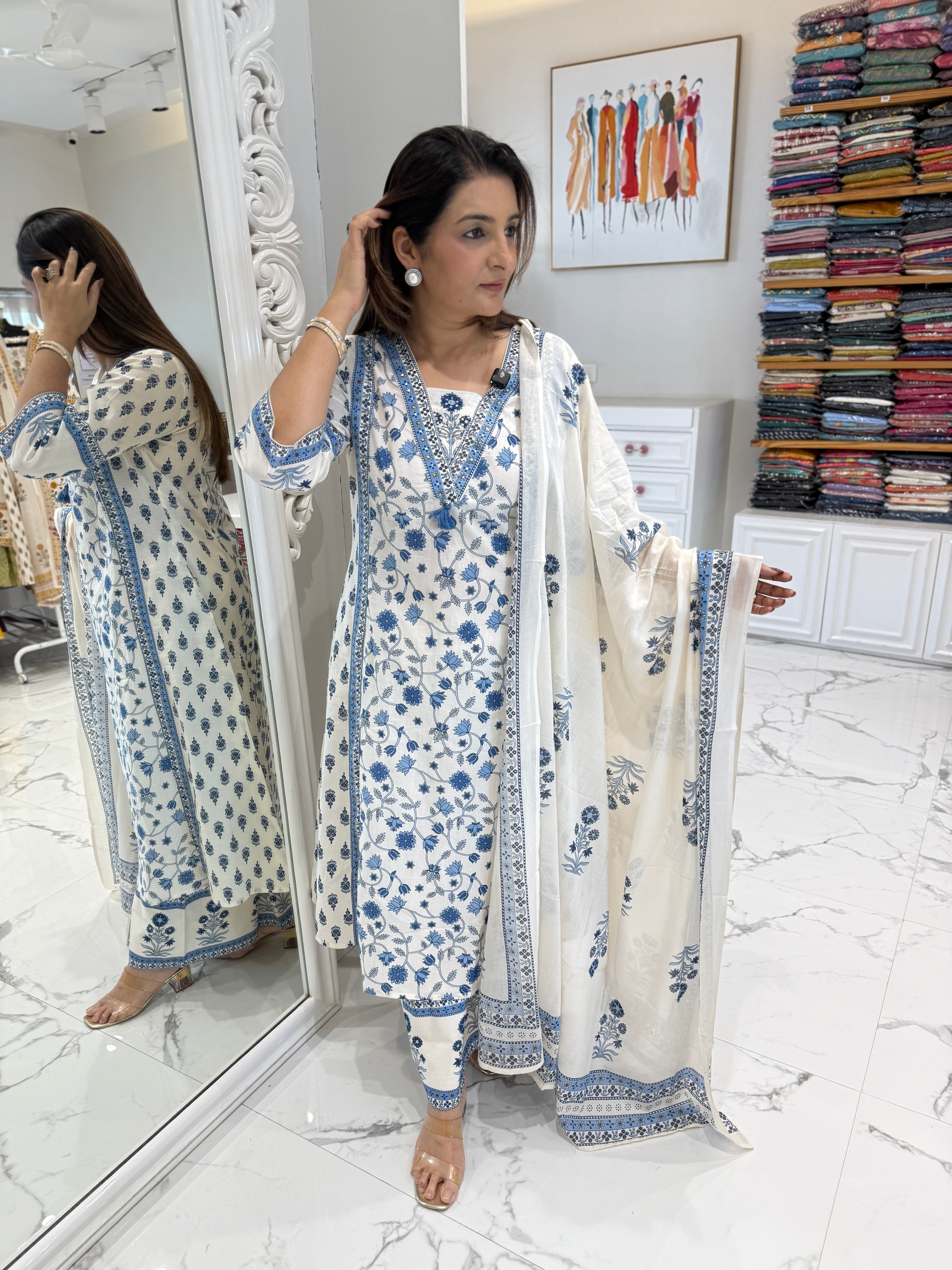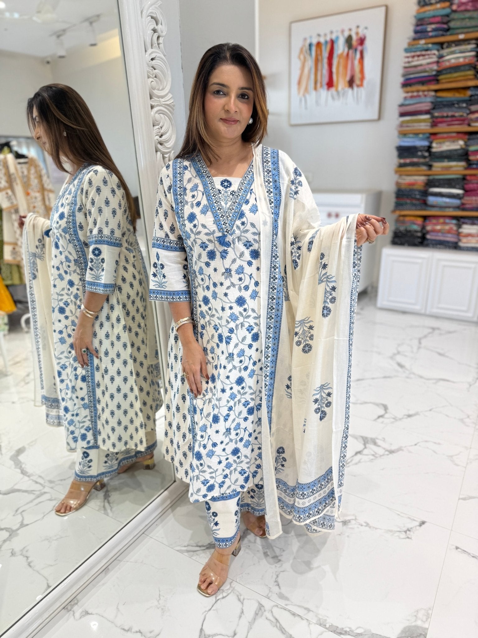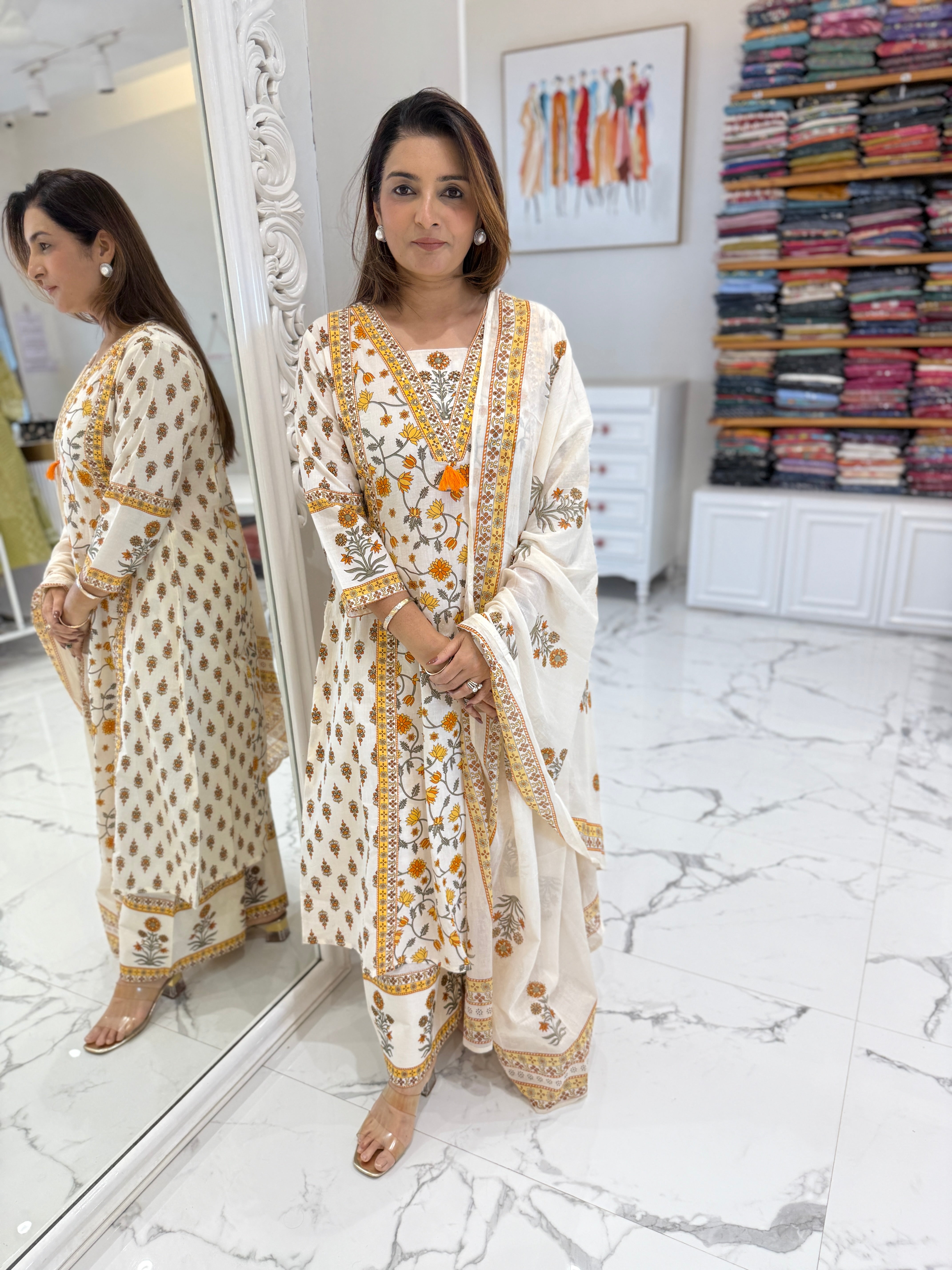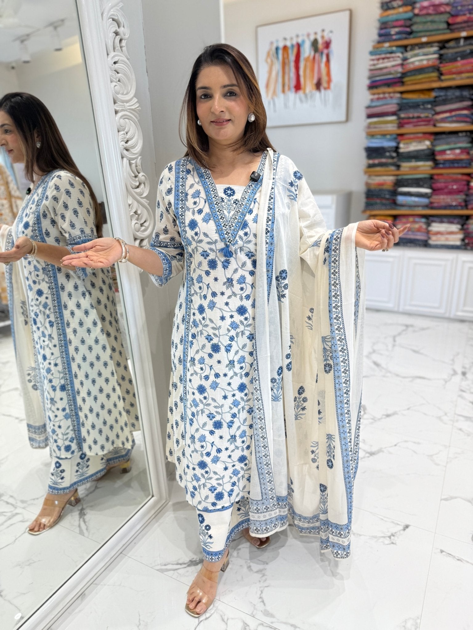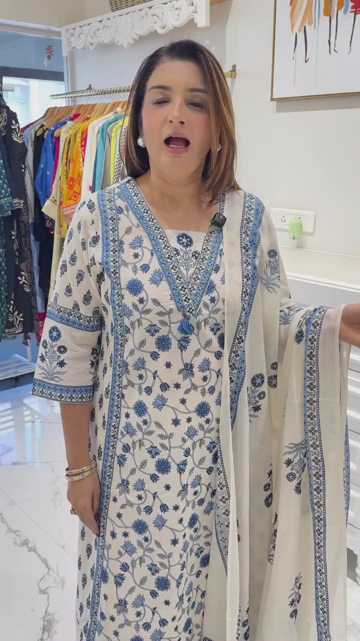 Experience elegance with our pure cotton mul dupatta set, adorned with a V-neck kurta and broad palazzos. This ensemble radiates a blend of traditional artistry and contemporary flair. A timeless piece for any wardrobe.