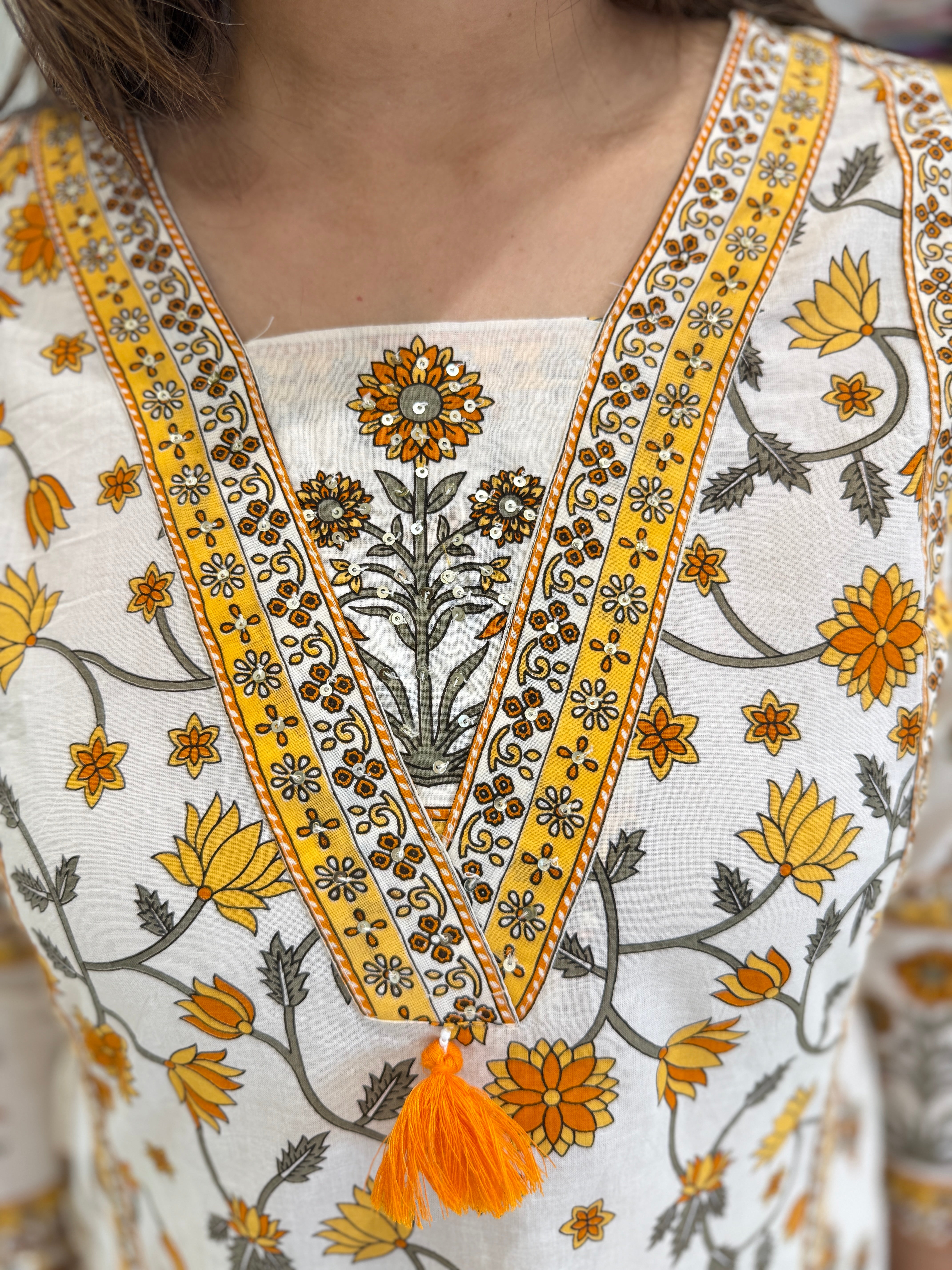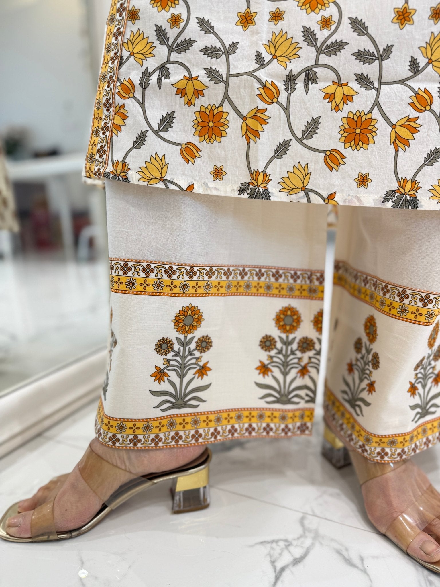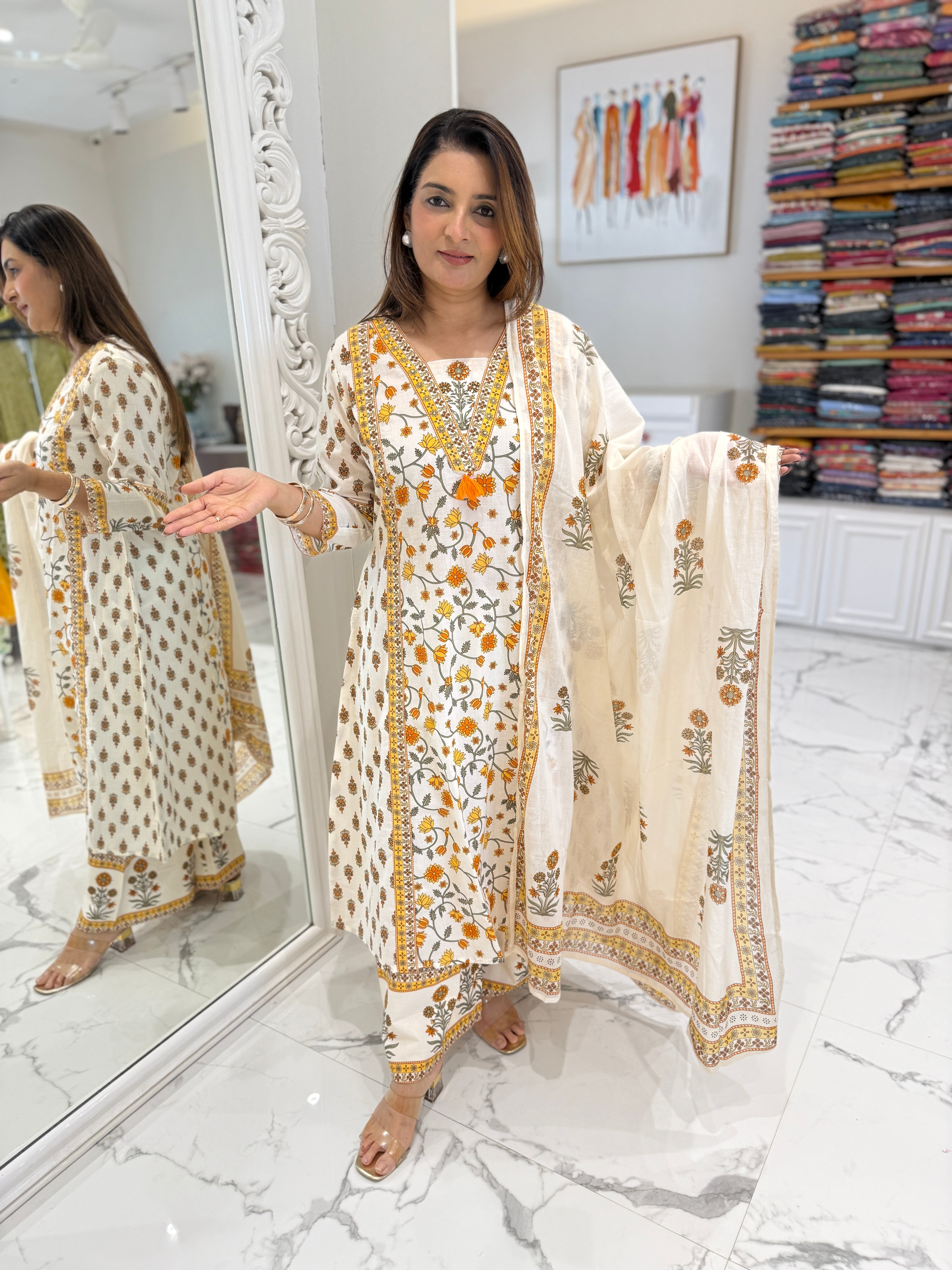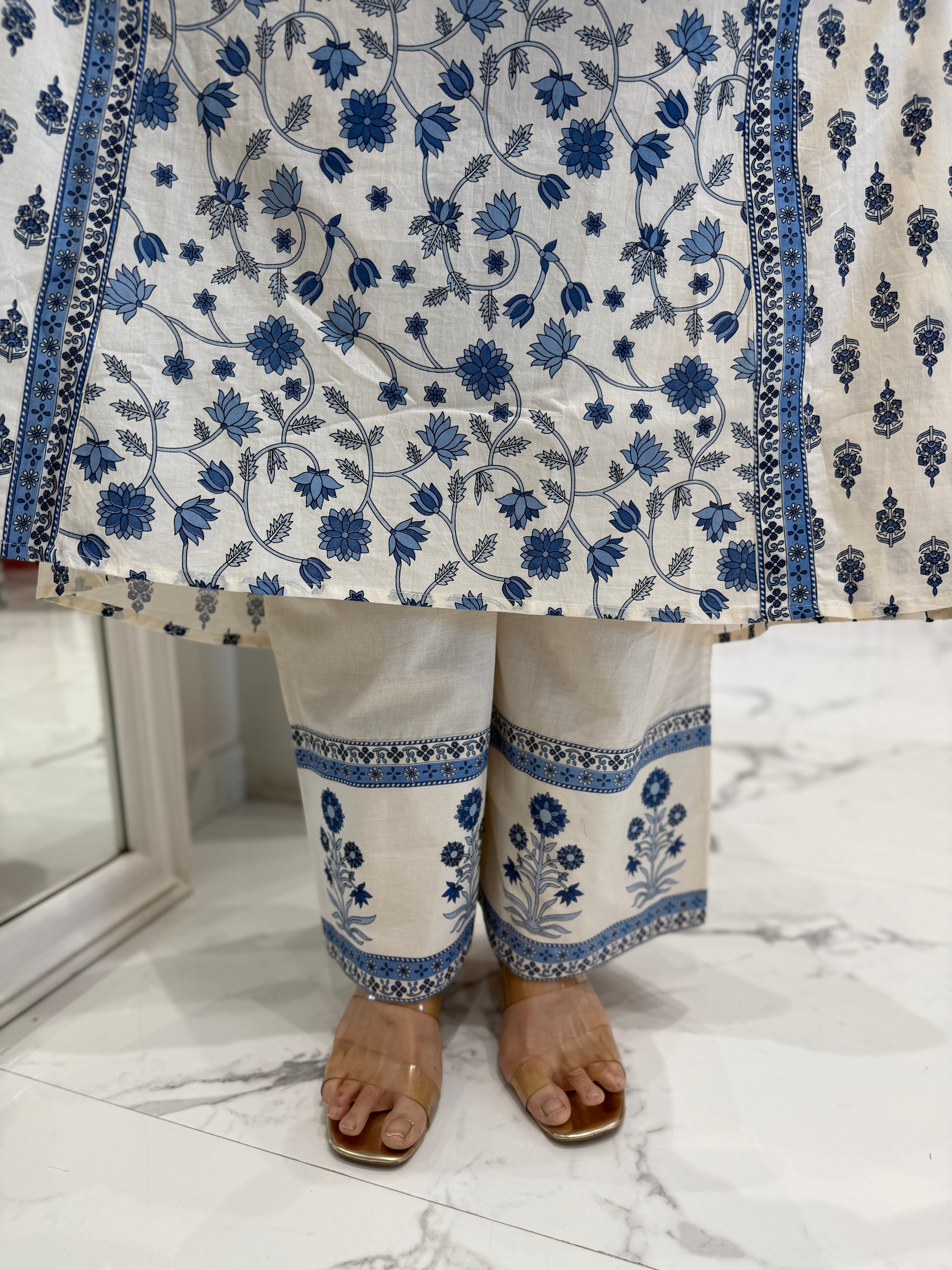 Experience elegance with our pure cotton mul dupatta set, adorned with a V-neck kurta and broad palazzos. This ensemble radiates a blend of traditional artistry and contemporary flair. A timeless piece for any wardrobe.