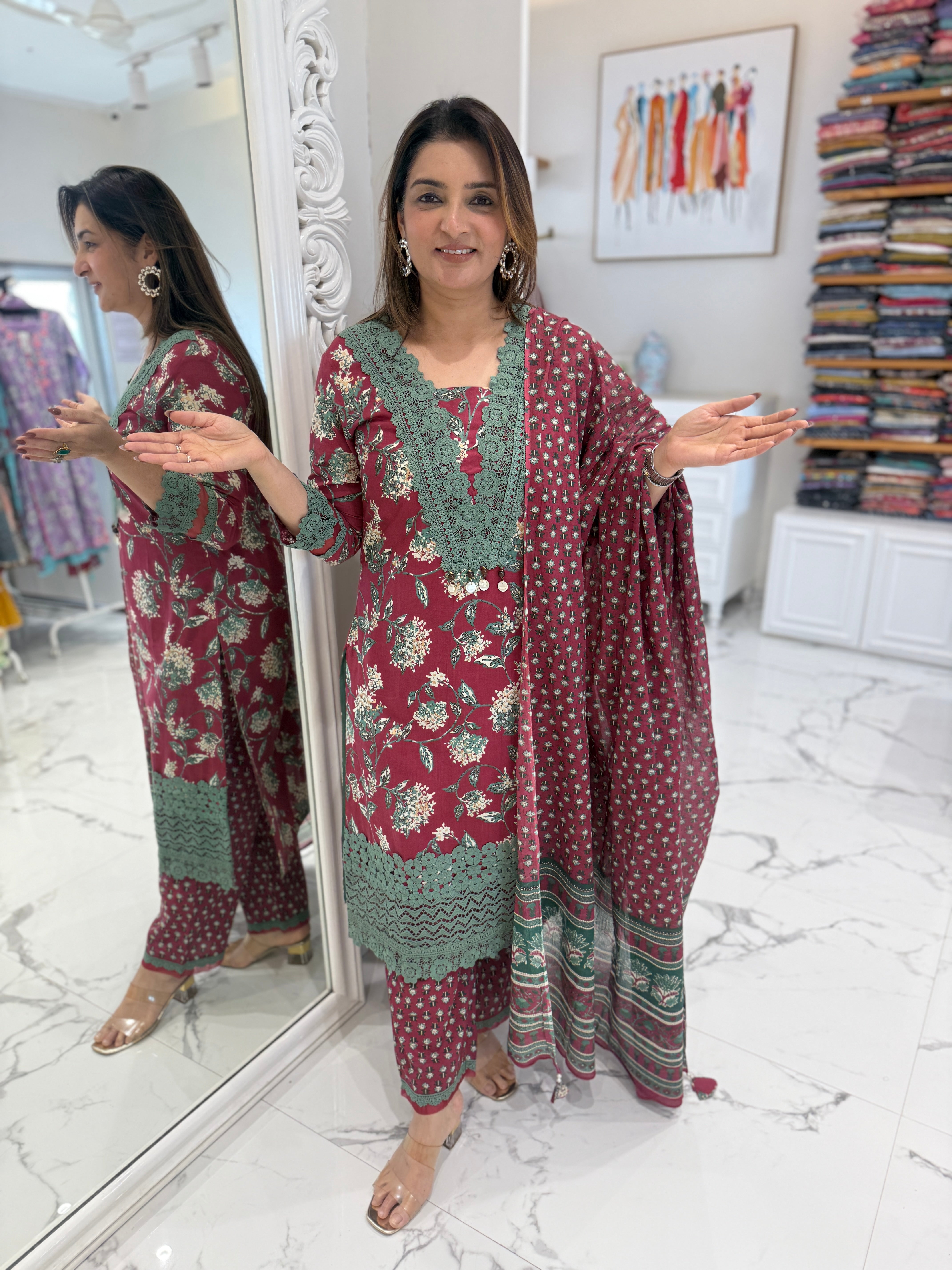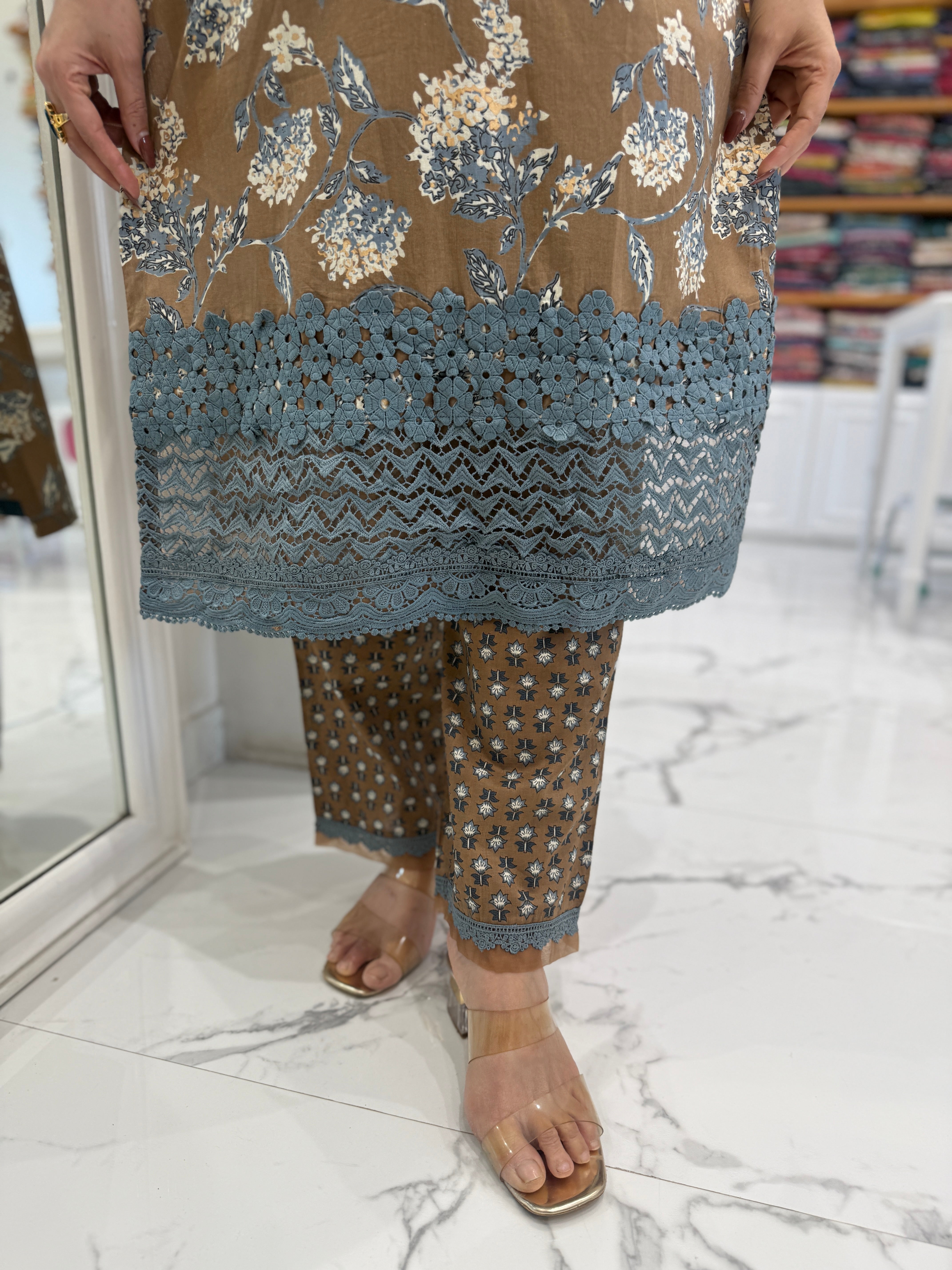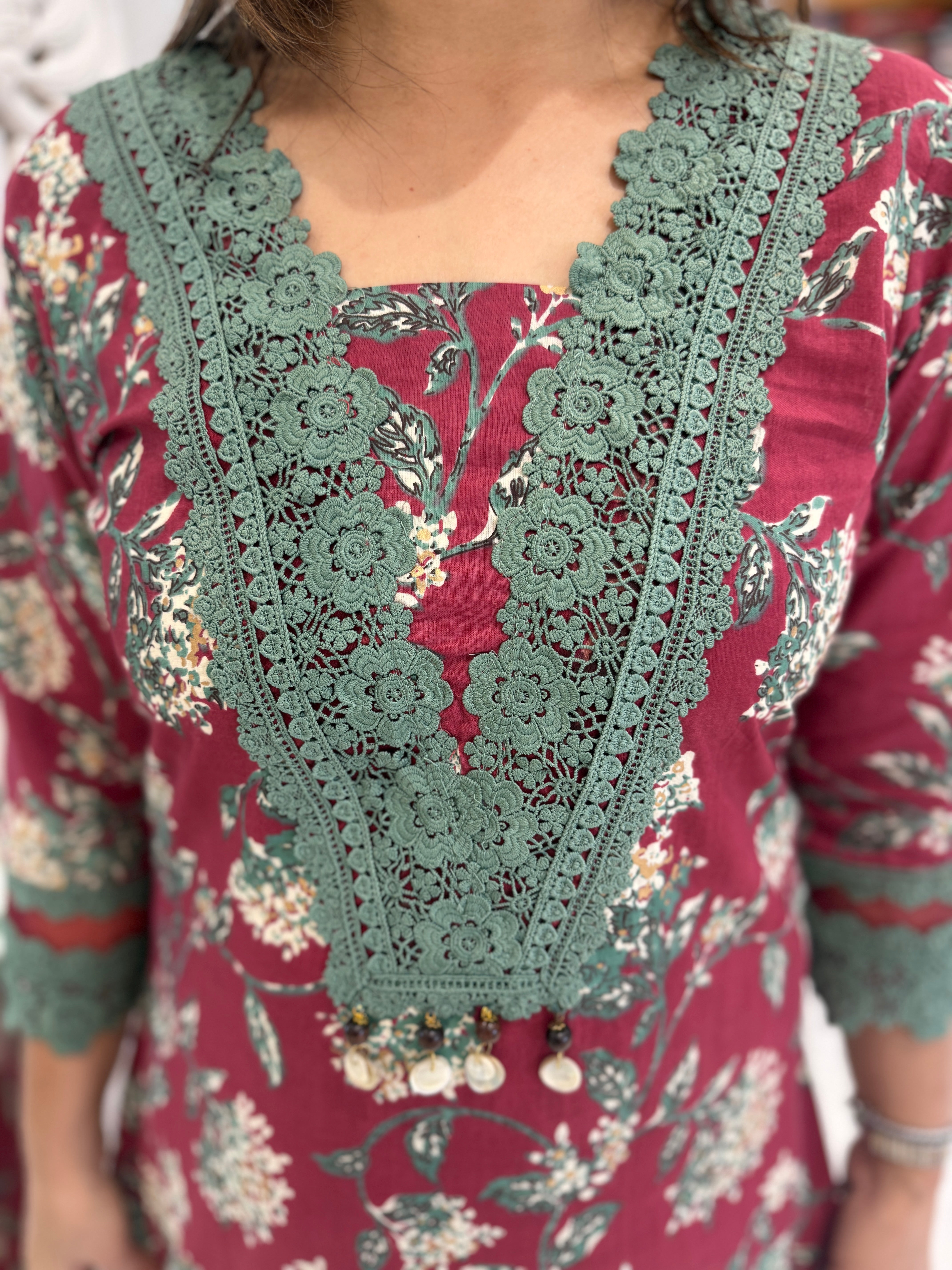 A graceful cotton suit set featuring delicate lace and embroidery on the neckline, paired with lace-detailed straight pants and a soft printed cotton dupatta.