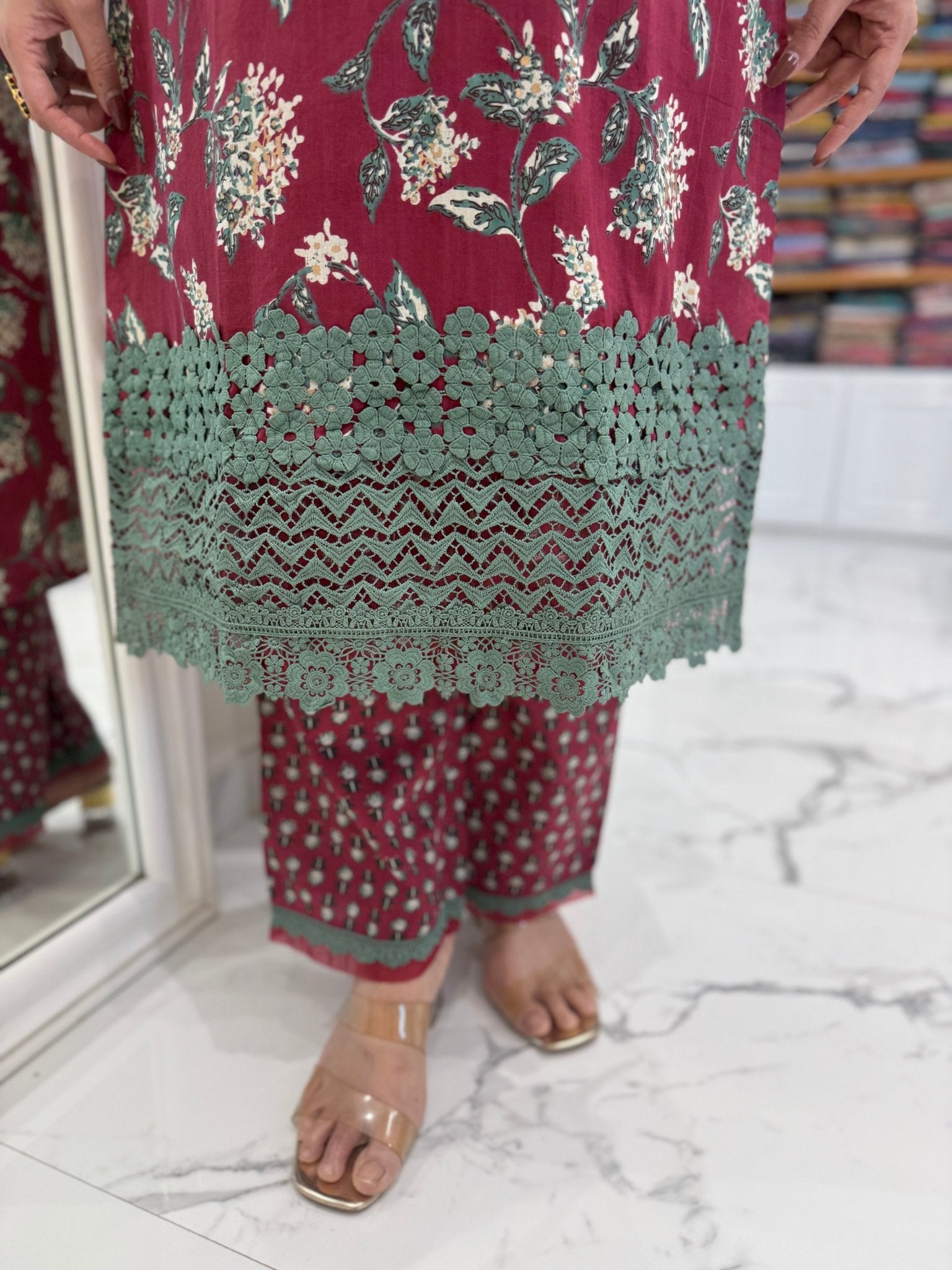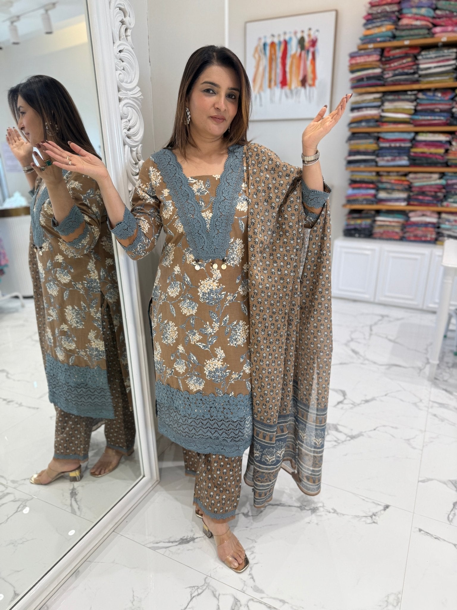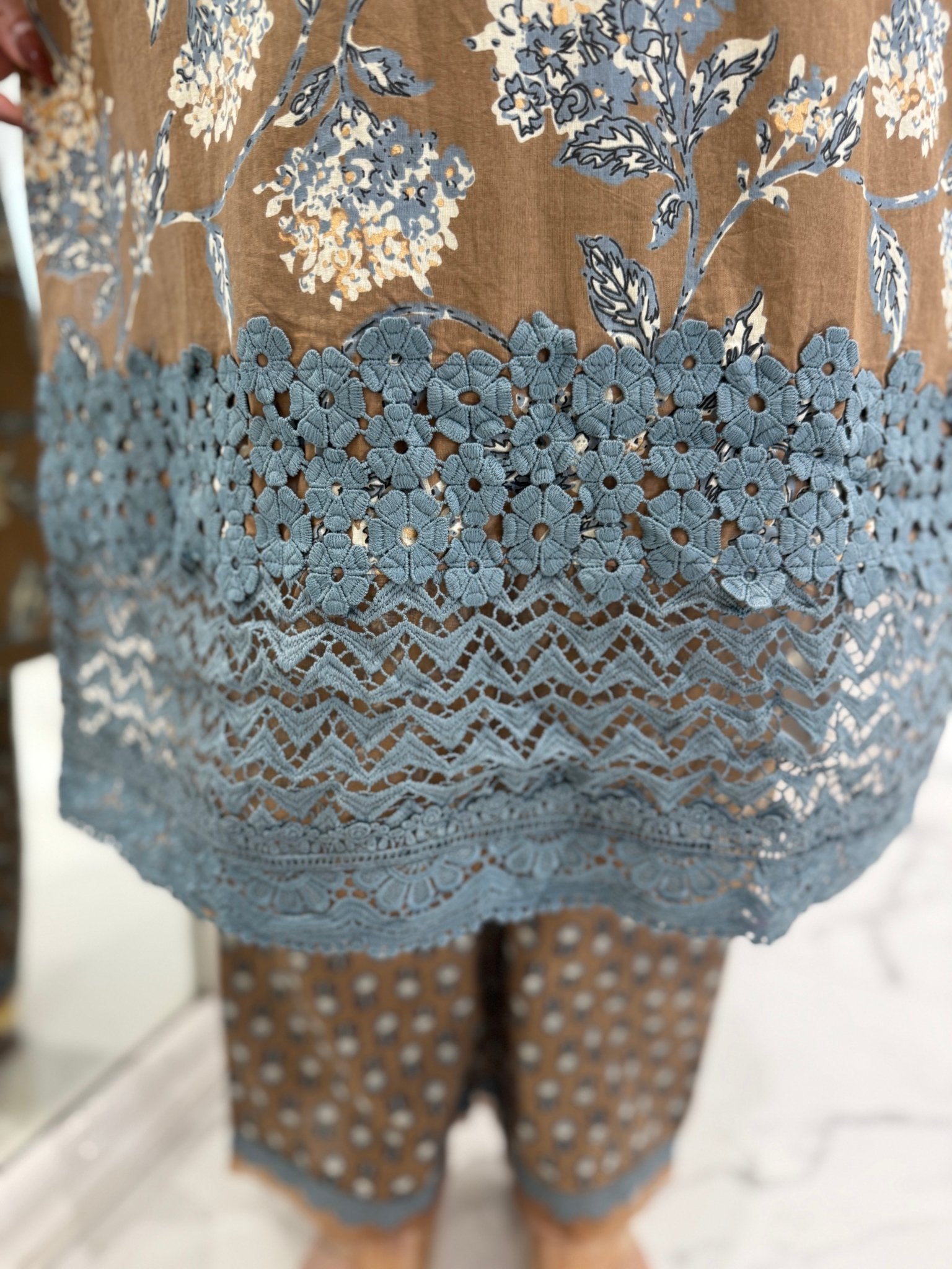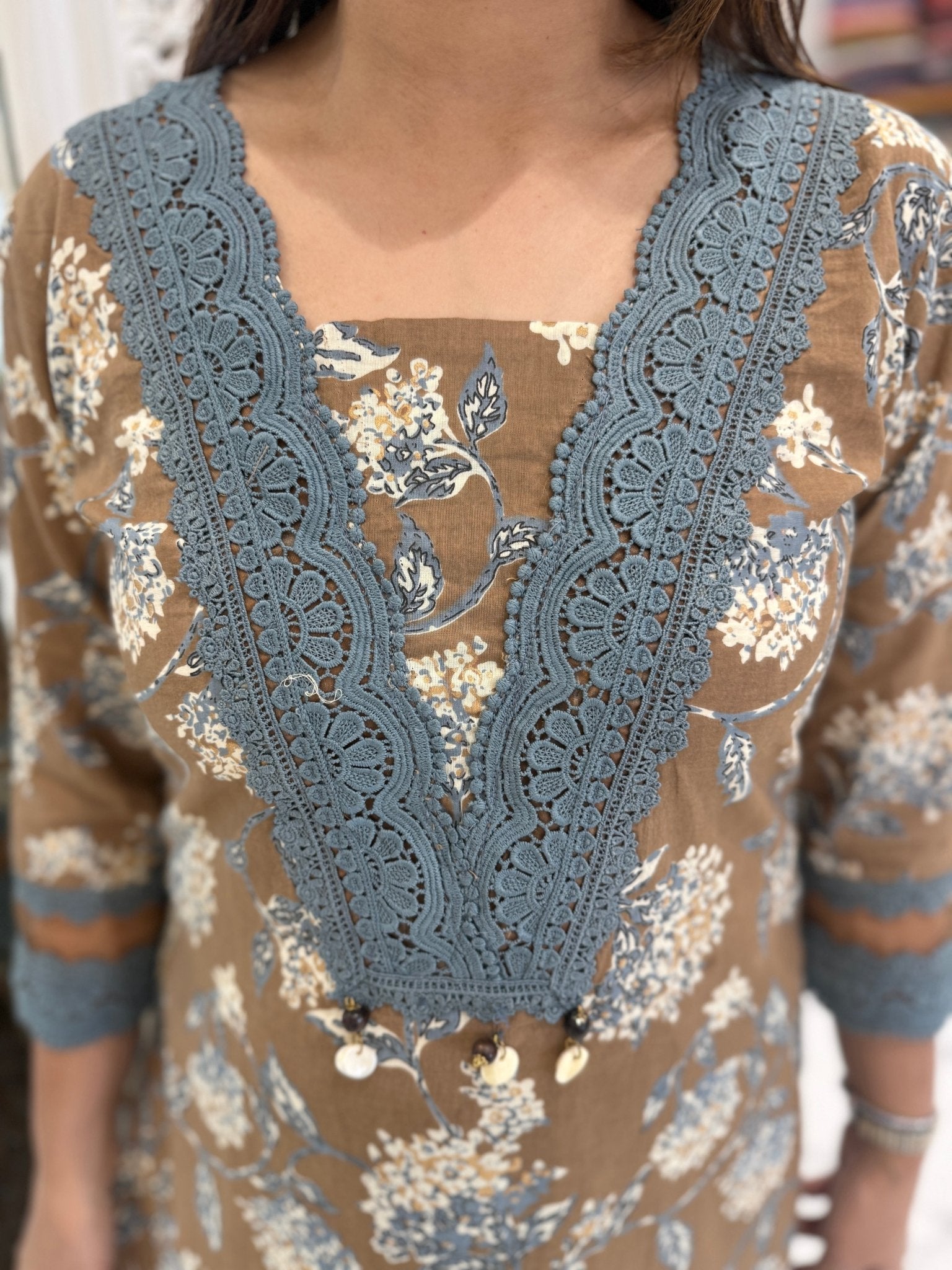 A graceful cotton suit set featuring delicate lace and embroidery on the neckline, paired with lace-detailed straight pants and a soft printed cotton dupatta.