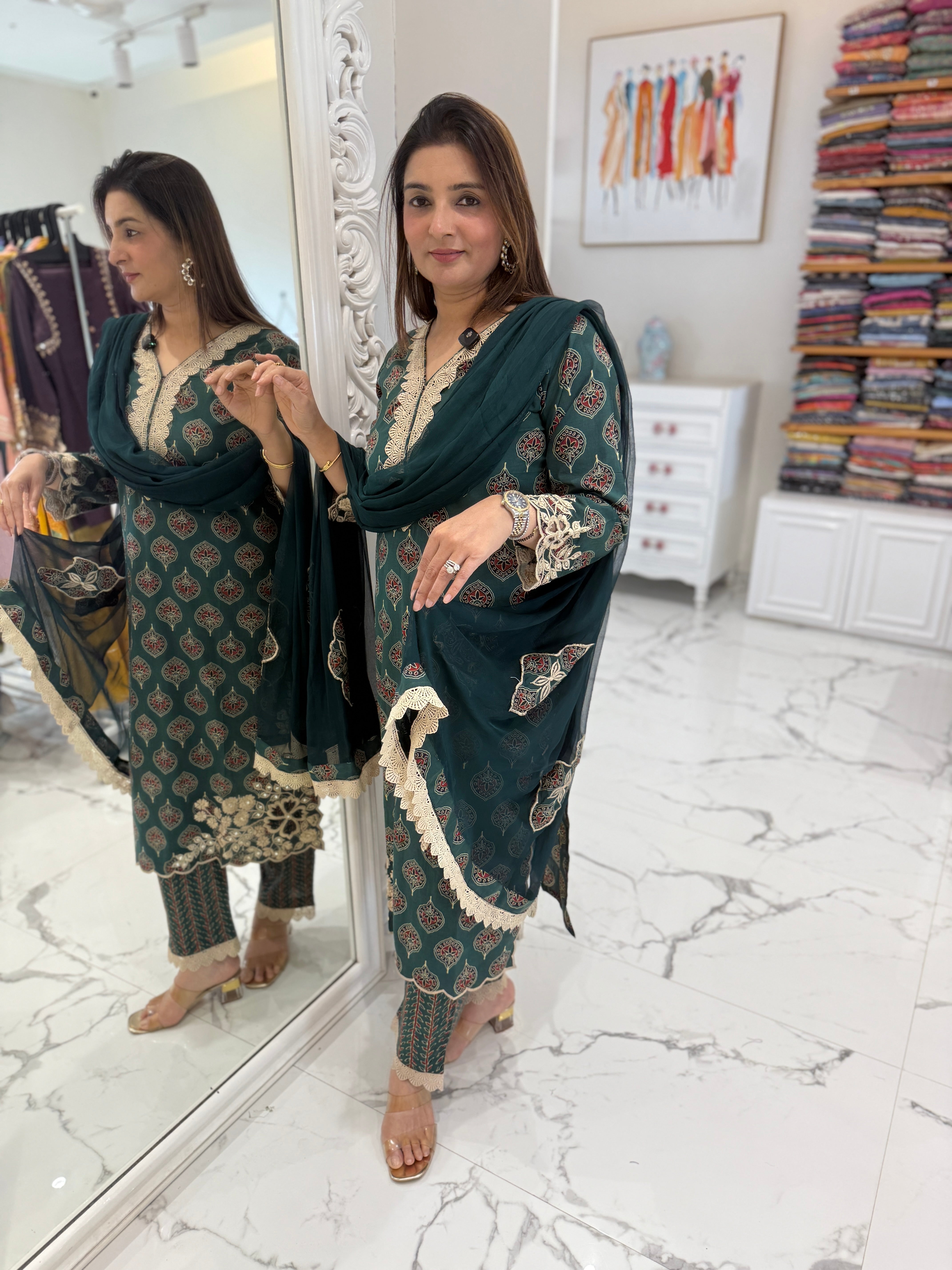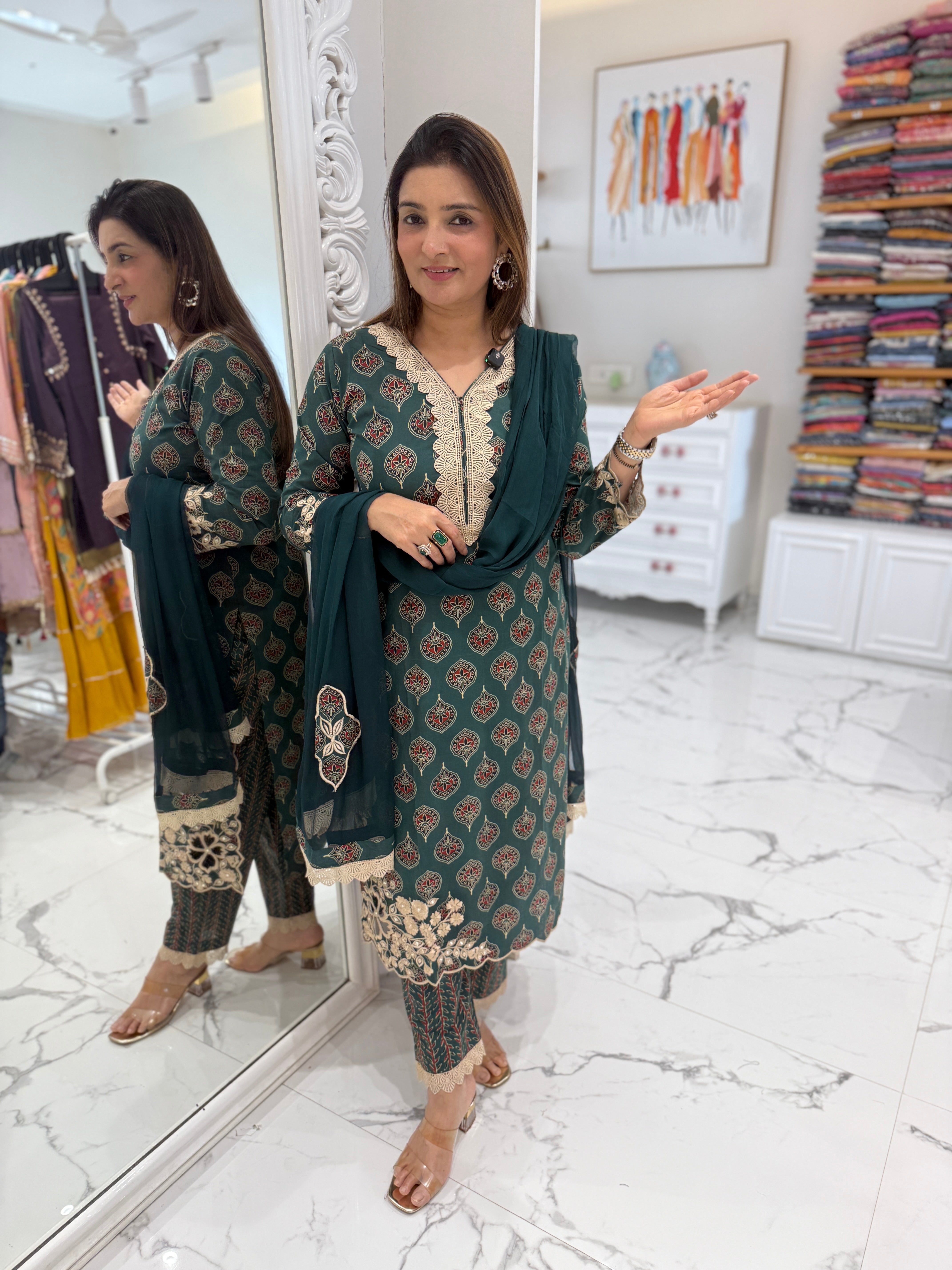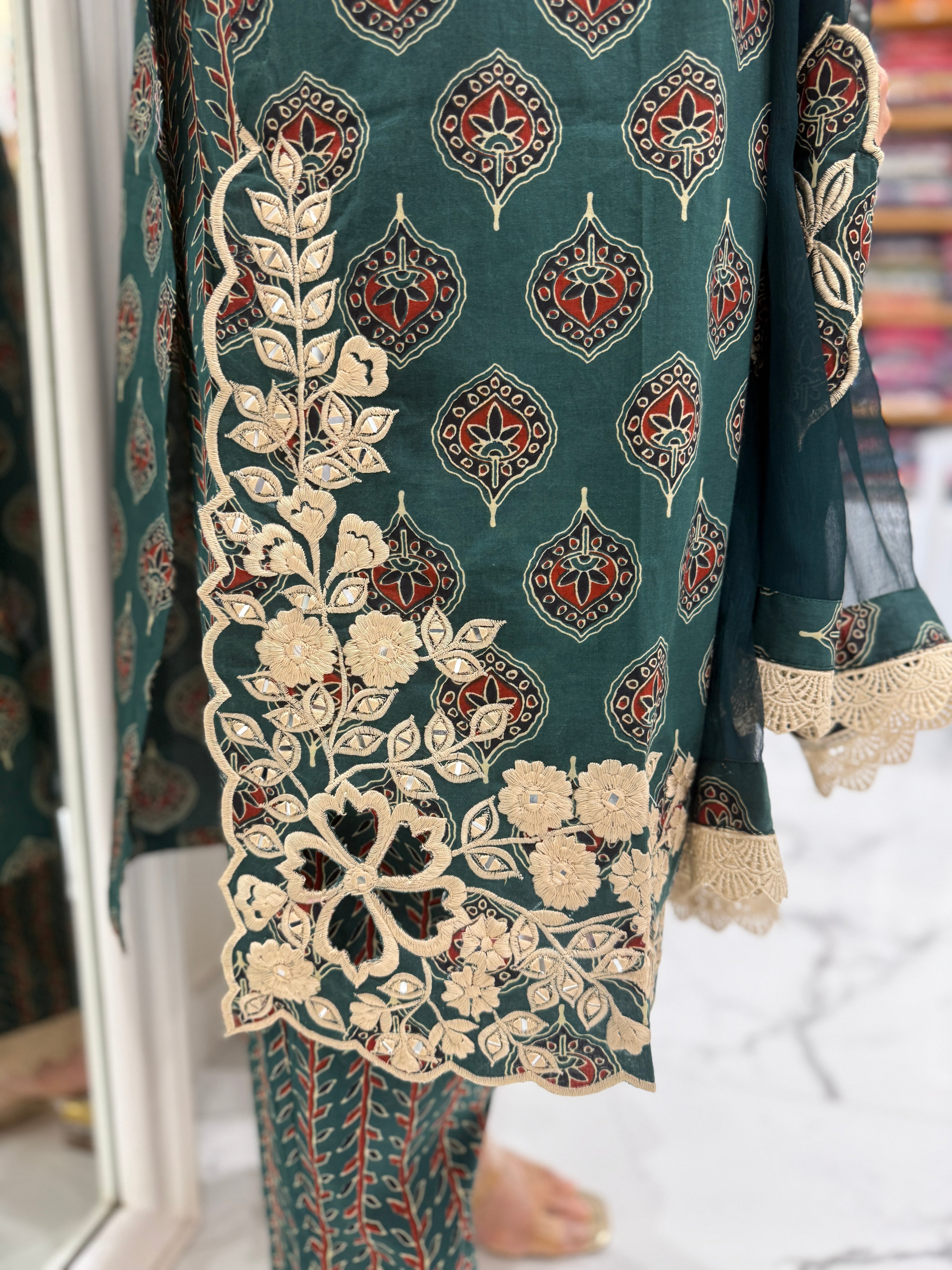 Elegant mul cotton suit set featuring a kalamkari-printed kurta with delicate embroidery and cutwork sleeves, paired with matching pants and a soft chiffon dupatta with patchwork detailing.
