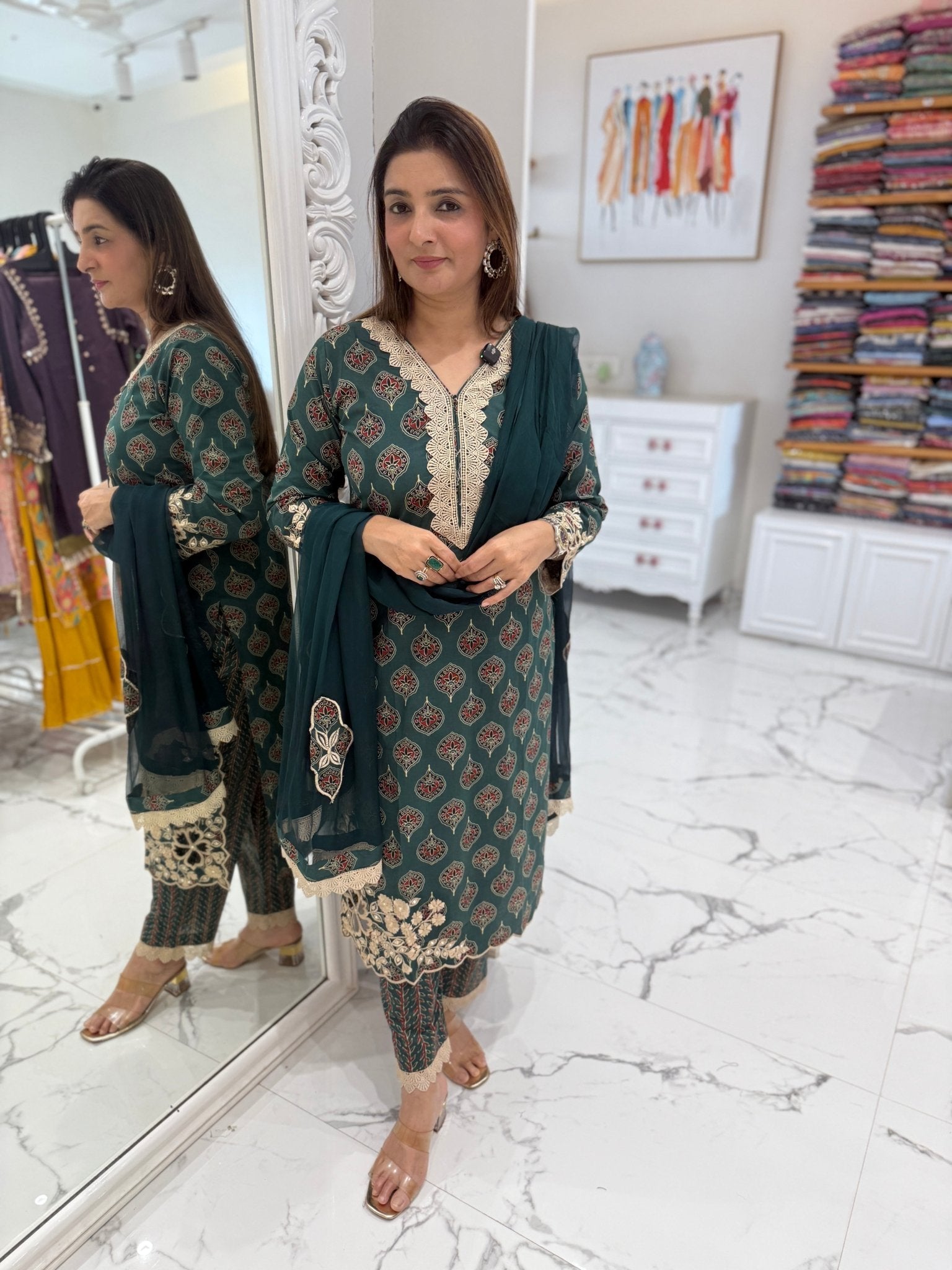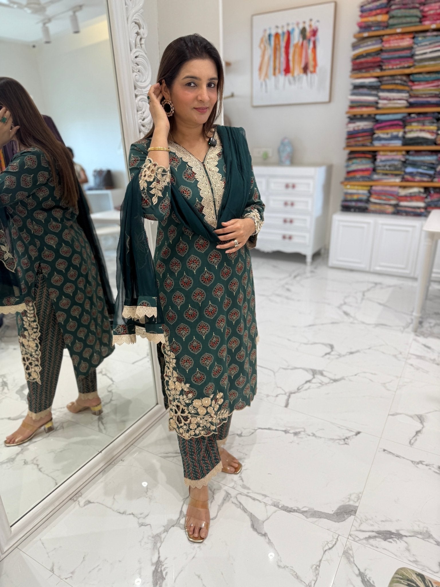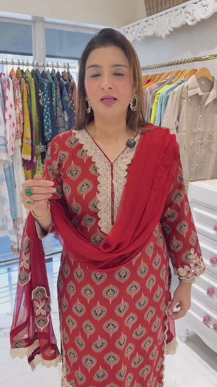 Elegant mul cotton suit set featuring a kalamkari-printed kurta with delicate embroidery and cutwork sleeves, paired with matching pants and a soft chiffon dupatta with patchwork detailing.