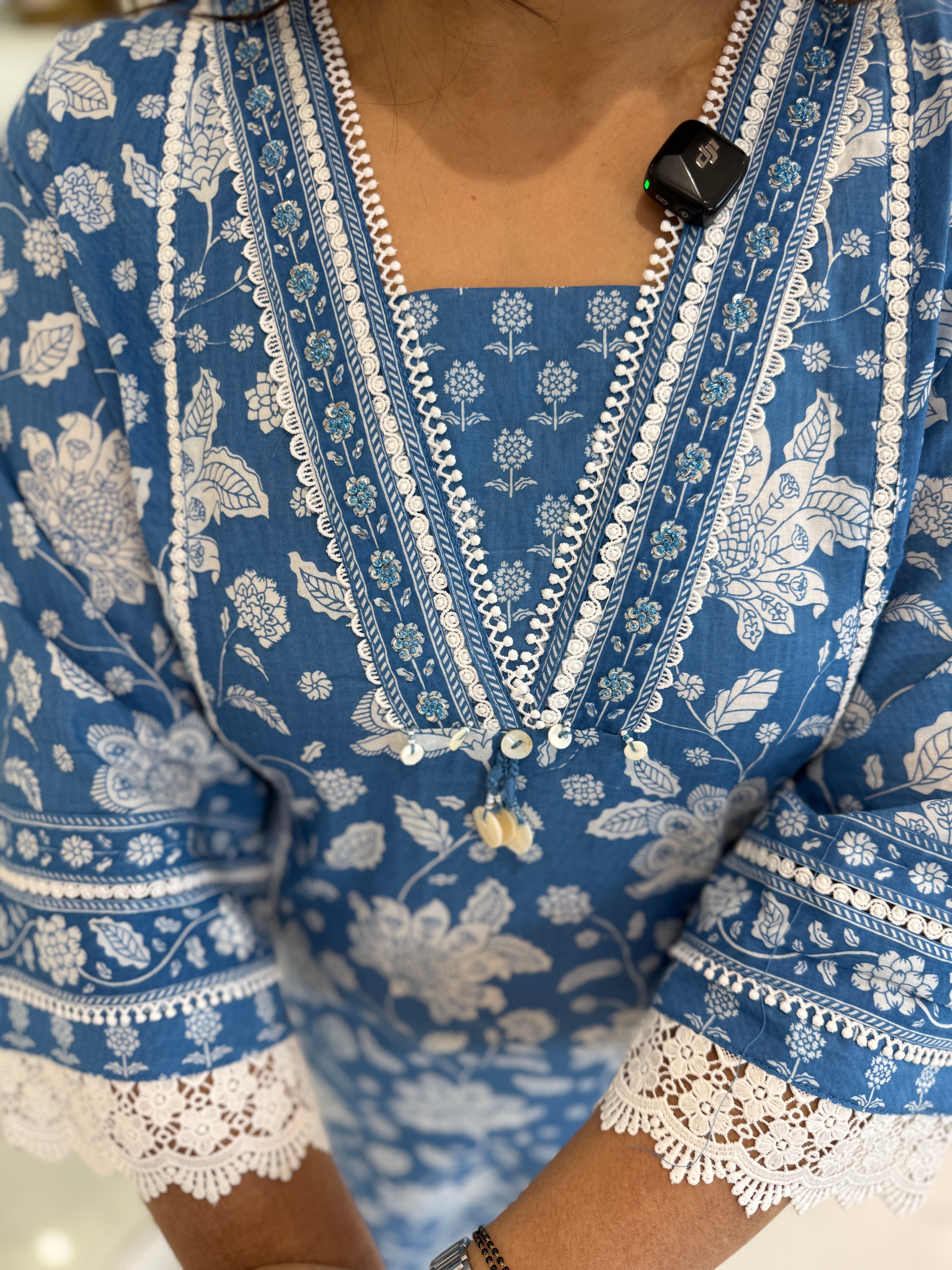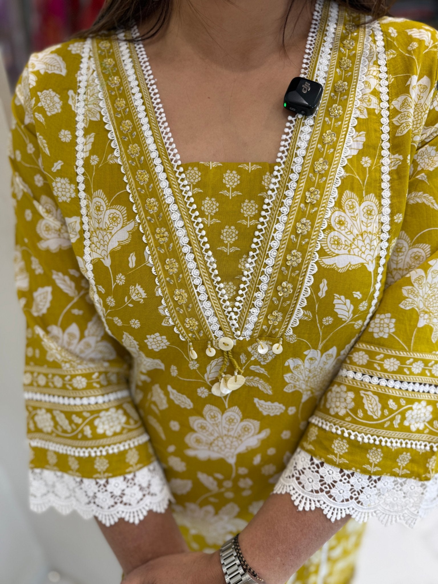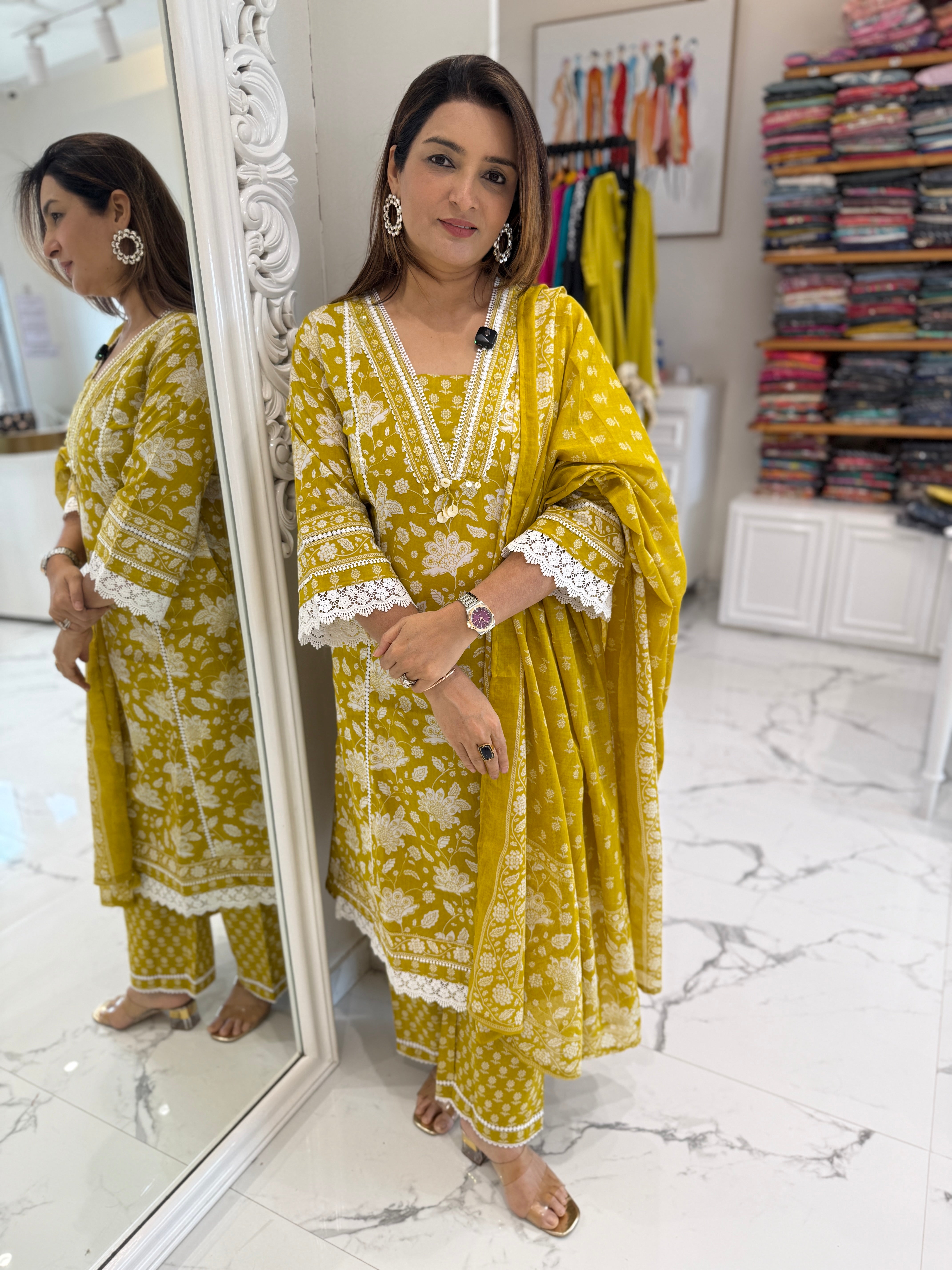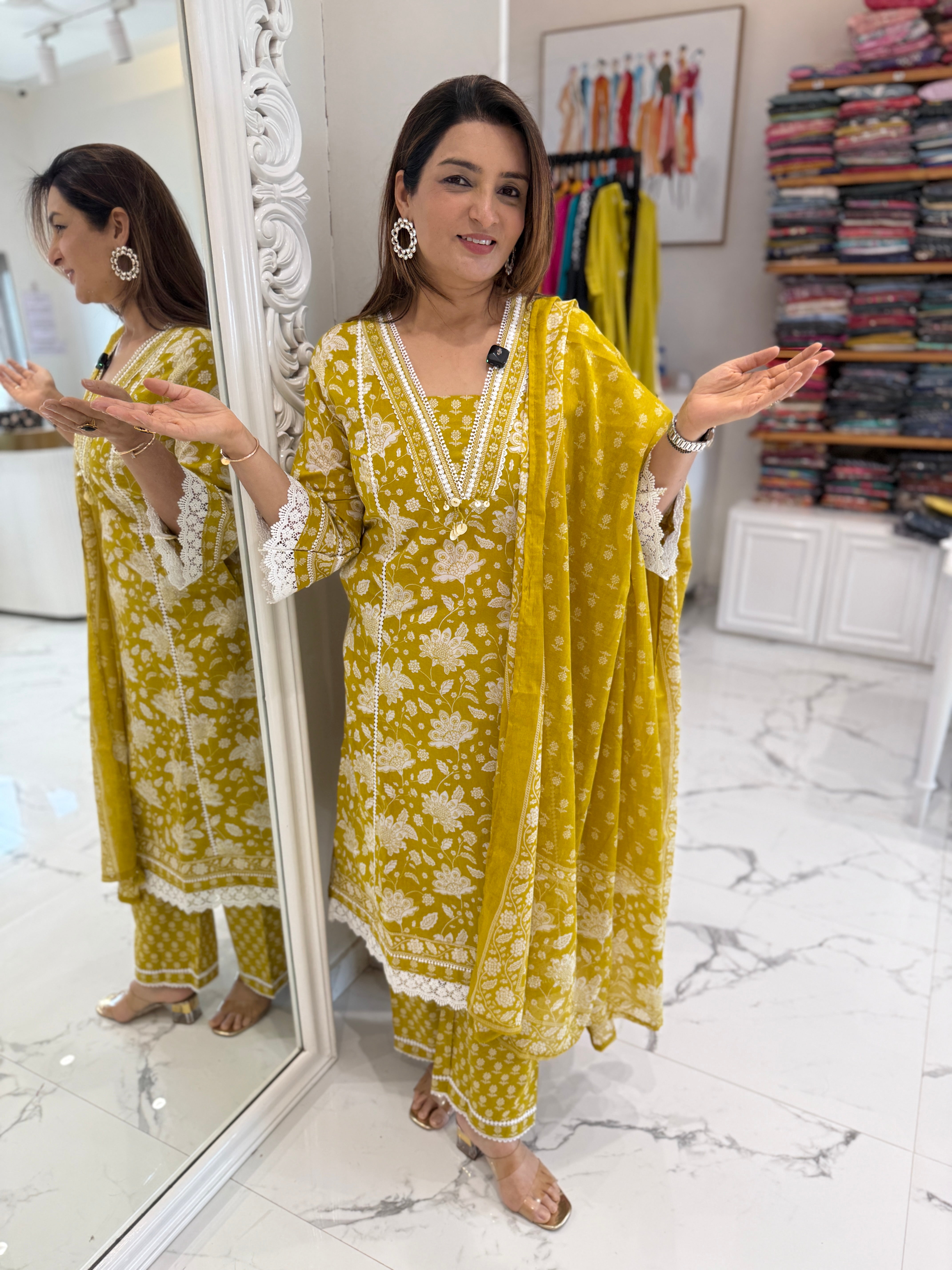 Elevate your style with our Floral Block Print Lace Suit Set. Made of pure cotton, it features intricate work on the neckline and convenient pockets in the kurta. Complete with a fine mul dupatta and comfortable straight pants, this set effortlessly combines style and tradition.
