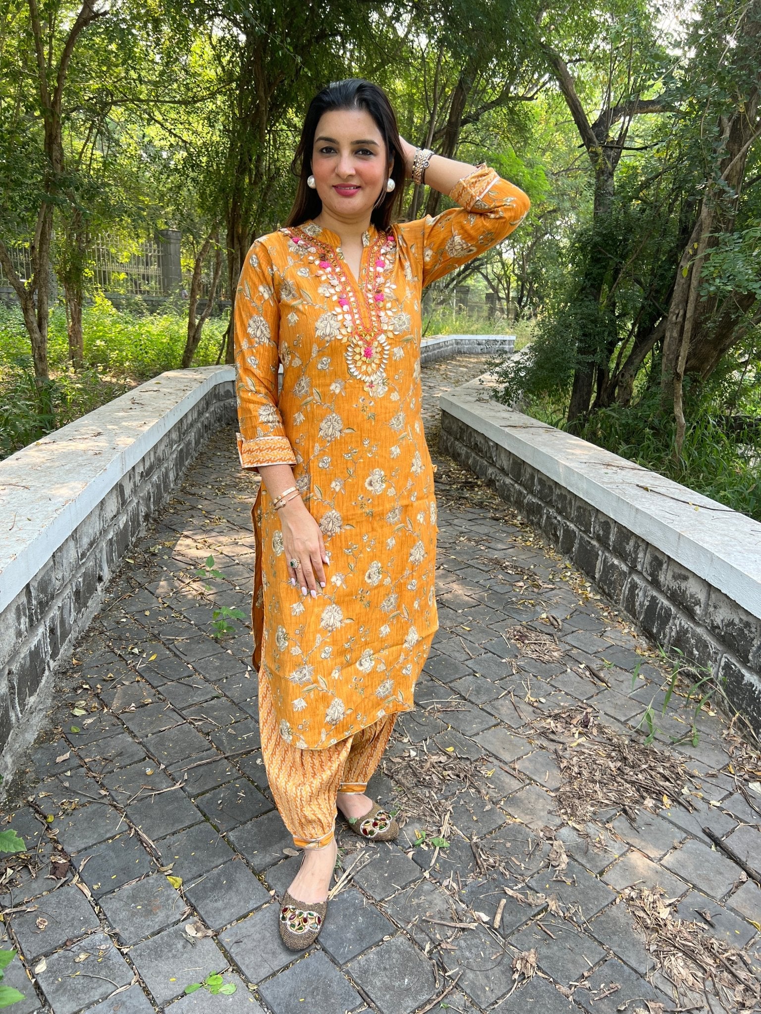 Discover our Pure Modal Silk Afghani Pant Set, offered in captivating Turquoise blue, Rosy red, and Sunflower yellow. The neckline is adorned with striking Gota and Mirror work, elevating its elegance. Adding a distinctive touch, the Afghani pants imbue this casual design with both substance and intricate dynamism, making it a remarkable choice for any occasion.