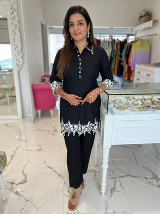 The top features eye-catching cutwork embroidery. This soft-flowing cotton outfit gently drapes over your body. The top is styled with a classic open collar and paired with straight pants, adding a touch of understated elegance to the silhouette.