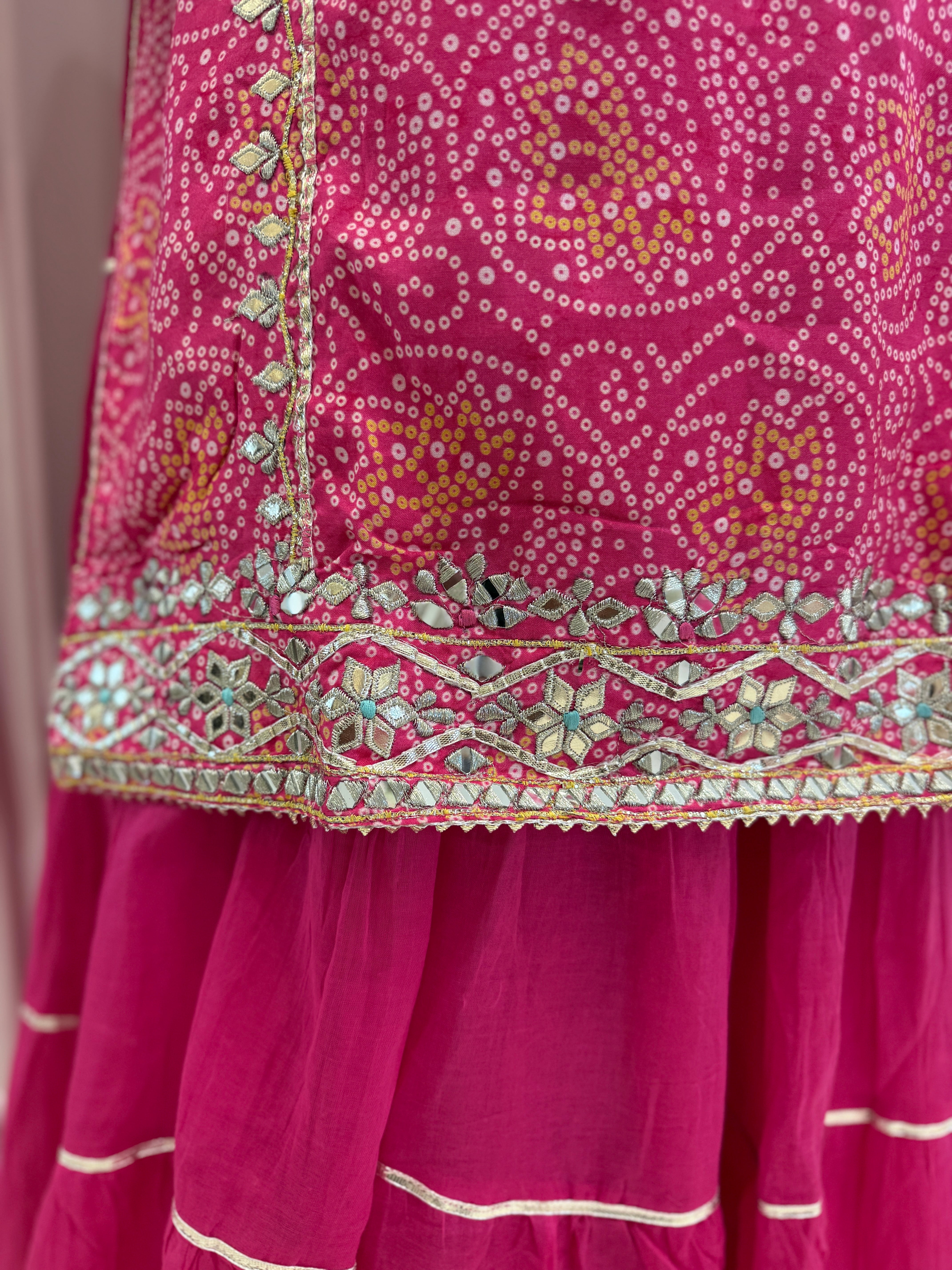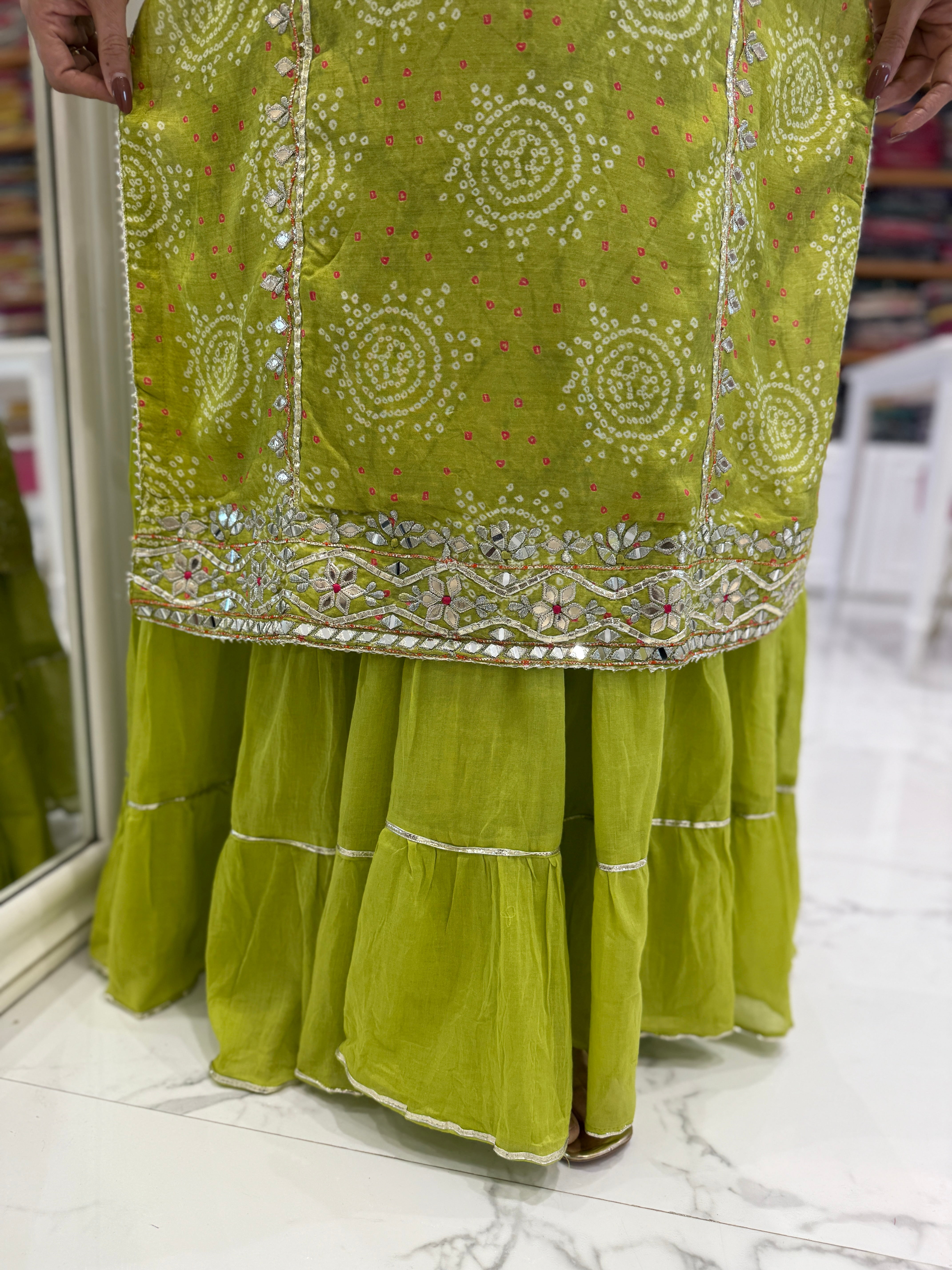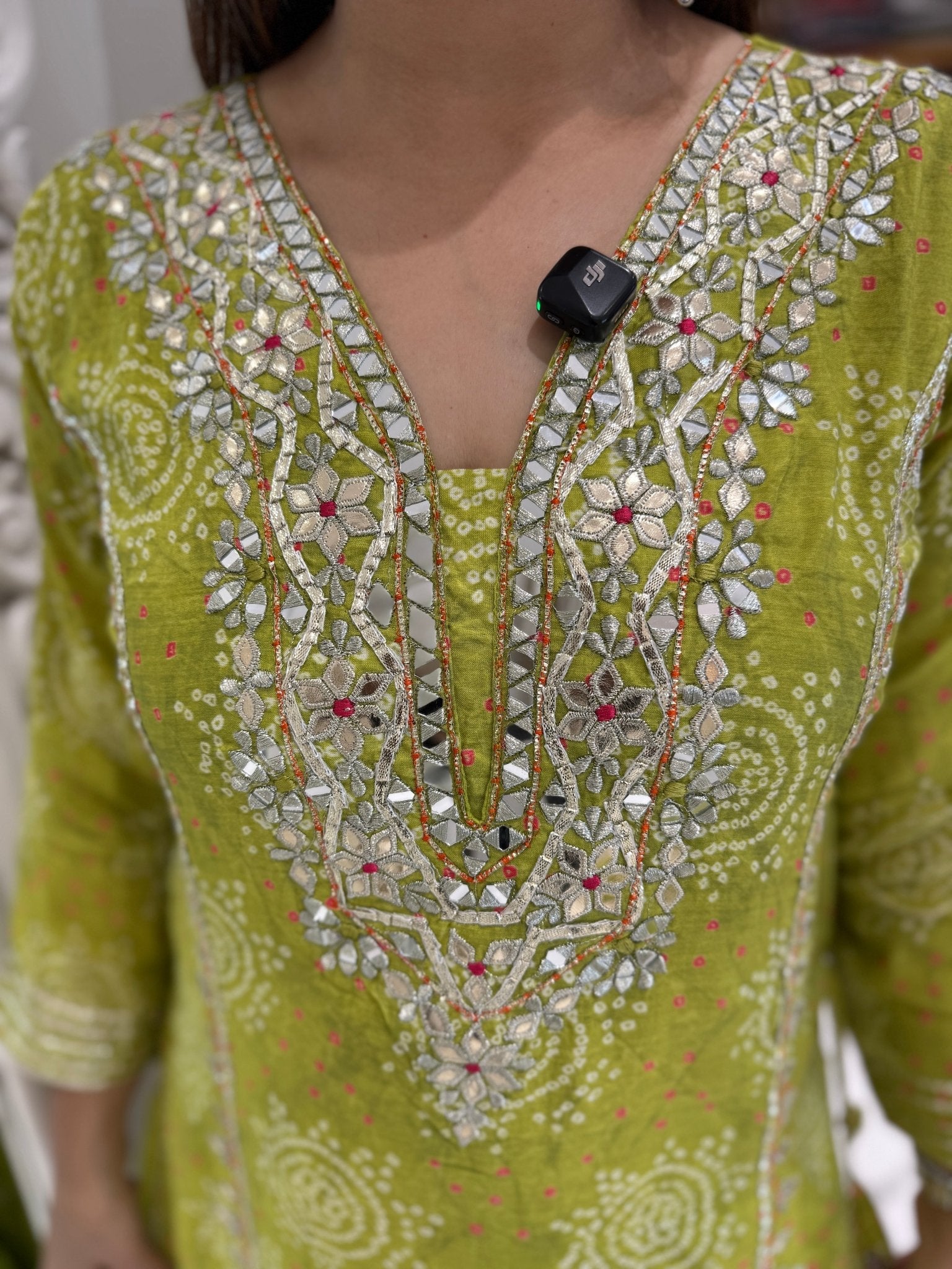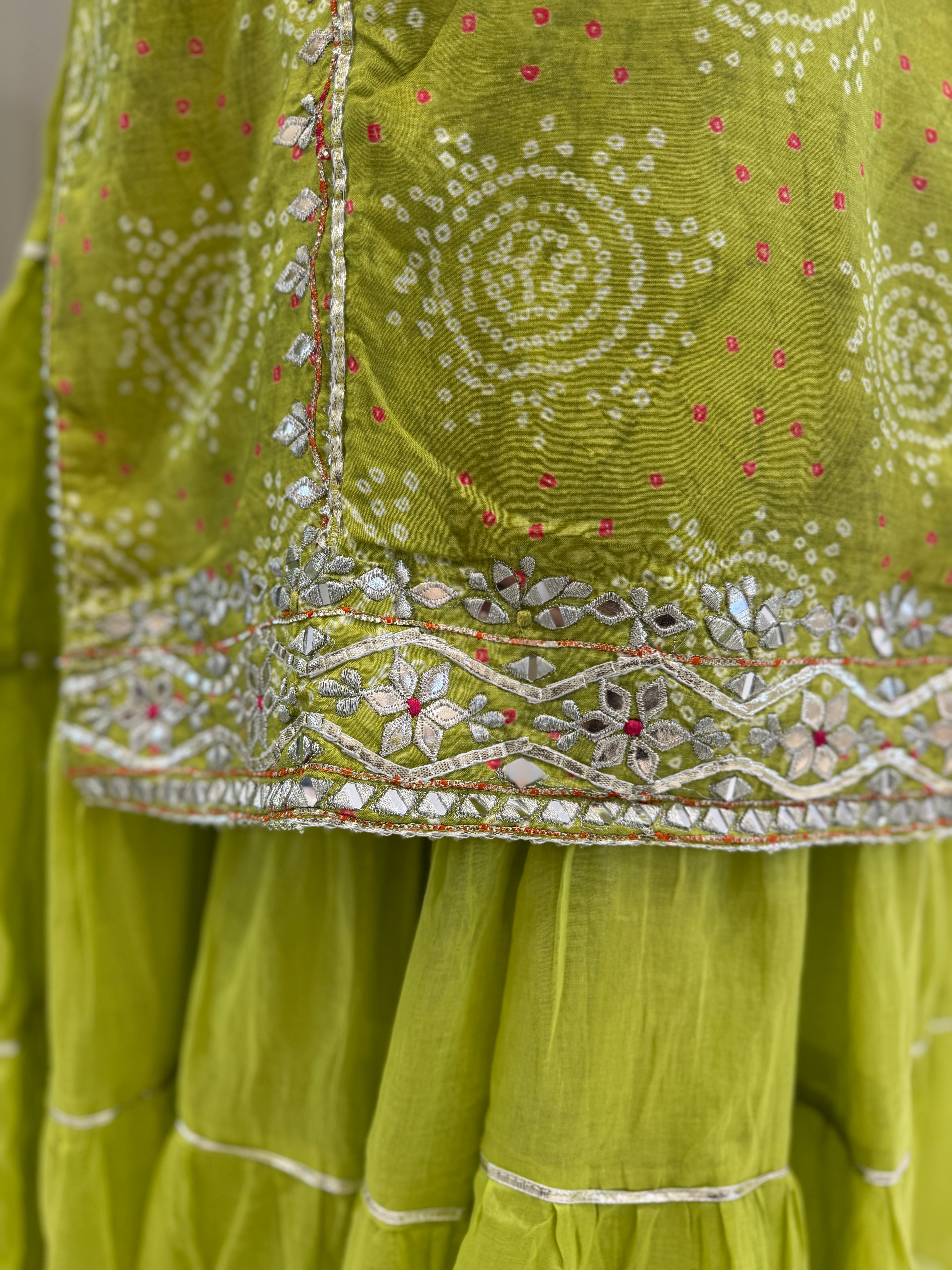 This pure muslin kurta features delicate gota work, leather detailing, and sparkling mirror embellishments. The soft cotton inner skirt is finished with gota patti, leather appliqué, and mirror accents on the cuffs and hem. A lightweight chiffon dupatta completes the elegant look.