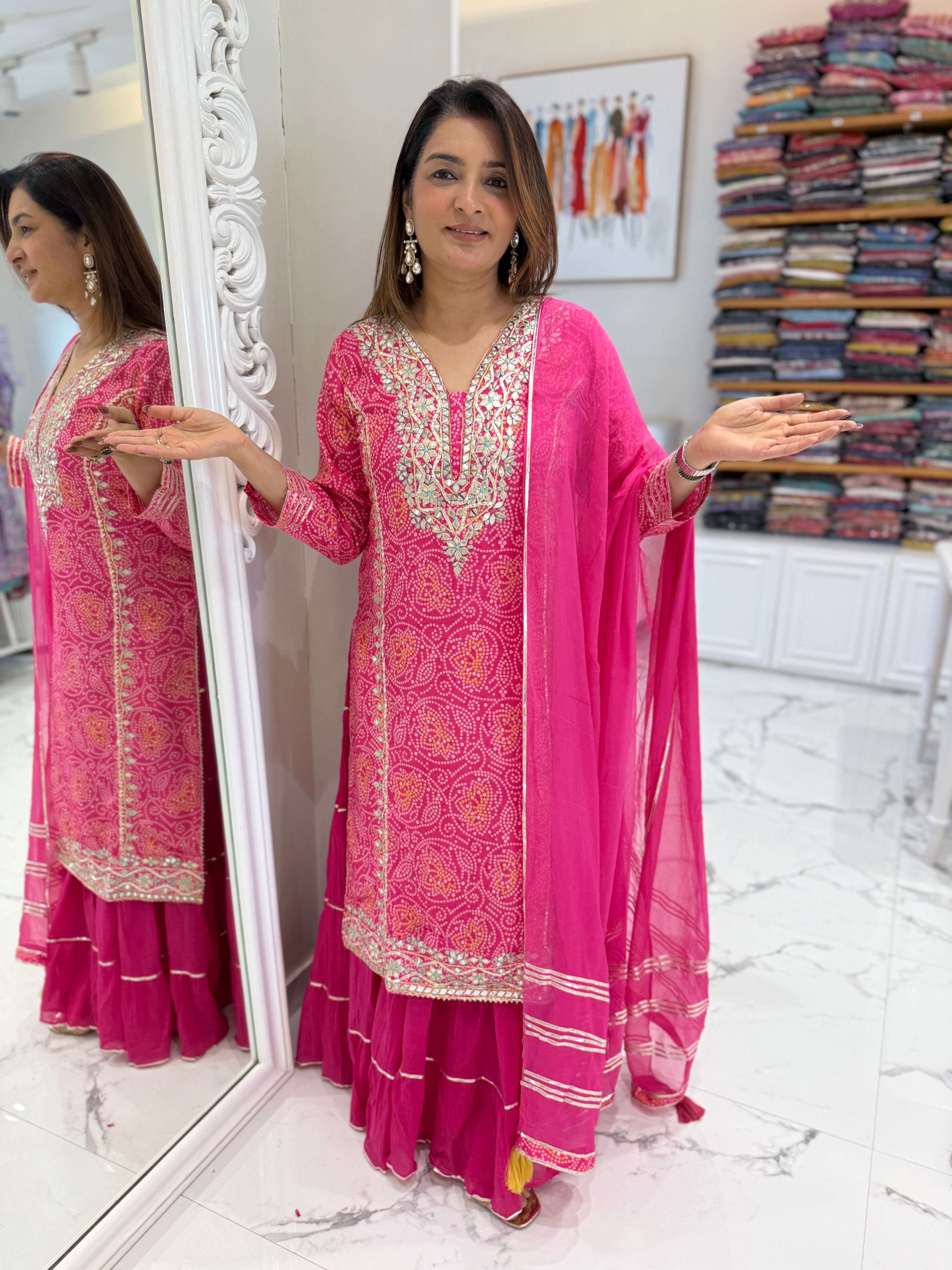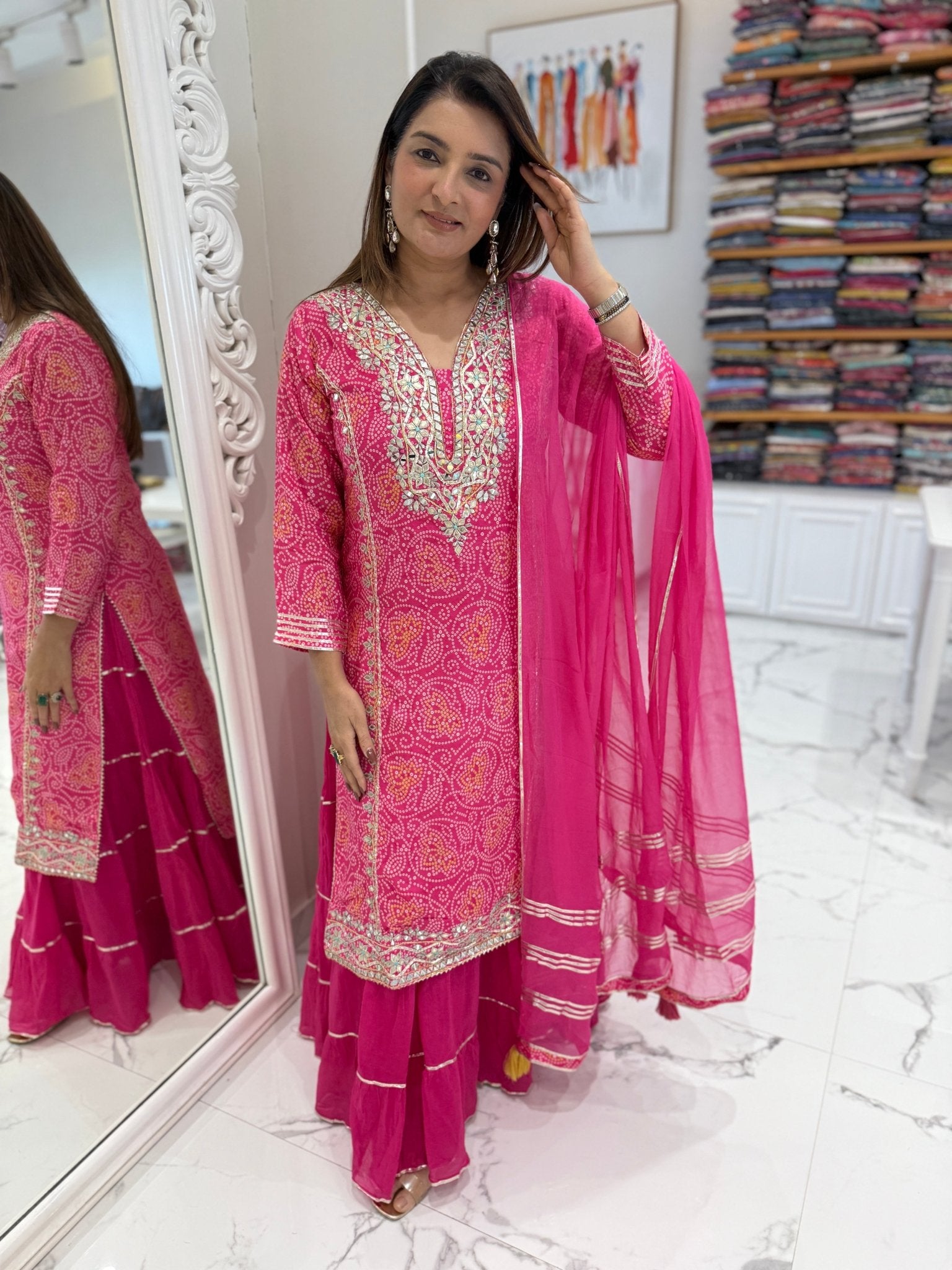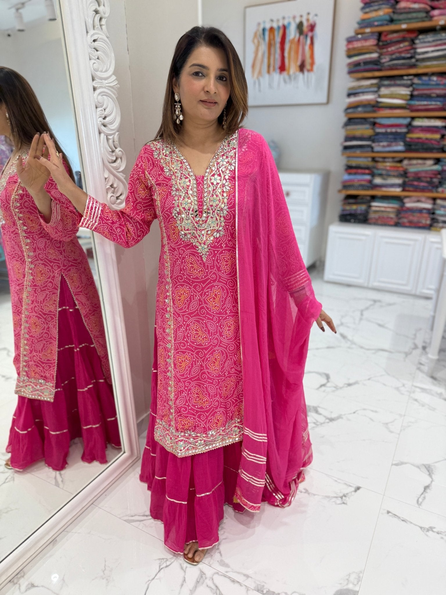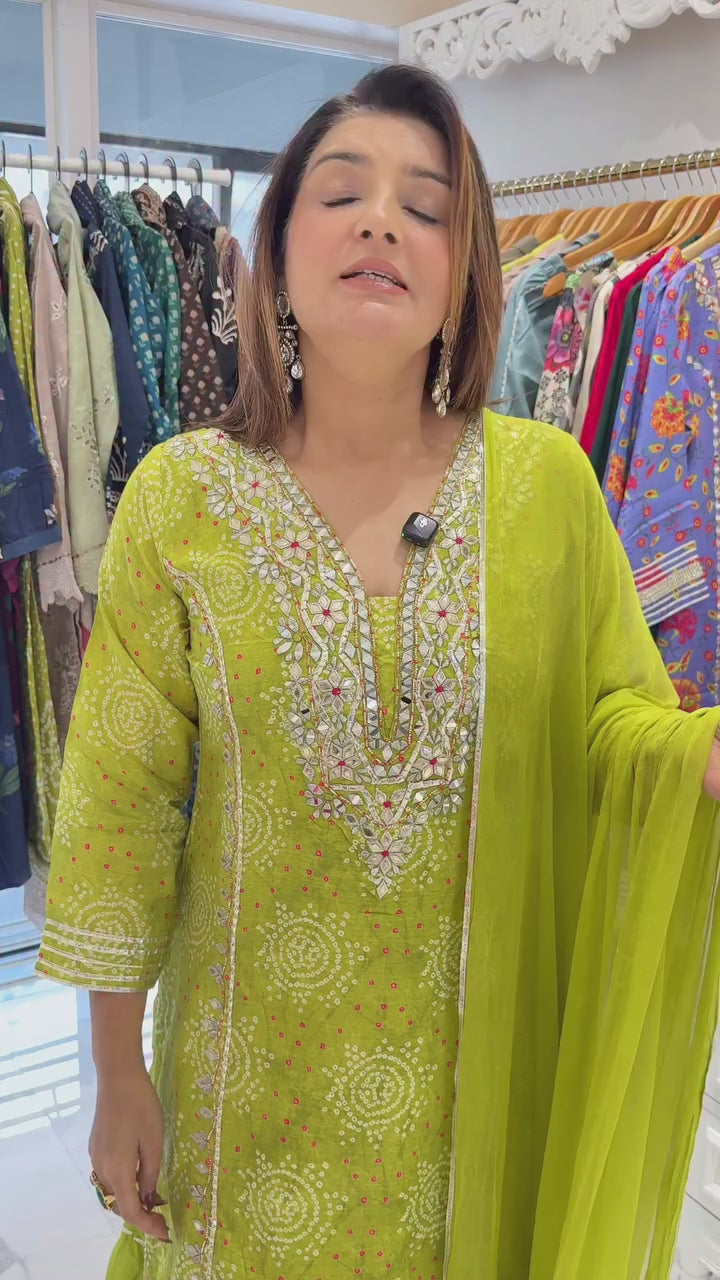 This pure muslin kurta features delicate gota work, leather detailing, and sparkling mirror embellishments. The soft cotton inner skirt is finished with gota patti, leather appliqué, and mirror accents on the cuffs and hem. A lightweight chiffon dupatta completes the elegant look.